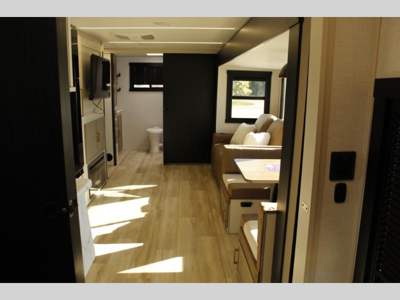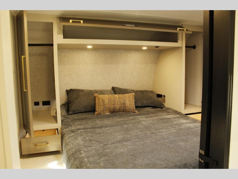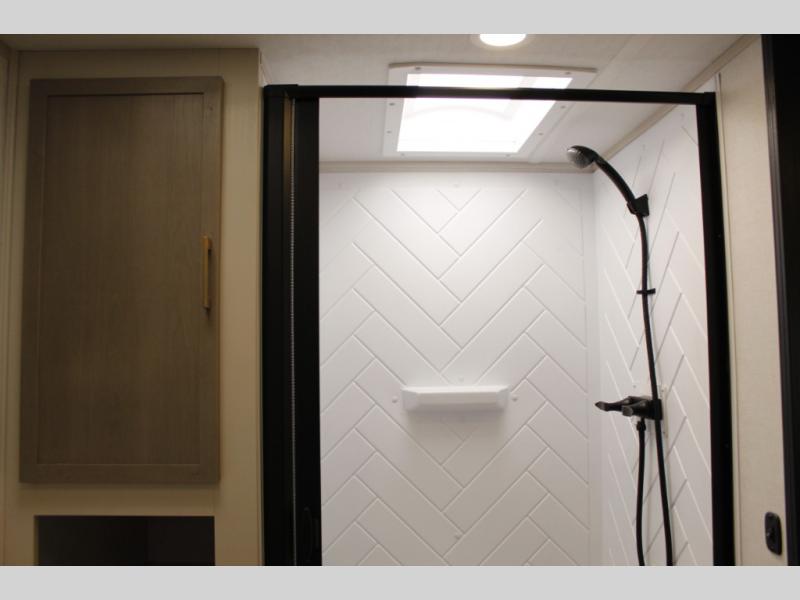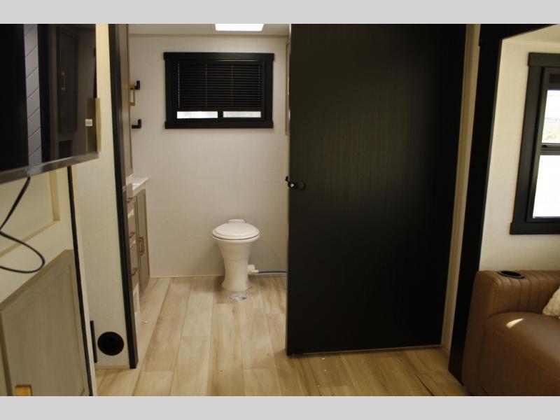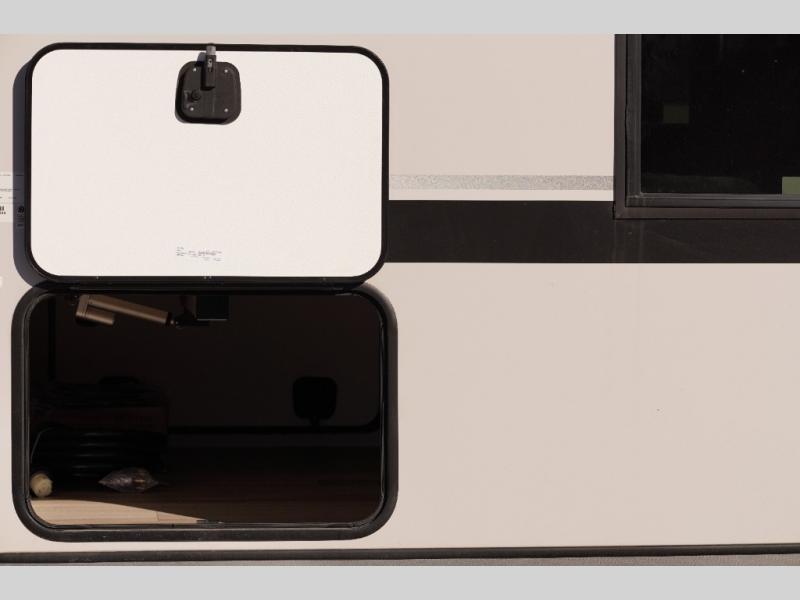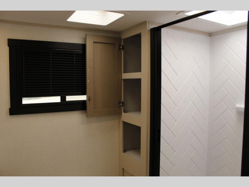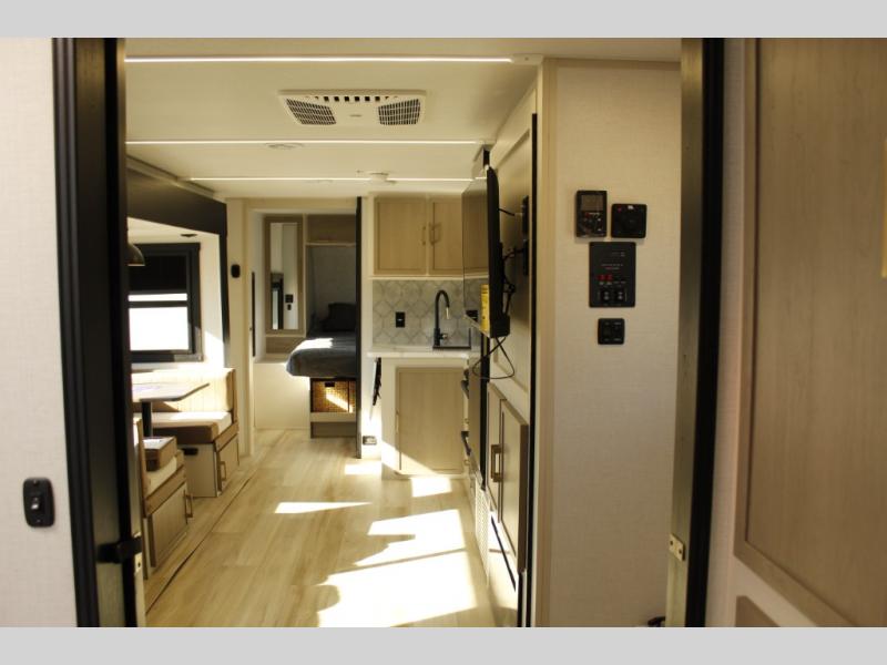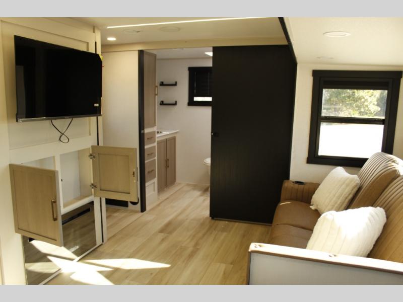 Whether it's a couples night or family night, you can enjoy the spacious living and kitchen area thanks to the large slide out. Grab your favorite snacks from the hidden storage behind the swing-open entertainment center and head to the booth dinette and/or the theater seats with cupholders. You will be able to easily whip up your best meals and clean up even easier with the L-shaped countertop with an extension. The front private bedroom features a queen bed with Versa Tilt to get a good night's rest with wardrobes on either side to keep the room tidy, and the rear bathroom is spacious with a sliding door and two linen closets!