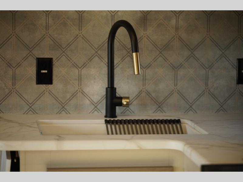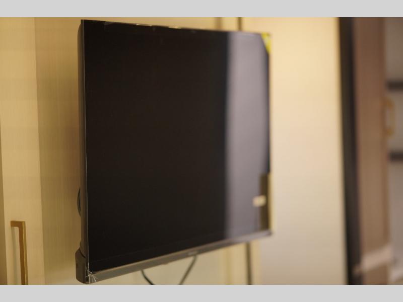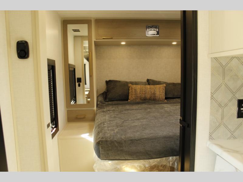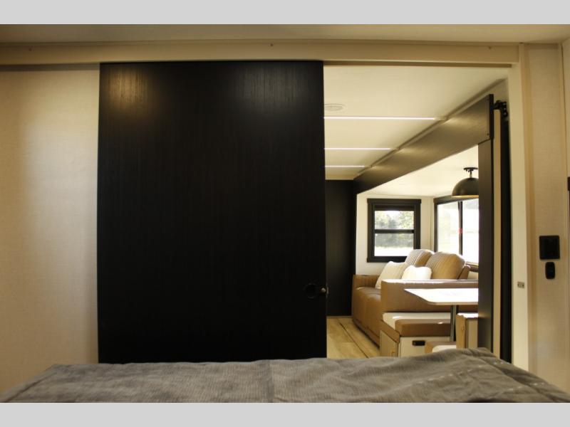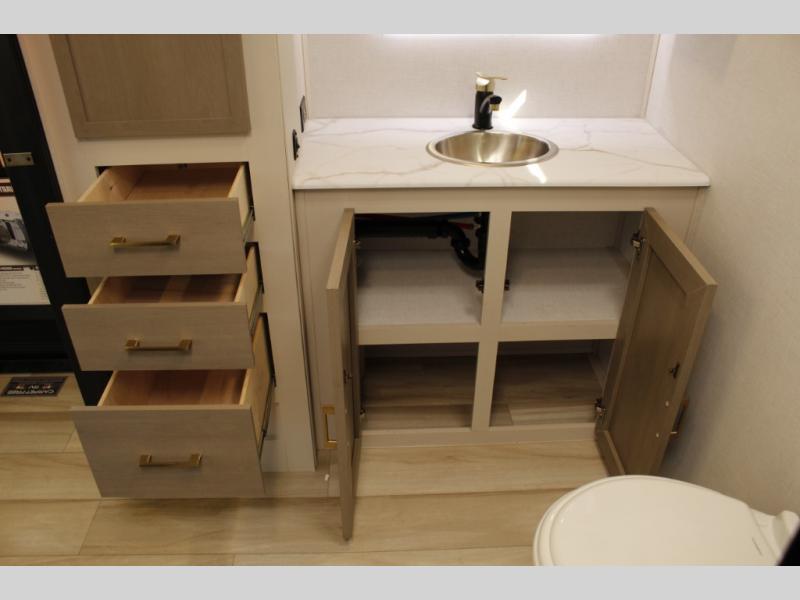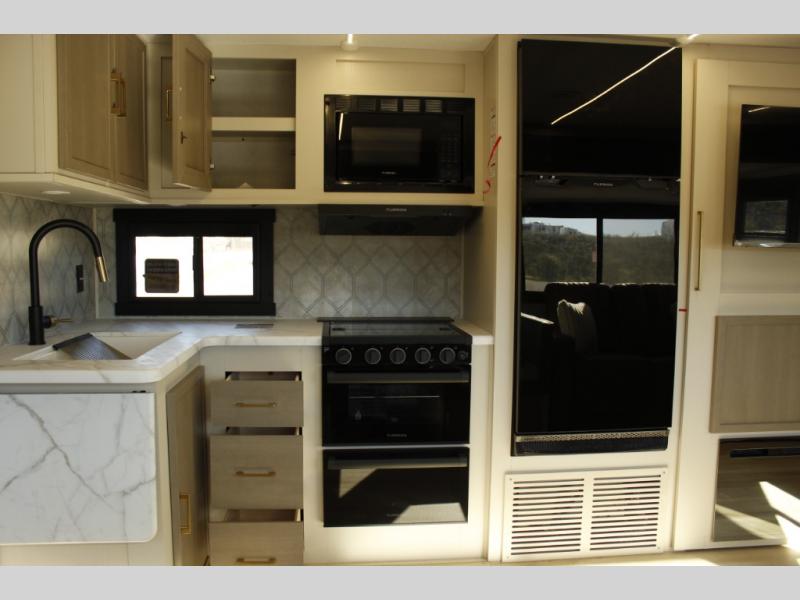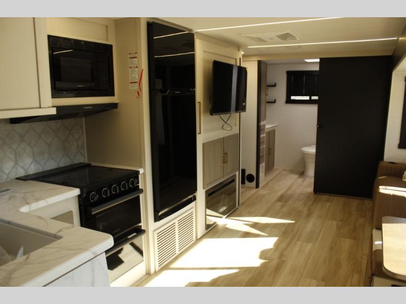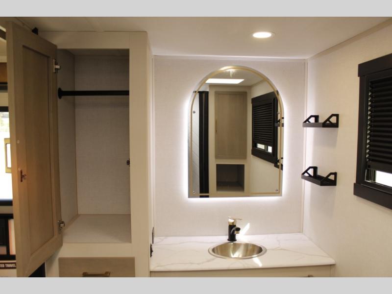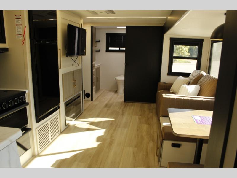 Whether it's a couples night or family night, you can enjoy the spacious living and kitchen area thanks to the large slide out. Grab your favorite snacks from the hidden storage behind the swing-open entertainment center and head to the booth dinette and/or the theater seats with cupholders. You will be able to easily whip up your best meals and clean up even easier with the L-shaped countertop with an extension. The front private bedroom features a queen bed with Versa Tilt to get a good night's rest with wardrobes on either side to keep the room tidy, and the rear bathroom is spacious with a sliding door and two linen closets!