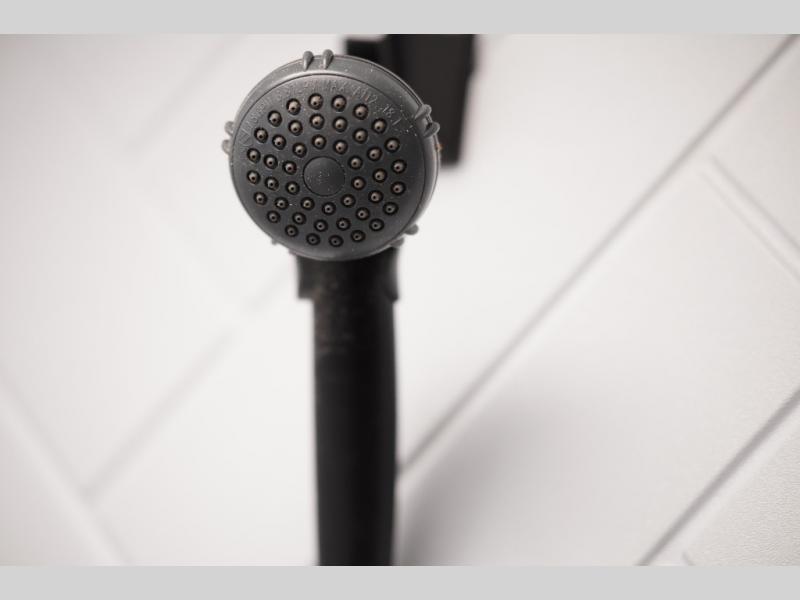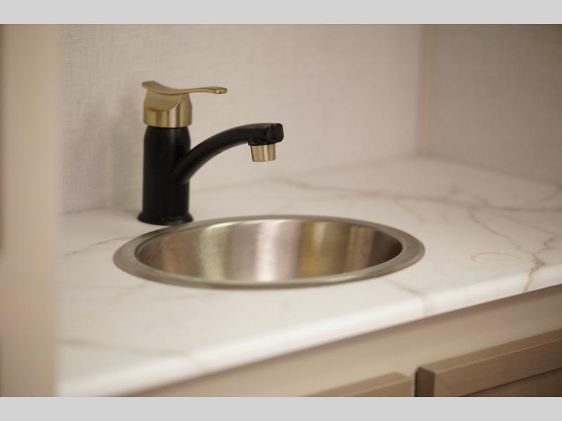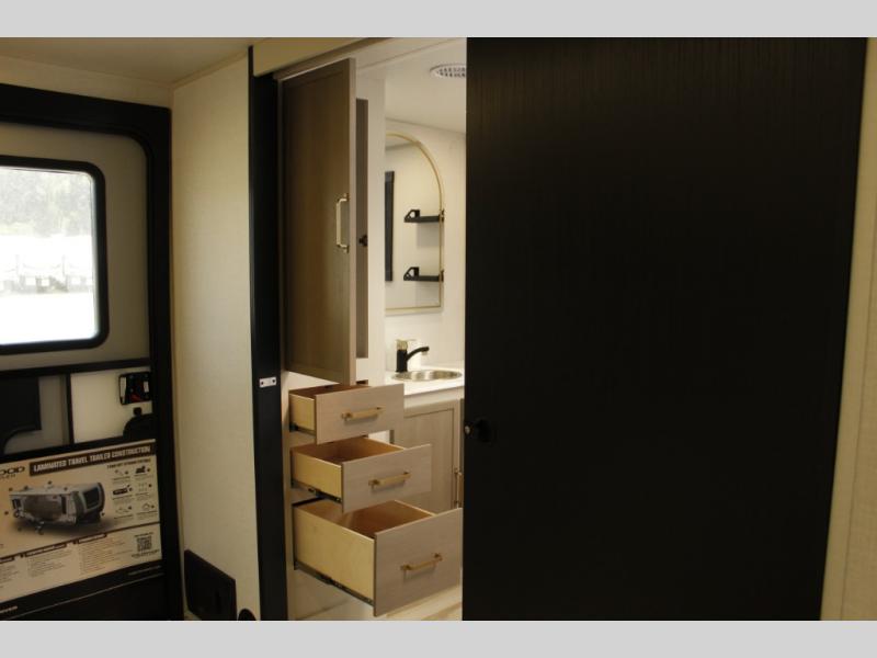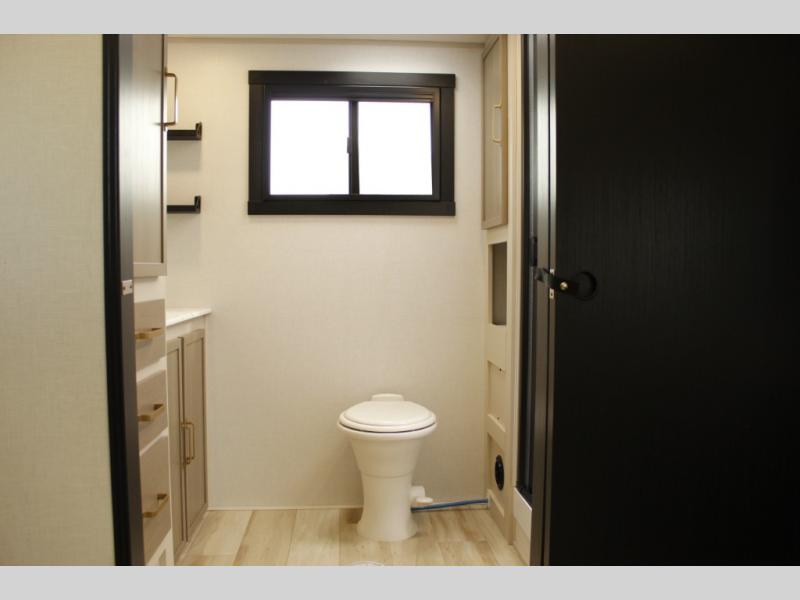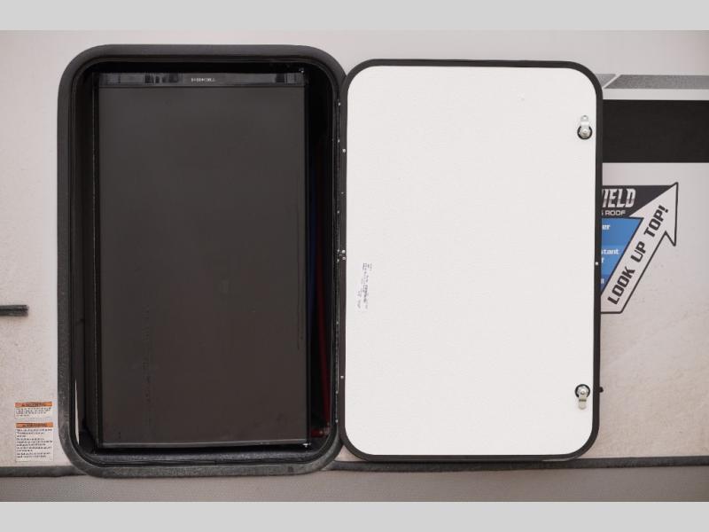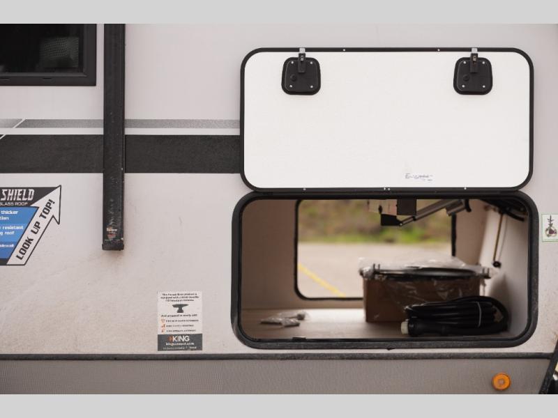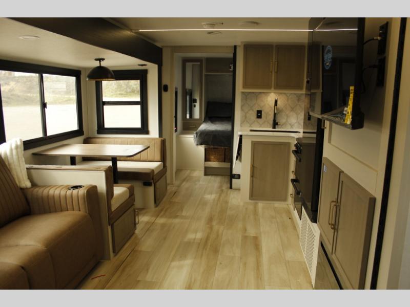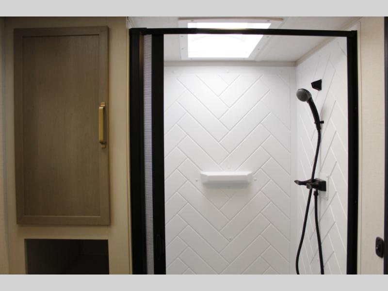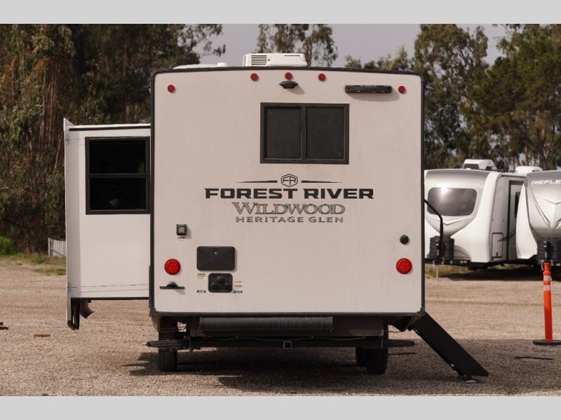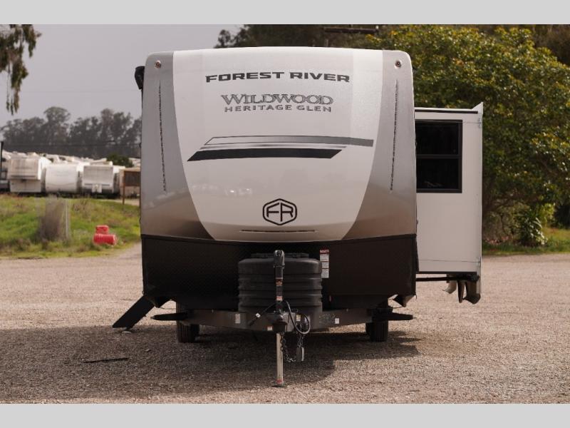 The Wildwood Heritage Glen Hyper-Lyte travel trailer by Forest River offers stability with a wide stance axle system, easy setup with a power tongue jack with an LED docking light, and safe entry with the Step Above aluminum entry steps. The interior includes Temple Cherry cabinetry with matte gold hardware, hidden hinges on the cabinet doors, and a residential single bowl undermount sink. You will also find a back-up camera prep and solar prep, an outdoor shower, Maxxis radial tires, and many more exterior conveniences.