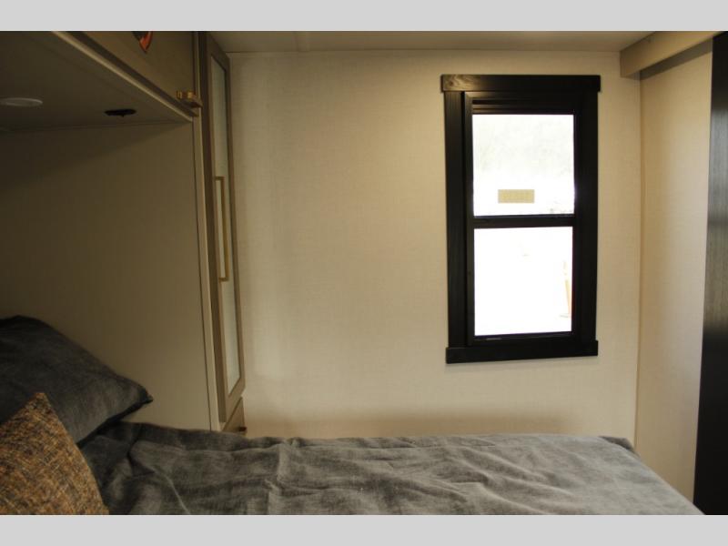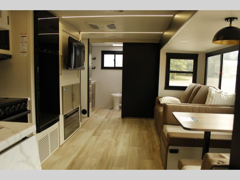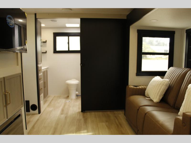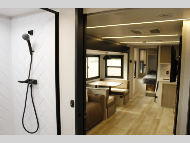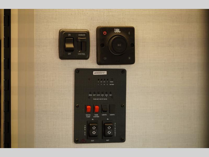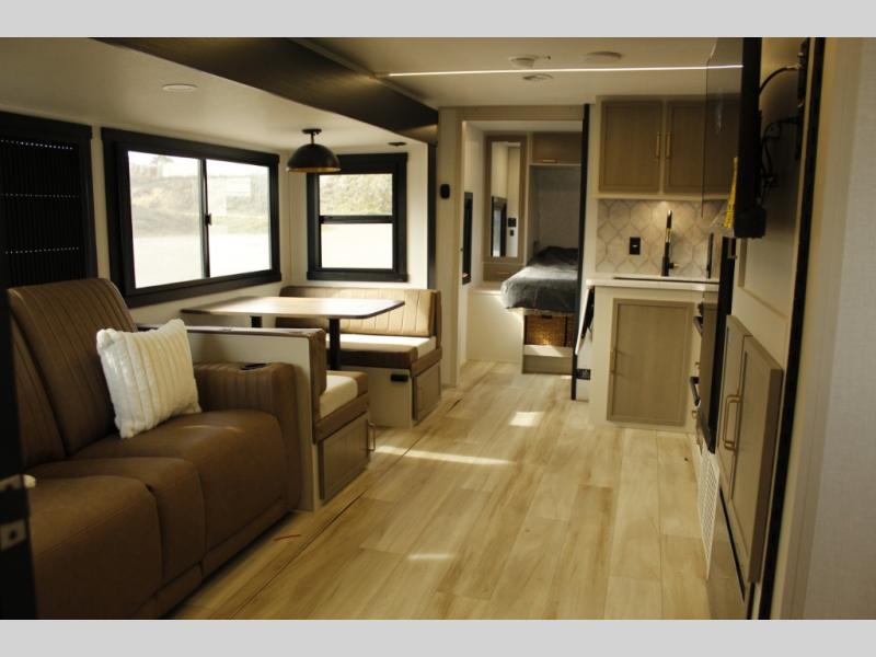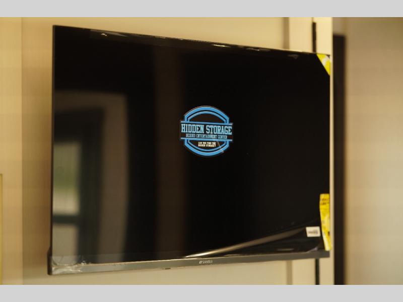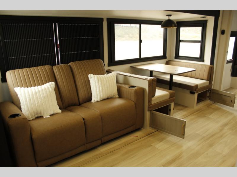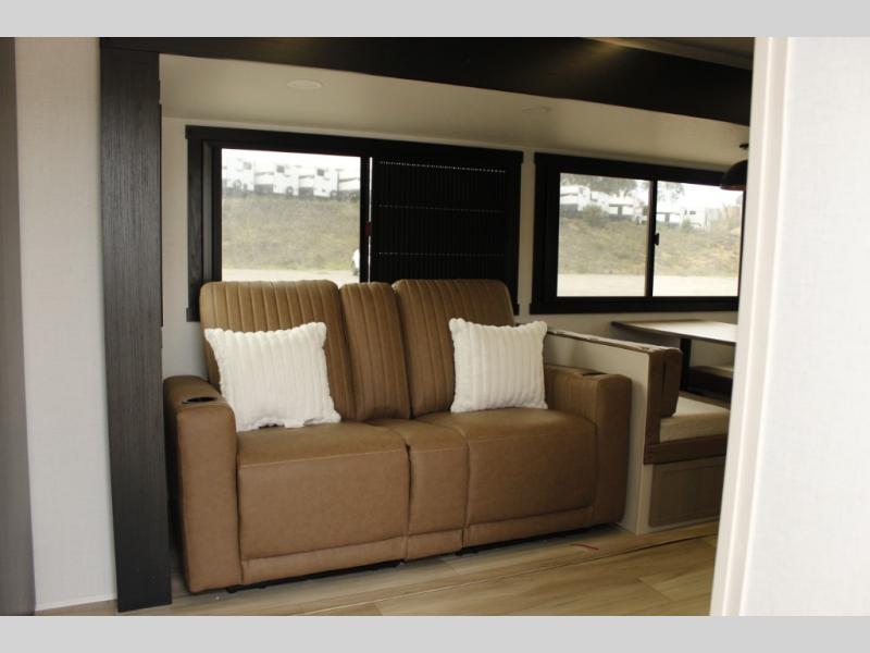 Whether it's a couples night or family night, you can enjoy the spacious living and kitchen area thanks to the large slide out. Grab your favorite snacks from the hidden storage behind the swing-open entertainment center and head to the booth dinette and/or the theater seats with cupholders. You will be able to easily whip up your best meals and clean up even easier with the L-shaped countertop with an extension. The front private bedroom features a queen bed with Versa Tilt to get a good night's rest with wardrobes on either side to keep the room tidy, and the rear bathroom is spacious with a sliding door and two linen closets!