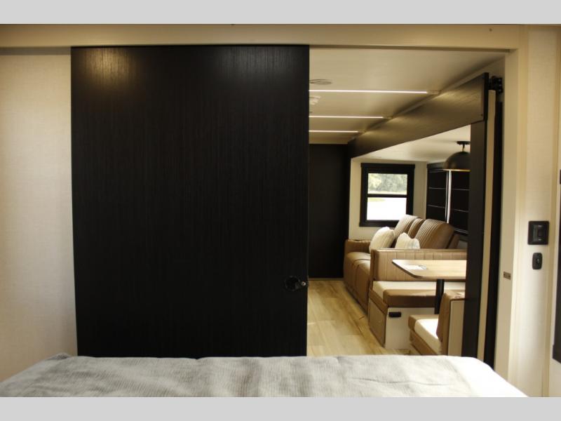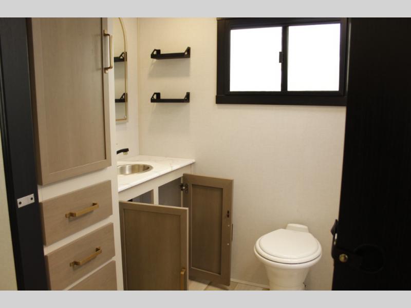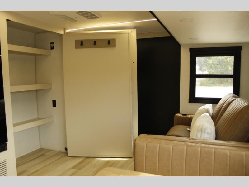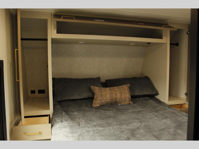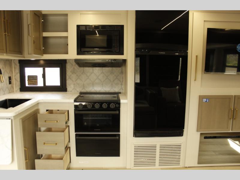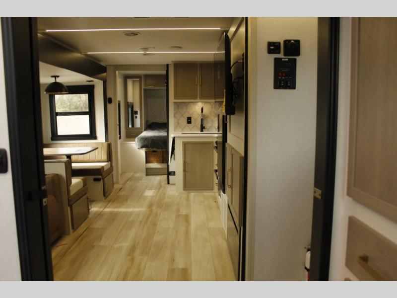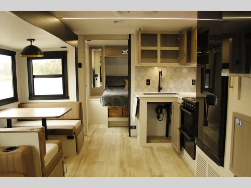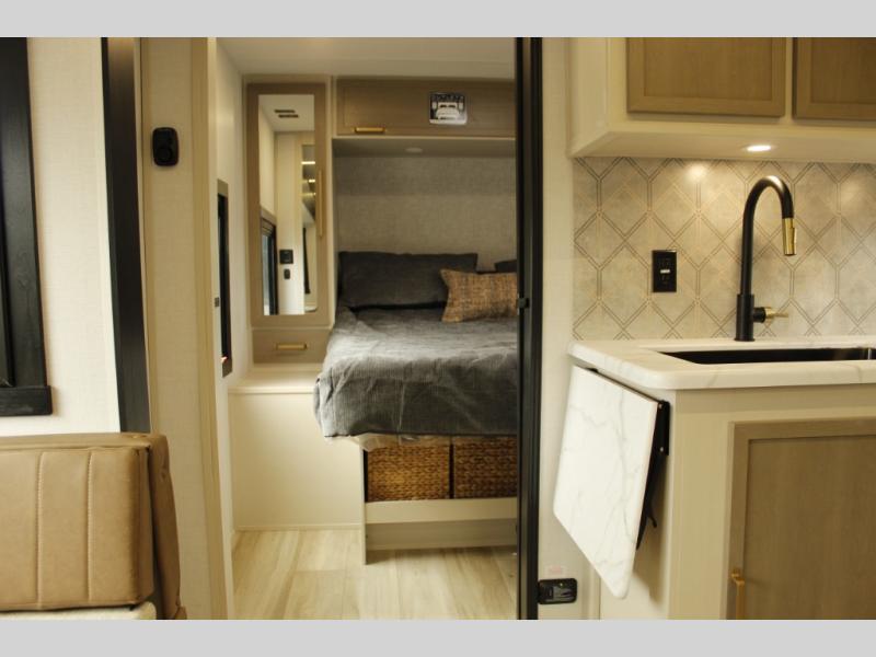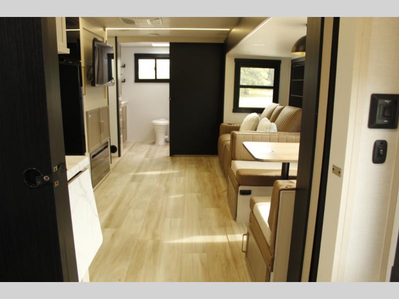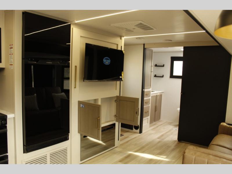 Whether it's a couples night or family night, you can enjoy the spacious living and kitchen area thanks to the large slide out. Grab your favorite snacks from the hidden storage behind the swing-open entertainment center and head to the booth dinette and/or the theater seats with cupholders. You will be able to easily whip up your best meals and clean up even easier with the L-shaped countertop with an extension. The front private bedroom features a queen bed with Versa Tilt to get a good night's rest with wardrobes on either side to keep the room tidy, and the rear bathroom is spacious with a sliding door and two linen closets!