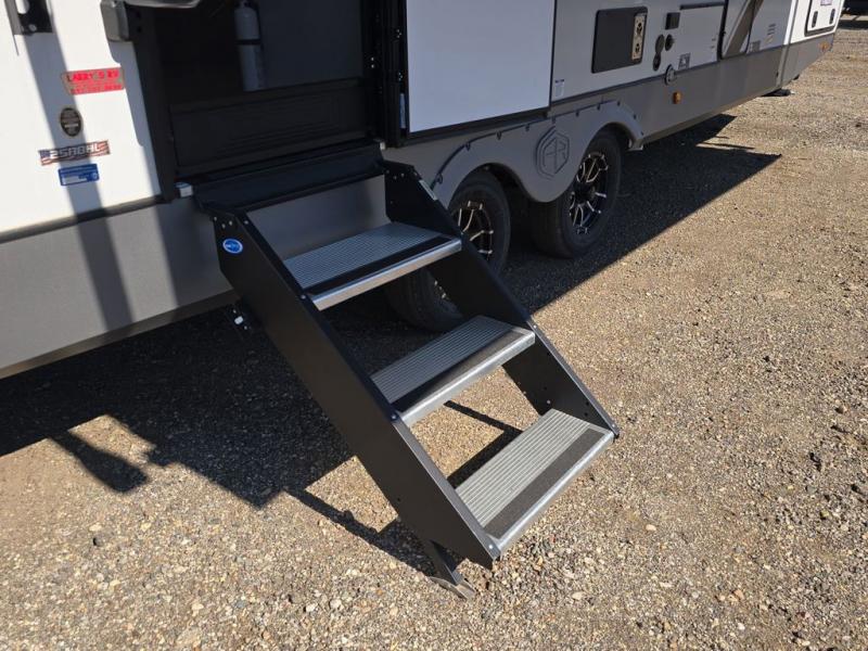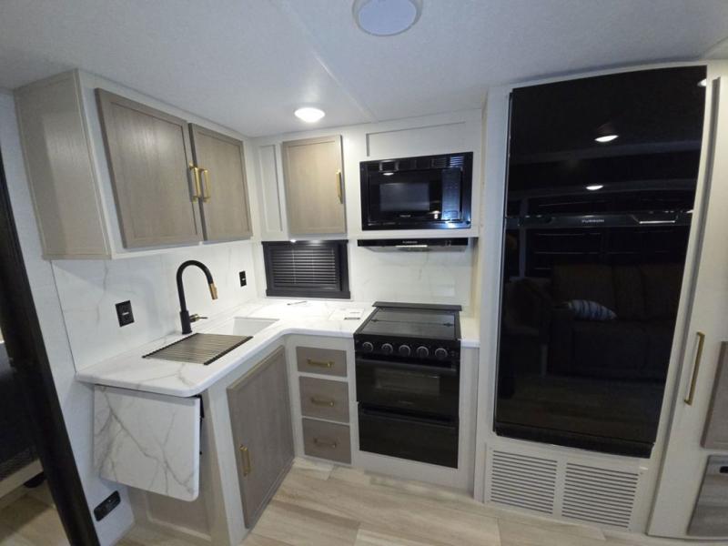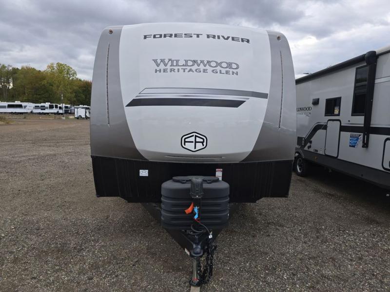 The Wildwood Heritage Glen Hyper-Lyte travel trailer by Forest River offers stability with a wide stance axle system, easy setup with a power tongue jack with an LED docking light, and safe entry with the Step Above aluminum entry steps. The interior includes Temple Cherry cabinetry with matte gold hardware, hidden hinges on the cabinet doors, and a residential single bowl undermount sink. You will also find a back-up camera prep and solar prep, an outdoor shower, Maxxis radial tires, and many more exterior conveniences.
