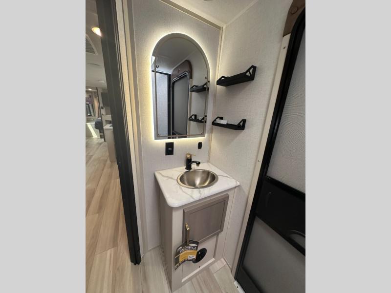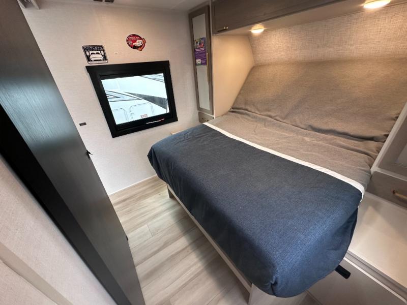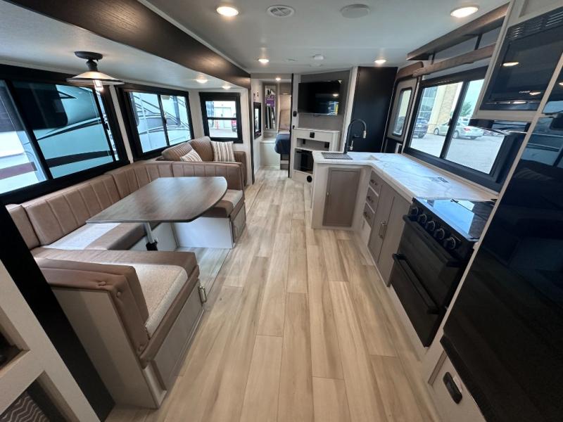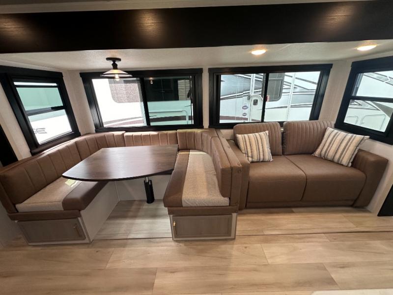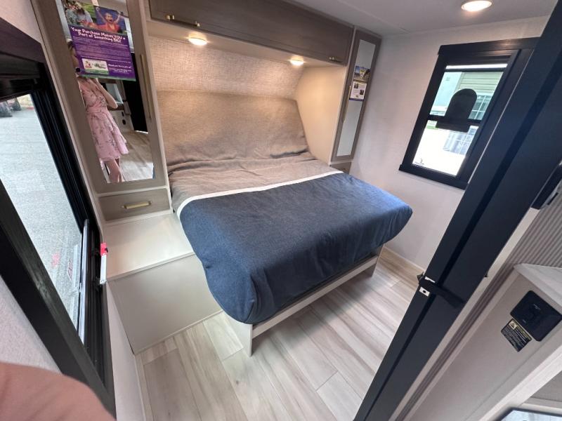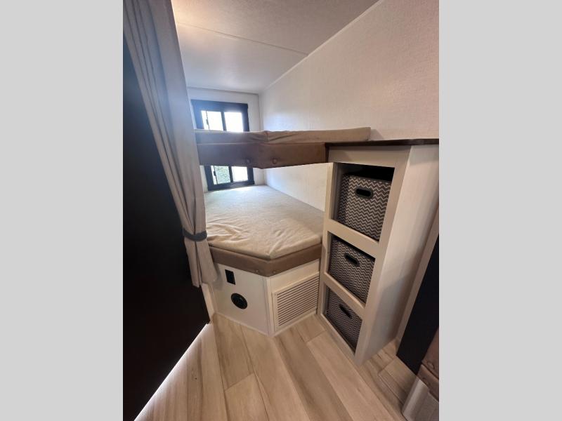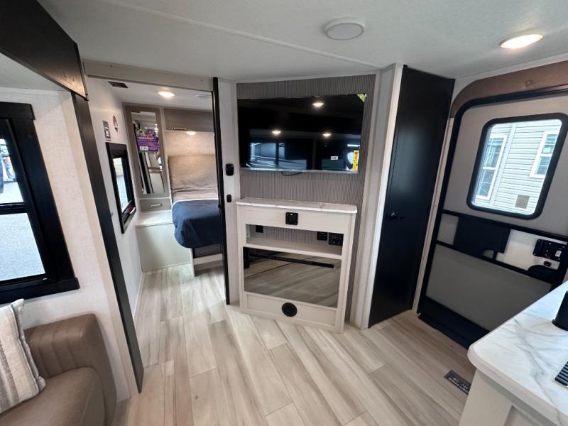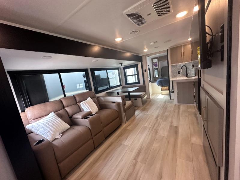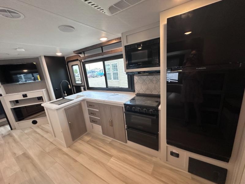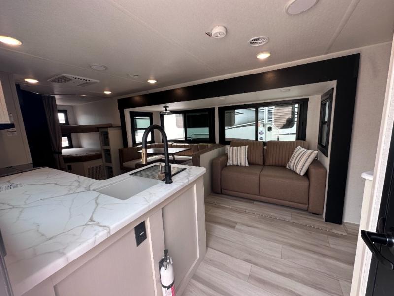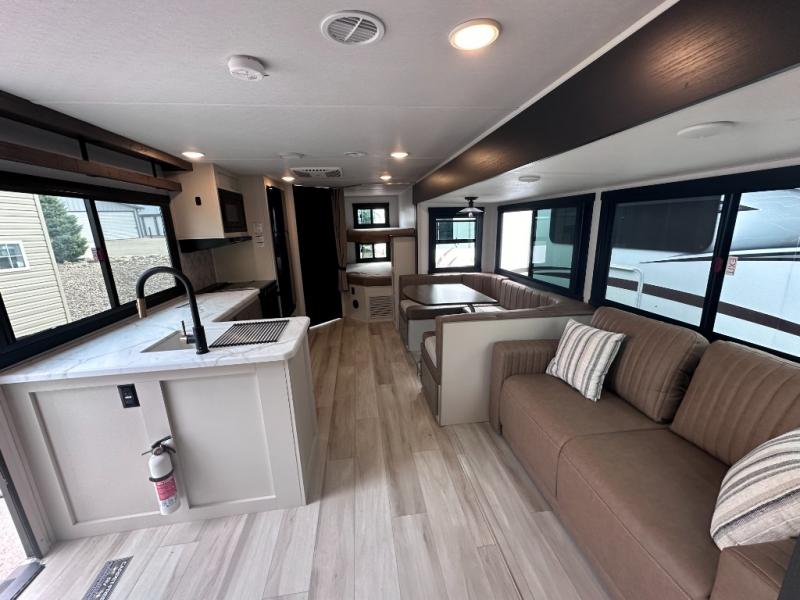 Dual entry doors add convenience to every trip taken with this travel trailer! You will find sleeping space for ten when you utilize the furniture for extra sleeping space. There is plenty of storage for your linens, clothes, dishes and food, plus the pass-through compartment allows you to stow away camping chairs, fishing poles, charcoal and such. The L-shaped kitchen offers plenty of room to cook while everyone is moving about, or you can make a few meals on the outside kitchen that includes an exterior griddle and refrigerator. You will also have your own private bedroom up front while the kids or your friends sleep on the double size bunks or the furniture once set up for bedtime. And the 40" LED TV and fireplace will be popular on those chilly nights.