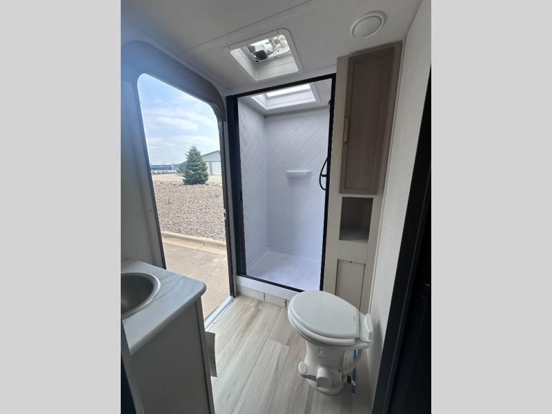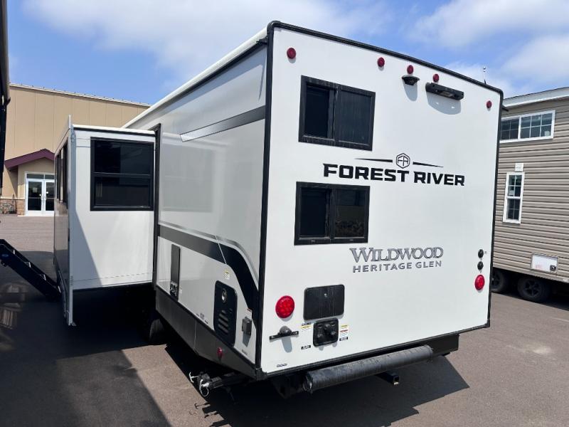 The Wildwood Heritage Glen Hyper-Lyte travel trailer by Forest River offers stability with a wide stance axle system, easy setup with a power tongue jack with an LED docking light, and safe entry with the Step Above aluminum entry steps. The XL Max-Tint panoramic window(s) in the main slide bring the outside inside, plus the kitchen offers a recessed glass stove top cover, a Midnight glass range hood and microwave, plus more. You will also find a back-up camera prep and solar prep, an outdoor shower, black-accented upgraded aluminum wheels, and many more exterior conveniences.