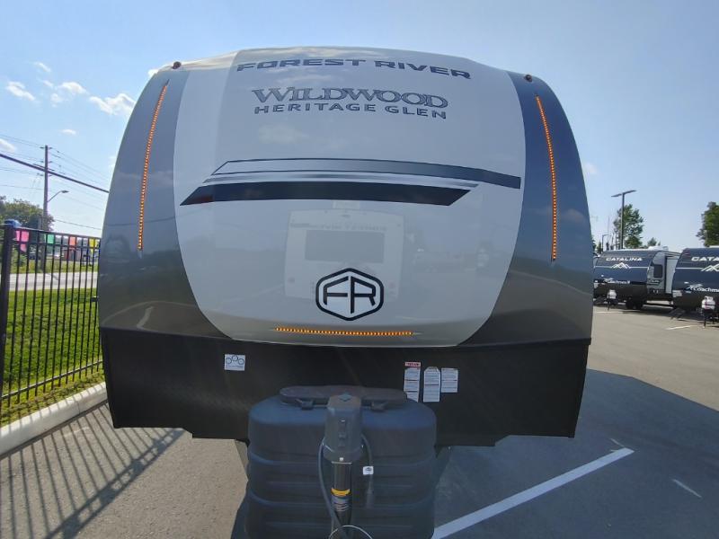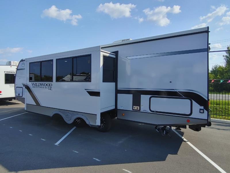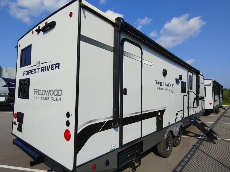The Wildwood Heritage Glen Hyper-Lyte travel trailer by Forest River offers stability with a wide stance axle system, easy setup with a power tongue jack with an LED docking light, and safe entry with the Step Above aluminum entry steps. The XL Max-Tint panoramic window(s) in the main slide bring the outside inside, plus the kitchen offers a recessed glass stove top cover, a Midnight glass range hood and microwave, plus more. You will also find a back-up camera prep and solar prep, an outdoor shower, black-accented upgraded aluminum wheels, and many more exterior conveniences.