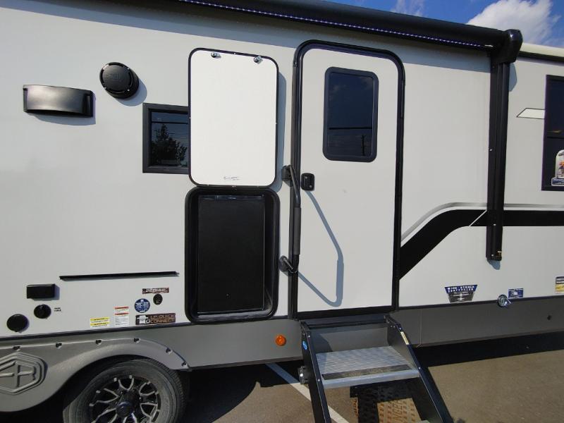 Dual entry doors add convenience to every trip taken with this travel trailer! You will find sleeping space for ten when you utilize the furniture for extra sleeping space. There is plenty of storage for your linens, clothes, dishes and food, plus the pass-through compartment allows you to stow away camping chairs, fishing poles, charcoal and such. The L-shaped kitchen offers plenty of room to cook while everyone is moving about, or you can make a few meals on the outside kitchen that includes an exterior griddle and refrigerator. You will also have your own private bedroom up front while the kids or your friends sleep on the double size bunks or the furniture once set up for bedtime. And the 40" LED TV and fireplace will be popular on those chilly nights.