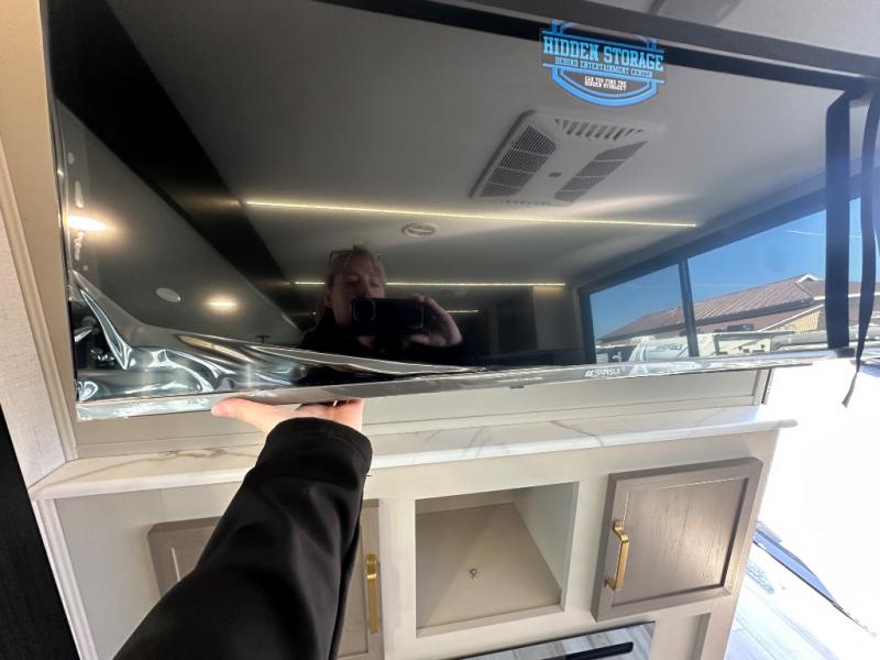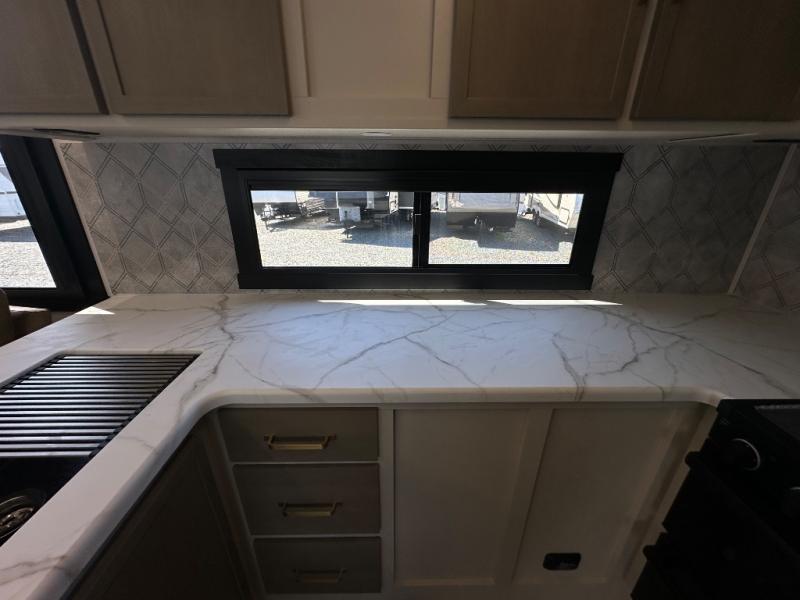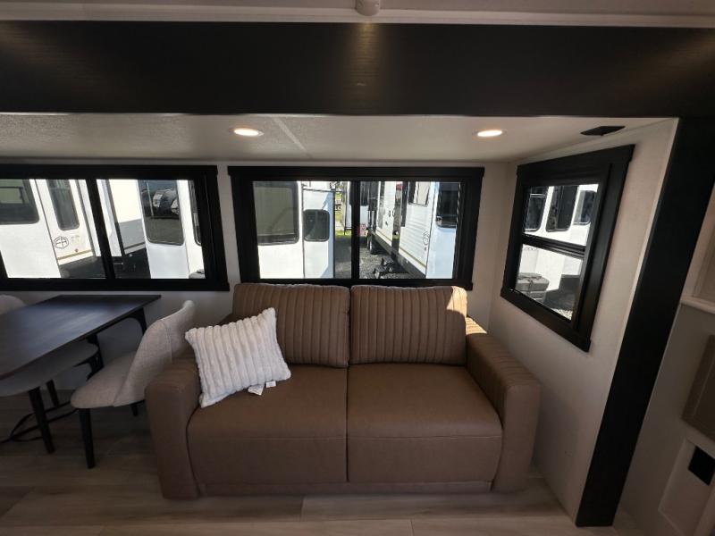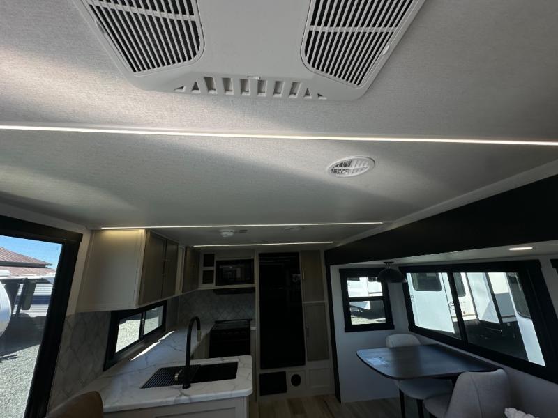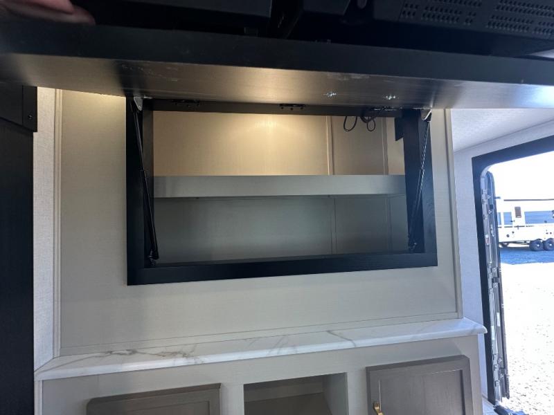 Camping trips just got better with this travel trailer in tow! You can cook in the rear kitchen with a three burner range, microwave oven, and a 10 cu. ft. 12V refrigerator. There is also a U-shaped counter to prep all your meals and a pantry to keep snacks close by. Your crew can relax on the tri-fold sofa or booth dinette within the large slide out, and there is an entertainment center with a 40" TV for movie night. Clean up each day in the spacious full bath, then head to the front private bedroom with a walk-around queen bed with Versa-Tilt. There are also dual wardrobes and a closet with washer and dryer prep. Head outdoors to find the 20' power awning, XL Texas size pass-through storage, and exterior griddle!