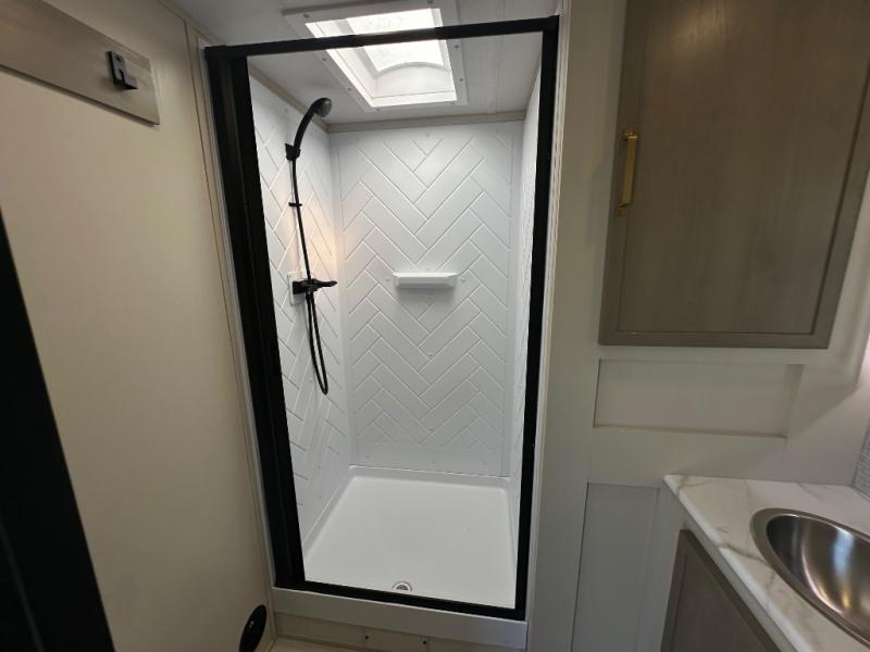 The Wildwood Heritage Glen Hyper-Lyte travel trailer by Forest River offers stability with a wide stance axle system, easy setup with a power tongue jack with an LED docking light, and safe entry with the Step Above aluminum entry steps. The interior includes Temple Cherry cabinetry with matte gold hardware, hidden hinges on the cabinet doors, and a residential single bowl undermount sink. You will also find a back-up camera prep and solar prep, an outdoor shower, Maxxis radial tires, and many more exterior conveniences.