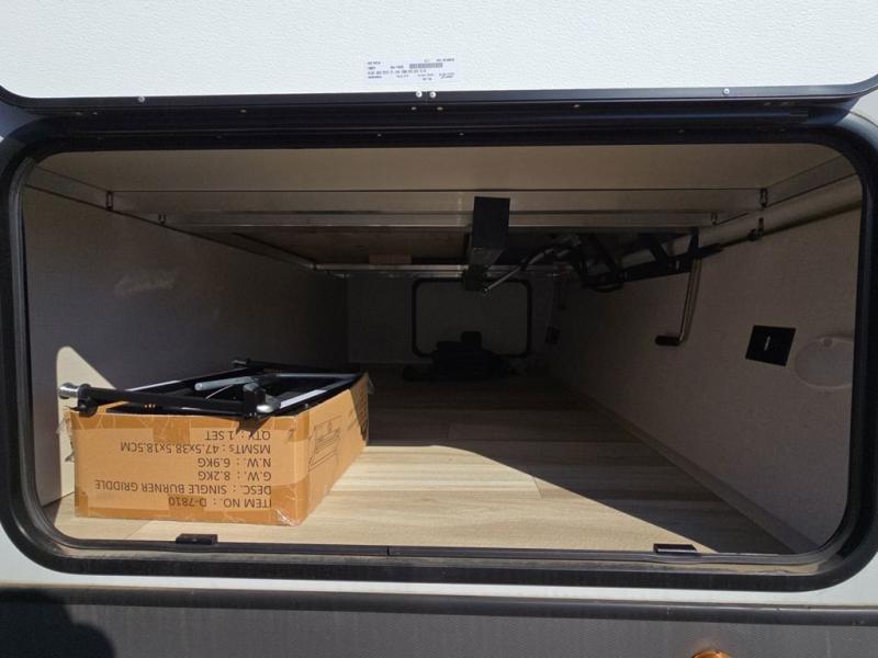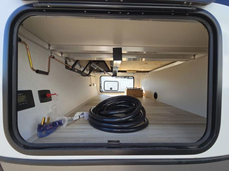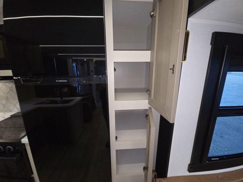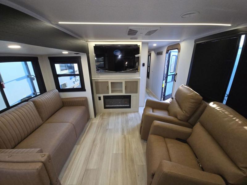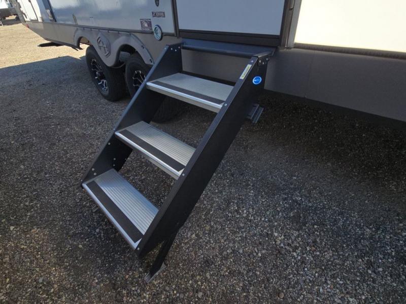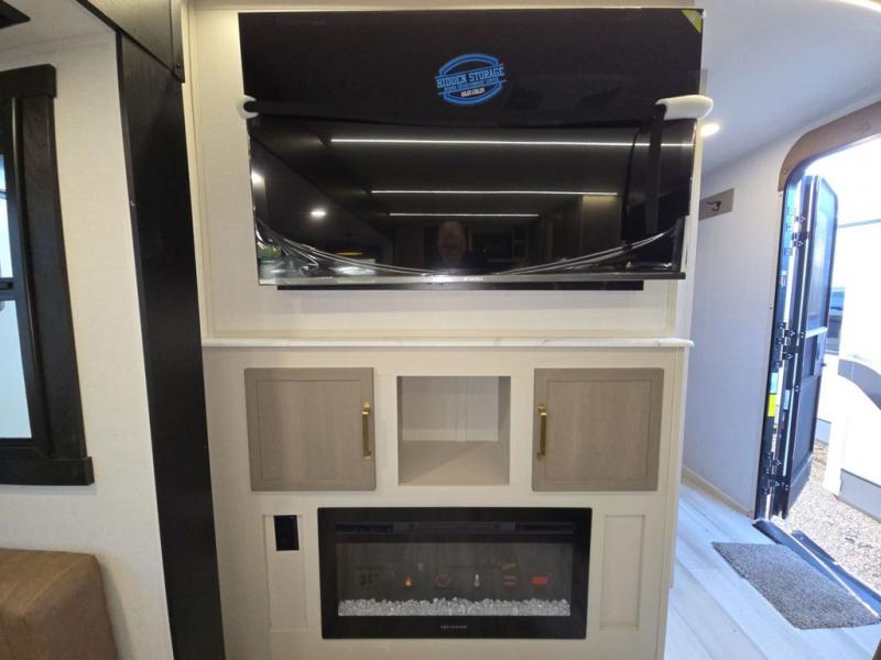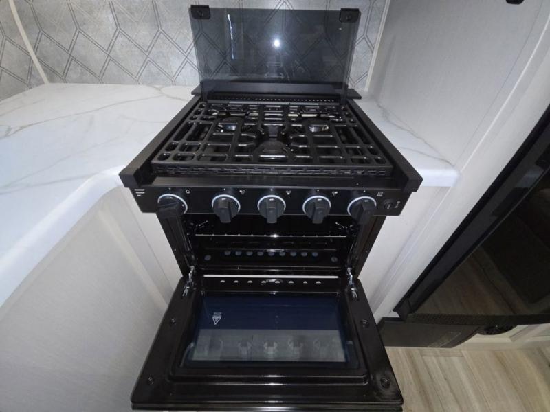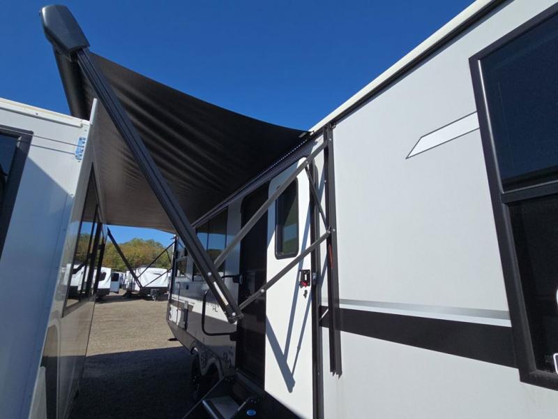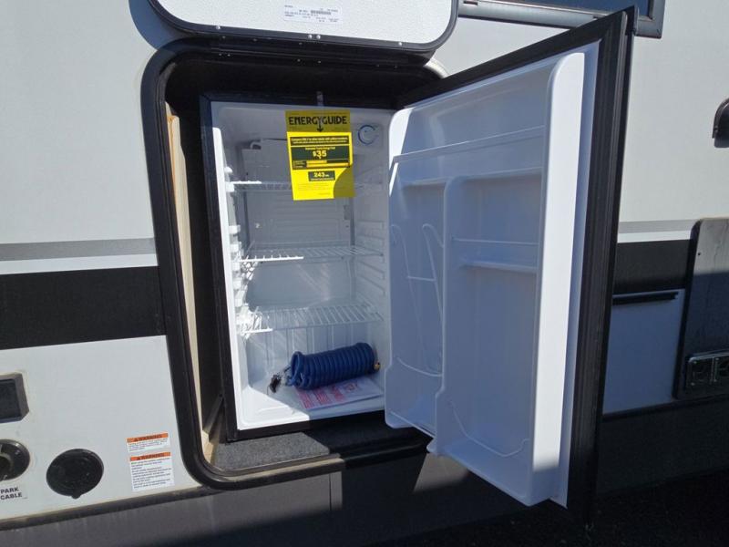 Camping trips just got better with this travel trailer in tow! You can cook in the rear kitchen with a three burner range, microwave oven, and a 10 cu. ft. 12V refrigerator. There is also a U-shaped counter to prep all your meals and a pantry to keep snacks close by. Your crew can relax on the tri-fold sofa or booth dinette within the large slide out, and there is an entertainment center with a 40" TV for movie night. Clean up each day in the spacious full bath, then head to the front private bedroom with a walk-around queen bed with Versa-Tilt. There are also dual wardrobes and a closet with washer and dryer prep. Head outdoors to find the 20' power awning, XL Texas size pass-through storage, and exterior griddle!