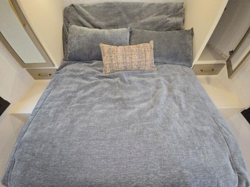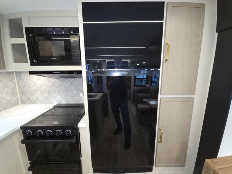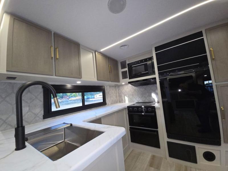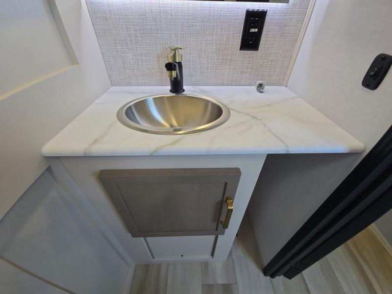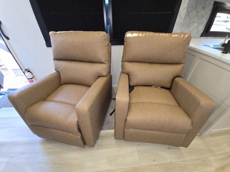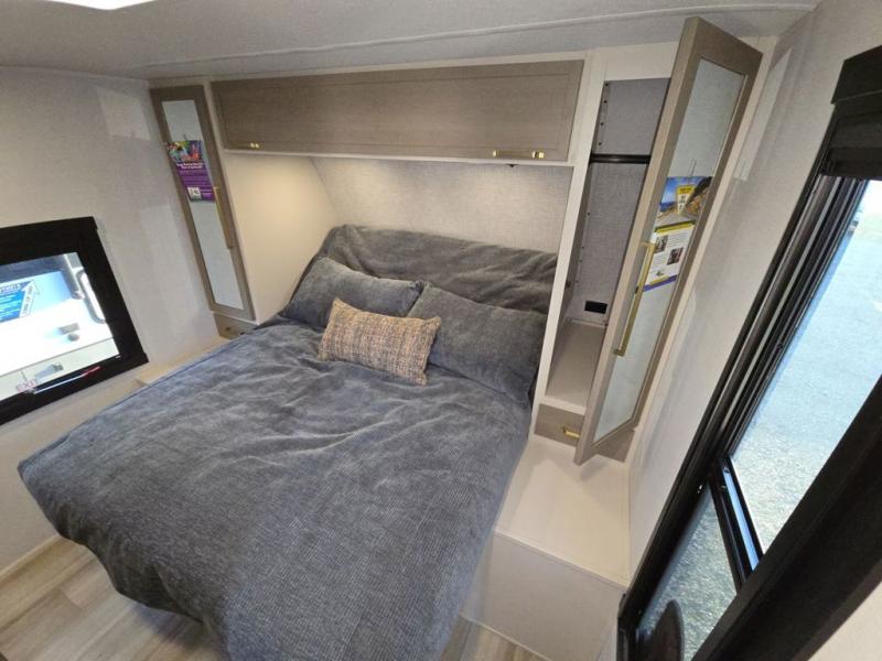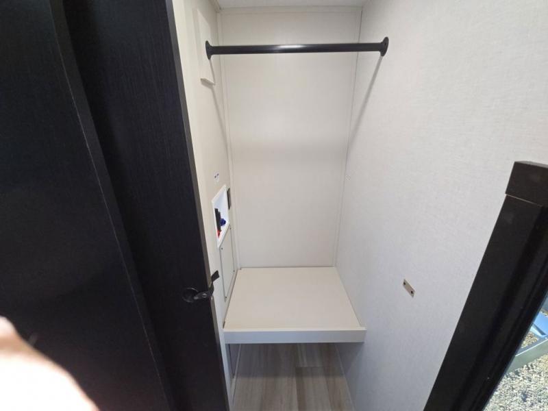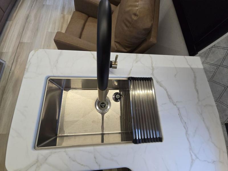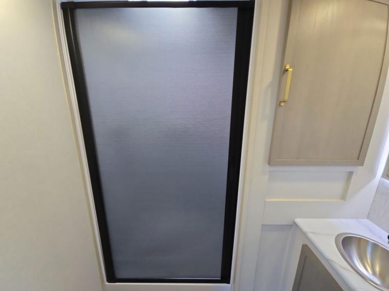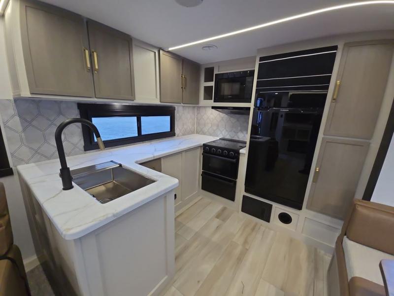 Camping trips just got better with this travel trailer in tow! You can cook in the rear kitchen with a three burner range, microwave oven, and a 10 cu. ft. 12V refrigerator. There is also a U-shaped counter to prep all your meals and a pantry to keep snacks close by. Your crew can relax on the tri-fold sofa or booth dinette within the large slide out, and there is an entertainment center with a 40" TV for movie night. Clean up each day in the spacious full bath, then head to the front private bedroom with a walk-around queen bed with Versa-Tilt. There are also dual wardrobes and a closet with washer and dryer prep. Head outdoors to find the 20' power awning, XL Texas size pass-through storage, and exterior griddle!