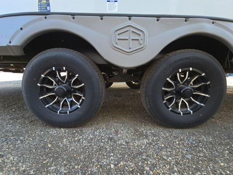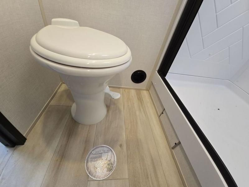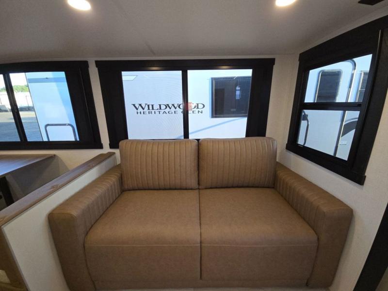The Wildwood Heritage Glen Hyper-Lyte travel trailer by Forest River offers stability with a wide stance axle system, easy setup with a power tongue jack with an LED docking light, and safe entry with the Step Above aluminum entry steps. The interior includes Temple Cherry cabinetry with matte gold hardware, hidden hinges on the cabinet doors, and a residential single bowl undermount sink. You will also find a back-up camera prep and solar prep, an outdoor shower, Maxxis radial tires, and many more exterior conveniences.