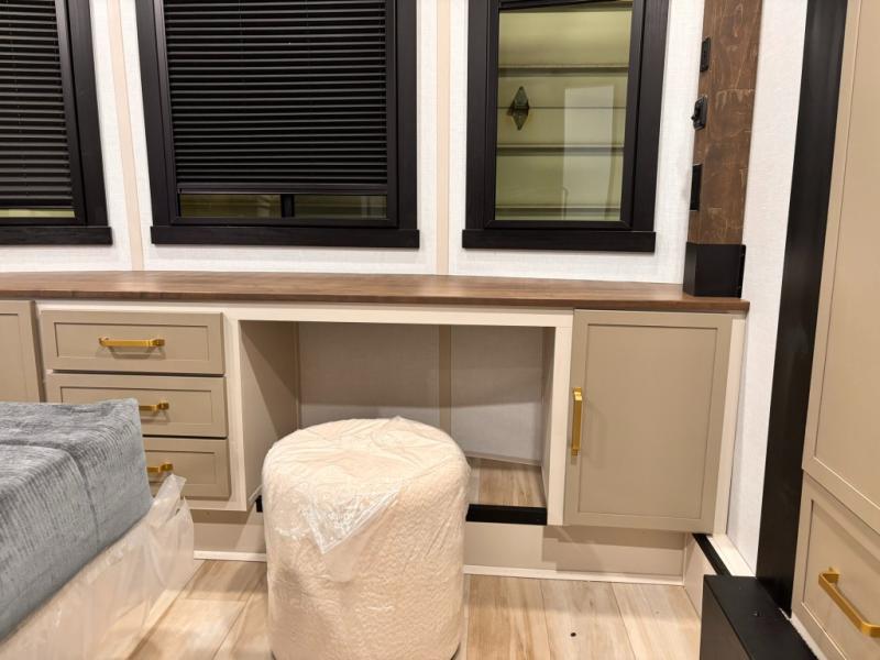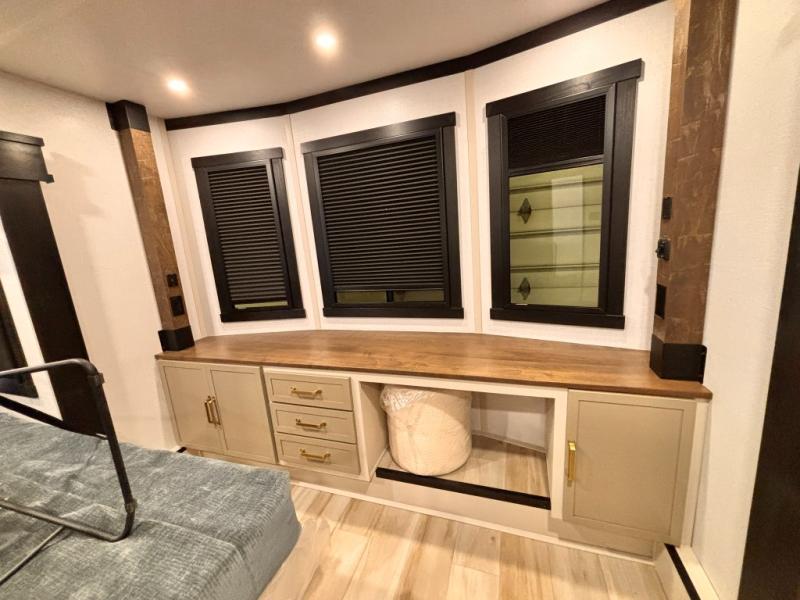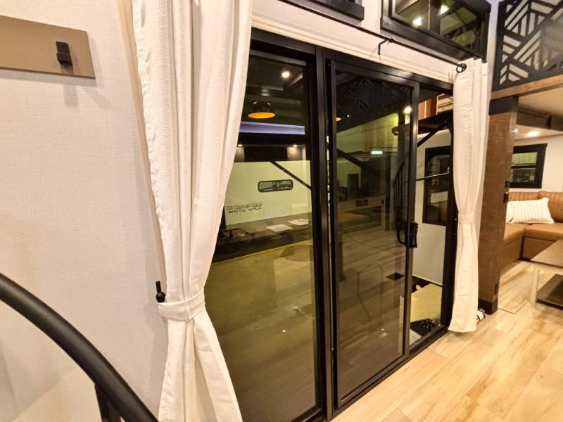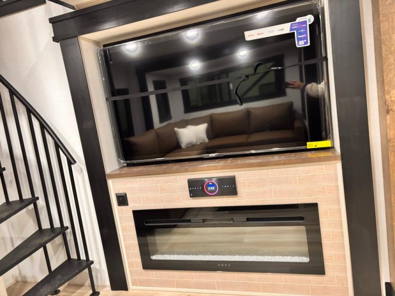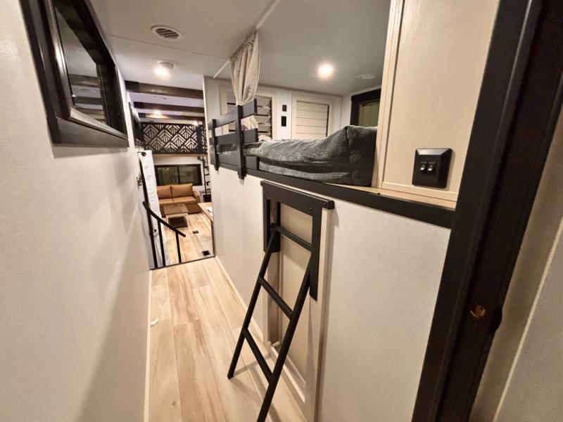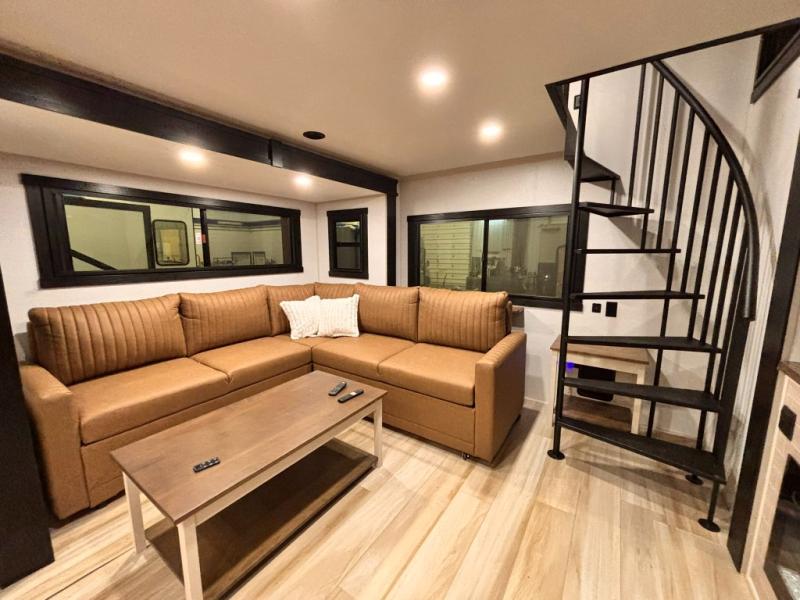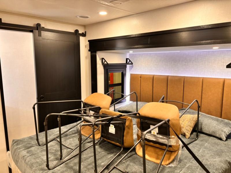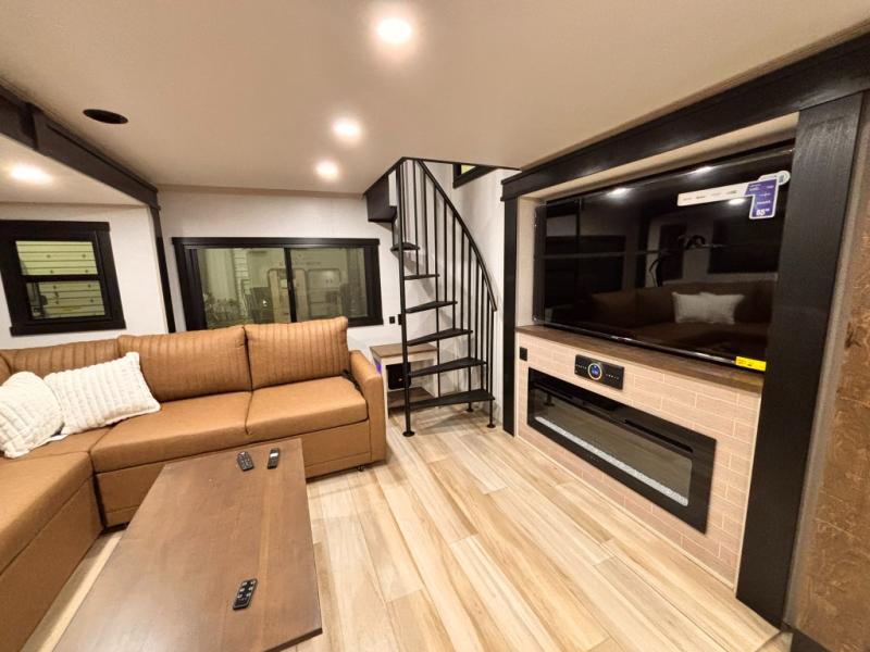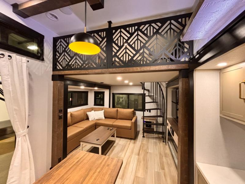 Introducing a new RV of its kind, the ROOST43 is a destination-style fifth wheel you are sure to love! There are two levels, making it feel more like home, and you can sleep six to eight each night. The master bedroom includes a custom king bed slide out, a 32" TV and fireplace, a desk/vanity, plus a half bath for convenience. A custom king-size bed is also found in the front loft, and there are storage cubbies plus a coax/110V outlet here to plug in chargers or a laptop. The second loft in the back includes spiral stairs, two bunk mats, a wardrobe, and cubby cubes here also for your guests' things. Some of the stand-out features you'll find on the first level are the sectional sofa with a coffee table, an entertainment center with a 65" TV, a kitchen island with five chairs, and a fully-equipped kitchen. The 20 cu. ft. 12V refrigerator and pull-out pantry will let you stock up on food, and the kitchen hutch will be perfect for nice dishes. The full bath on this model is one to remember; there is a one-piece fiberglass shower with a teak seat, a flip-up shelf and a washer/dryer, a backlit mirror, and more. And we haven't even touched on the exterior features, such as the pull-out tray, outdoor refrigerators, 20' awning, and more!