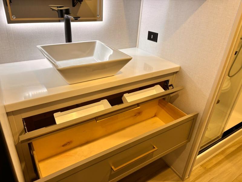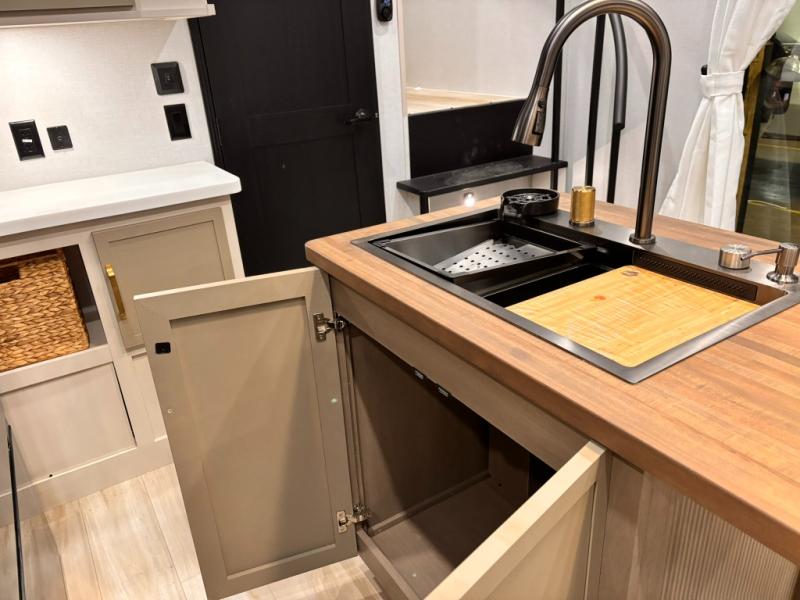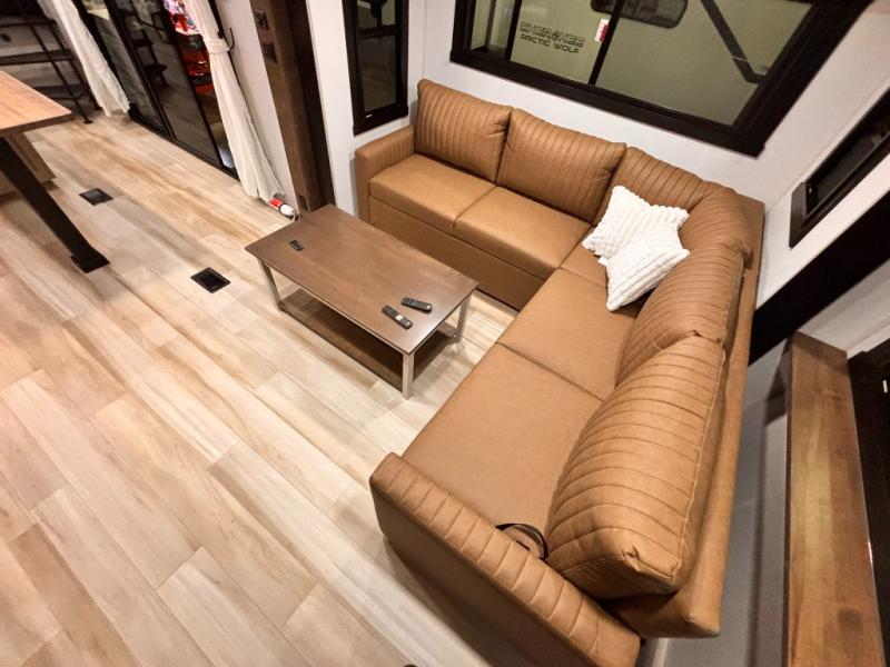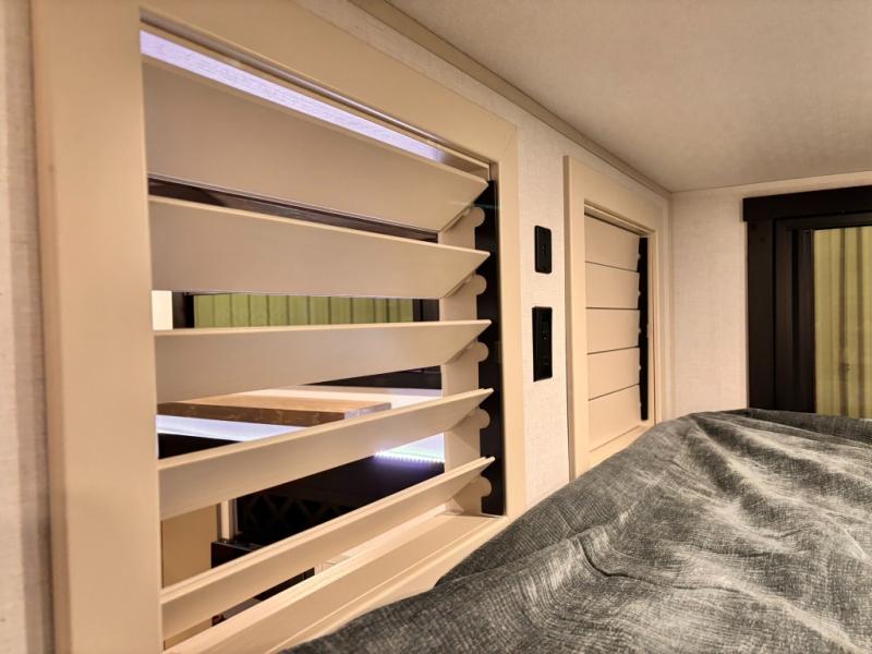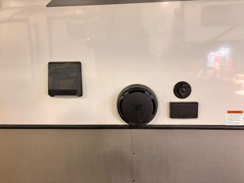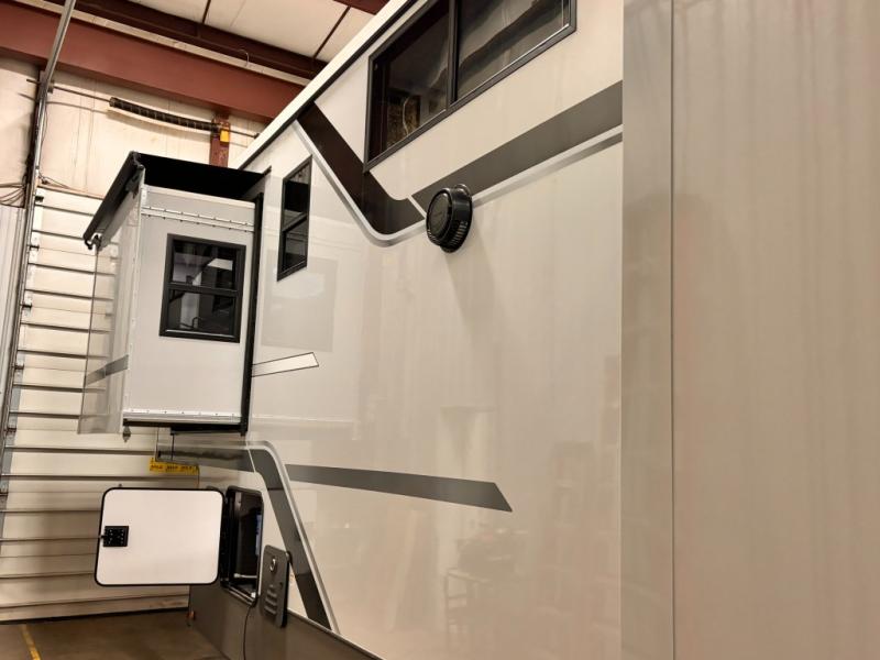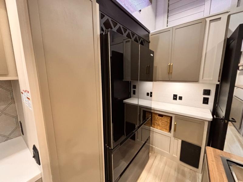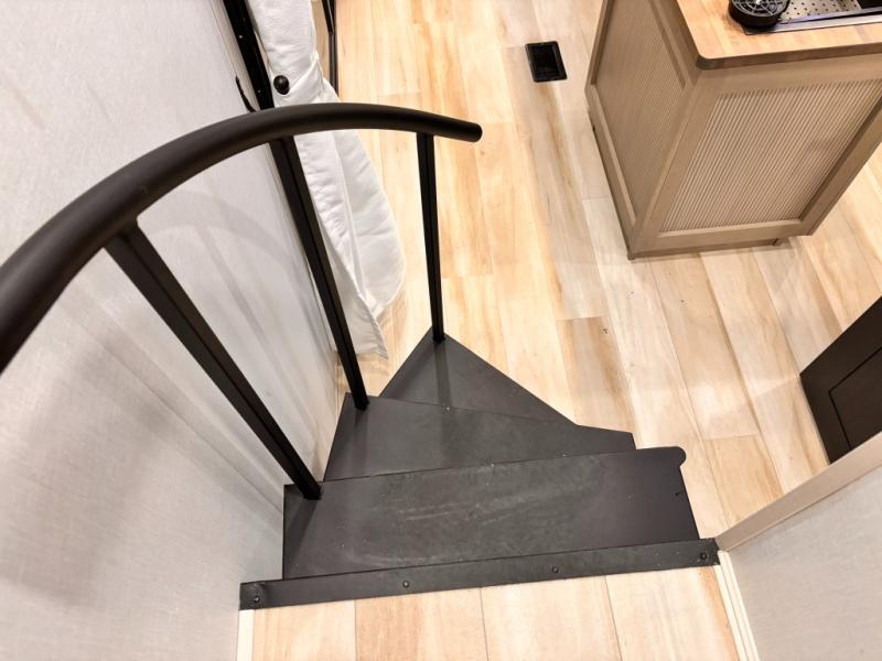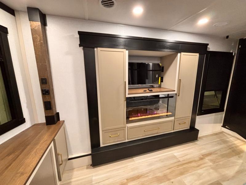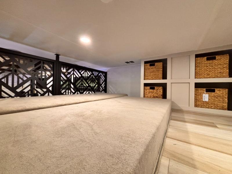 Introducing a new RV of its kind, the ROOST43 is a destination-style fifth wheel you are sure to love! There are two levels, making it feel more like home, and you can sleep six to eight each night. The master bedroom includes a custom king bed slide out, a 32" TV and fireplace, a desk/vanity, plus a half bath for convenience. A custom king-size bed is also found in the front loft, and there are storage cubbies plus a coax/110V outlet here to plug in chargers or a laptop. The second loft in the back includes spiral stairs, two bunk mats, a wardrobe, and cubby cubes here also for your guests' things. Some of the stand-out features you'll find on the first level are the sectional sofa with a coffee table, an entertainment center with a 65" TV, a kitchen island with five chairs, and a fully-equipped kitchen. The 20 cu. ft. 12V refrigerator and pull-out pantry will let you stock up on food, and the kitchen hutch will be perfect for nice dishes. The full bath on this model is one to remember; there is a one-piece fiberglass shower with a teak seat, a flip-up shelf and a washer/dryer, a backlit mirror, and more. And we haven't even touched on the exterior features, such as the pull-out tray, outdoor refrigerators, 20' awning, and more!