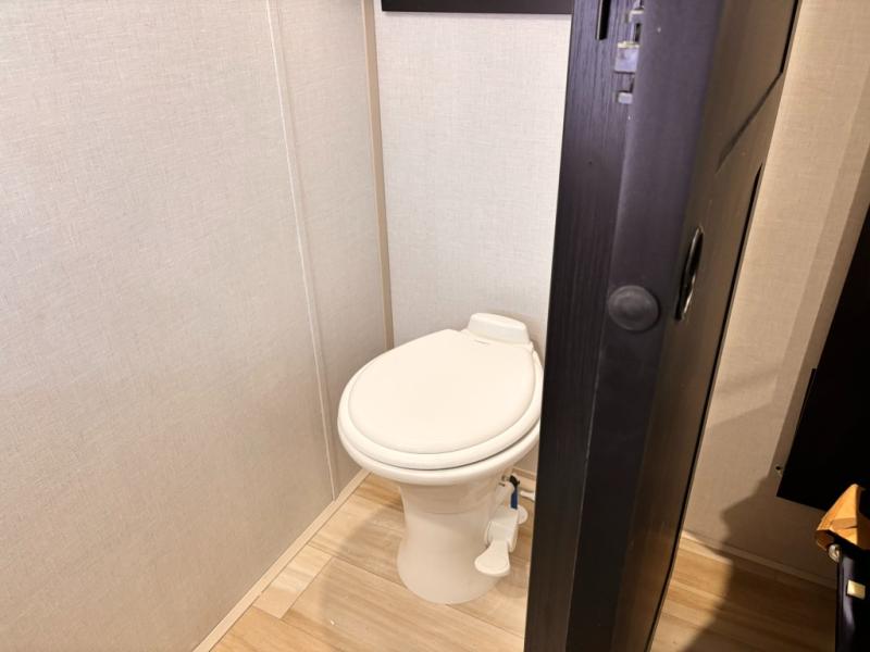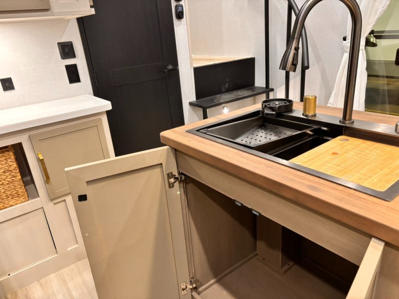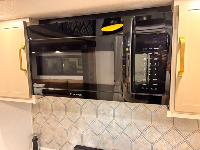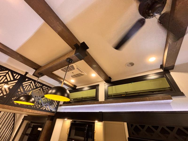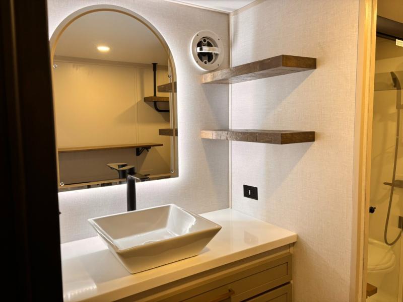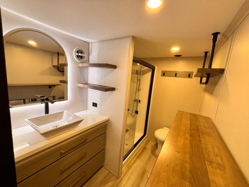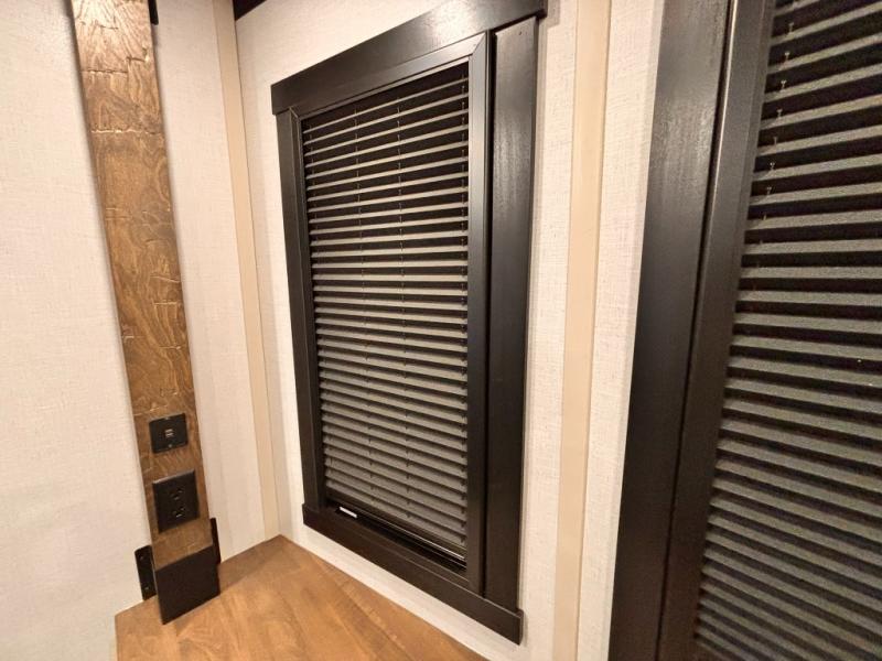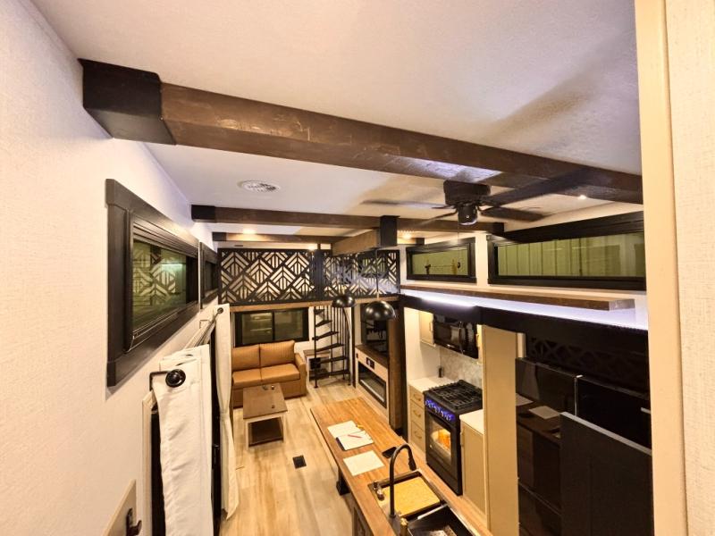 The Wildwood Heritage Glen ROOST fifth wheels resemble a destination trailer that will be giving you residential vibes! The premium Alley Grey high-gloss gel coat fiberglass sidewalls are ultra sleek, and the flat pitched roof sheds water to the off-door side for added comfort. A Race Track A/C duct system provides maximum cooling, and the AccessiBelly underbelly with 12V tank heaters on all holding tanks will help extend your camping season. There are high-end solid surface and maple-stained wood countertops inside, along with residential-inspired wood door casings, and 6' 8" clearance in all rooms, excluding lofts. Additional features include a Gun Metal grey kitchen sink, backlit mirrors in the bathrooms, motion sensor lights by the spiral stair cases, and back up camera prep if you want the option to make parking easier than ever.