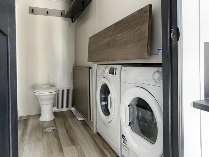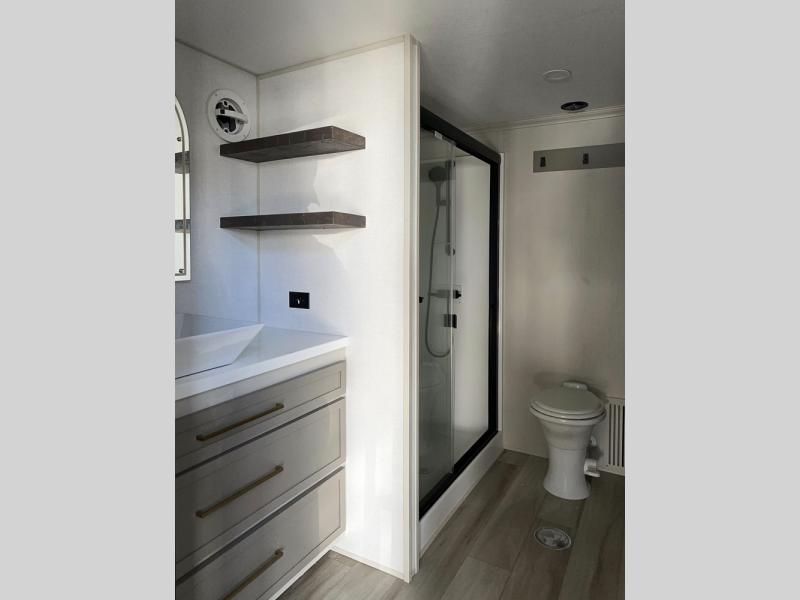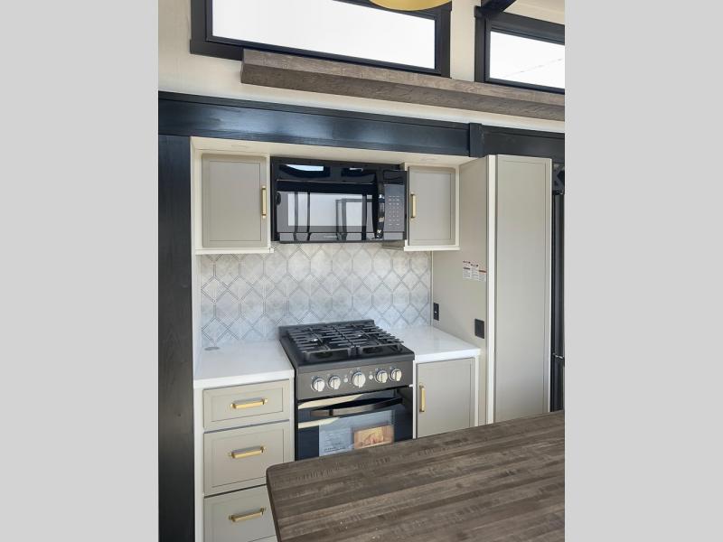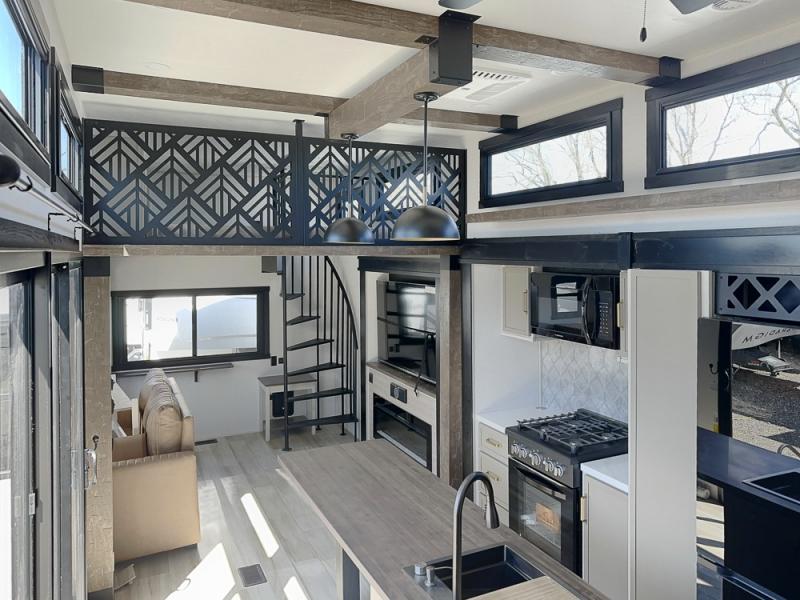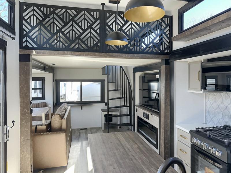 The Wildwood Heritage Glen ROOST fifth wheels resemble a destination trailer that will be giving you residential vibes! The premium Alley Grey high-gloss gel coat fiberglass sidewalls are ultra sleek, and the flat pitched roof sheds water to the off-door side for added comfort. A Race Track A/C duct system provides maximum cooling, and the AccessiBelly underbelly with 12V tank heaters on all holding tanks will help extend your camping season. There are high-end solid surface and maple-stained wood countertops inside, along with residential-inspired wood door casings, and 6' 8" clearance in all rooms, excluding lofts. Additional features include a Gun Metal grey kitchen sink, backlit mirrors in the bathrooms, motion sensor lights by the spiral stair cases, and back up camera prep if you want the option to make parking easier than ever.