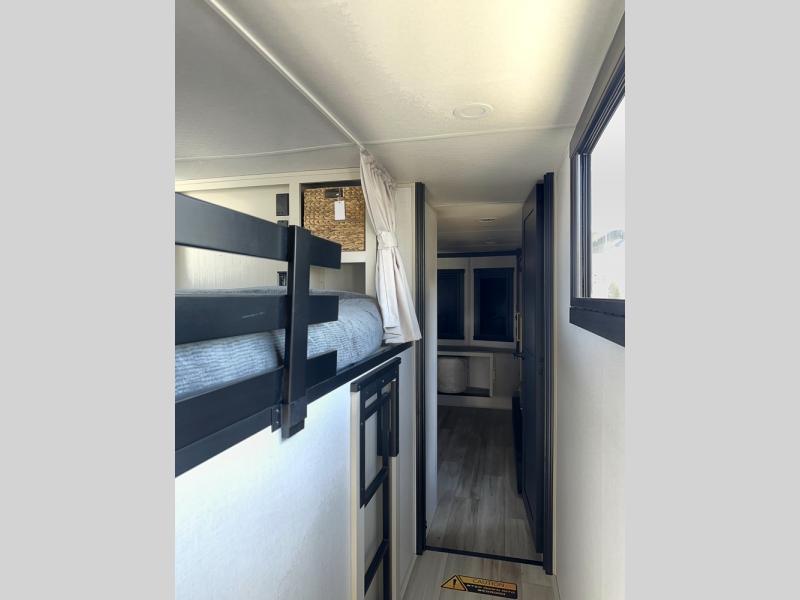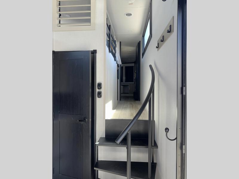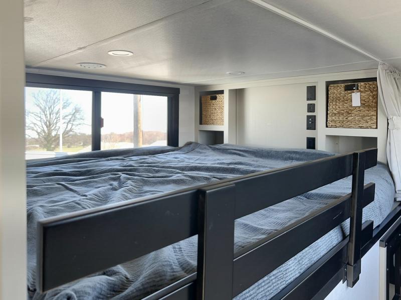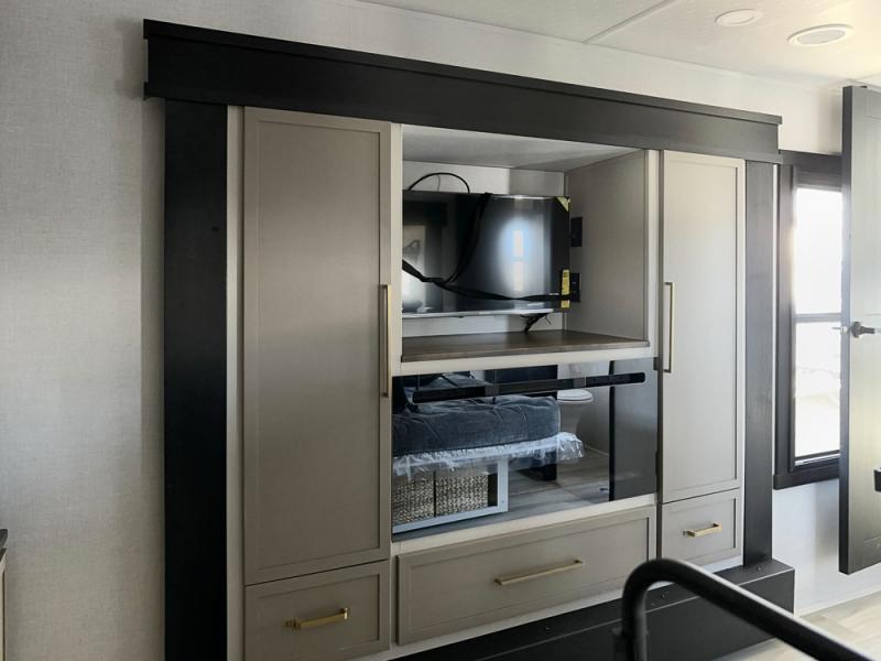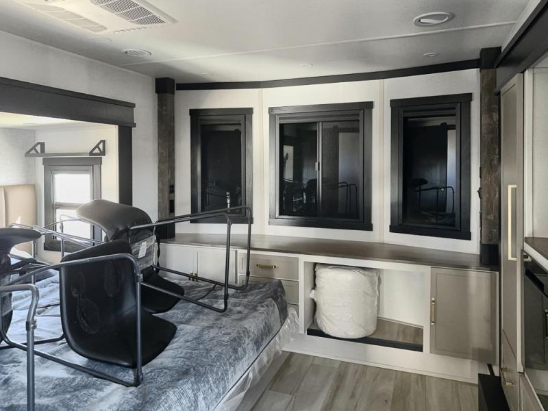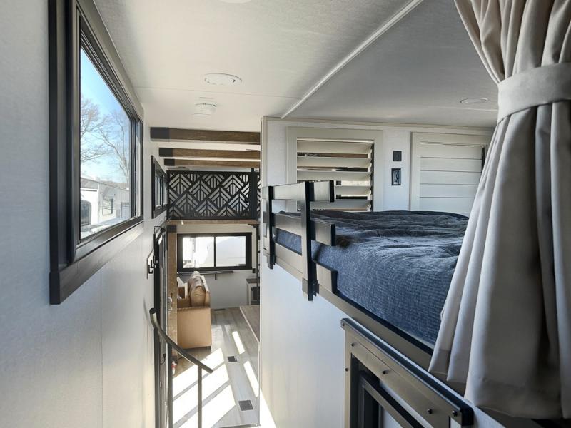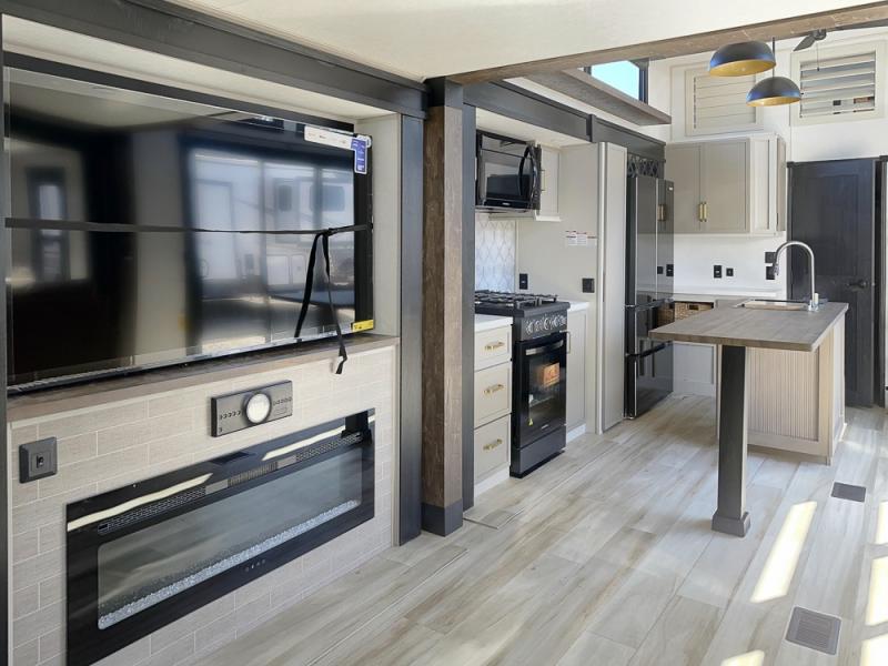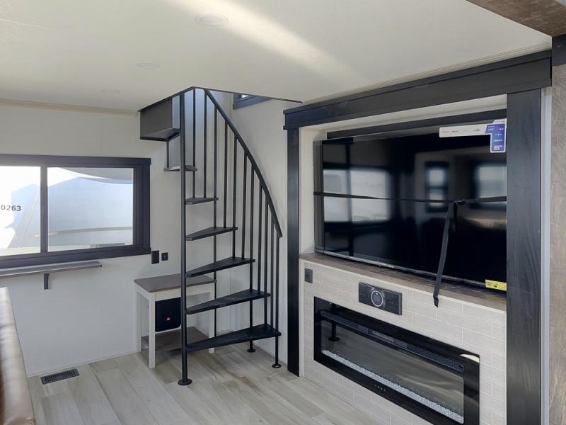 Introducing a new RV of its kind, the ROOST43 is a destination-style fifth wheel you are sure to love! There are two levels, making it feel more like home, and you can sleep six to eight each night. The master bedroom includes a custom king bed slide out, a 32" TV and fireplace, a desk/vanity, plus a half bath for convenience. A custom king-size bed is also found in the front loft, and there are storage cubbies plus a coax/110V outlet here to plug in chargers or a laptop. The second loft in the back includes spiral stairs, two bunk mats, a wardrobe, and cubby cubes here also for your guests' things. Some of the stand-out features you'll find on the first level are the sectional sofa with a coffee table, an entertainment center with a 65" TV, a kitchen island with five chairs, and a fully-equipped kitchen. The 20 cu. ft. 12V refrigerator and pull-out pantry will let you stock up on food, and the kitchen hutch will be perfect for nice dishes. The full bath on this model is one to remember; there is a one-piece fiberglass shower with a teak seat, a flip-up shelf and a washer/dryer, a backlit mirror, and more. And we haven't even touched on the exterior features, such as the pull-out tray, outdoor refrigerators, 20' awning, and more!