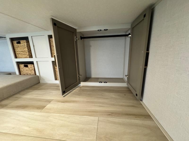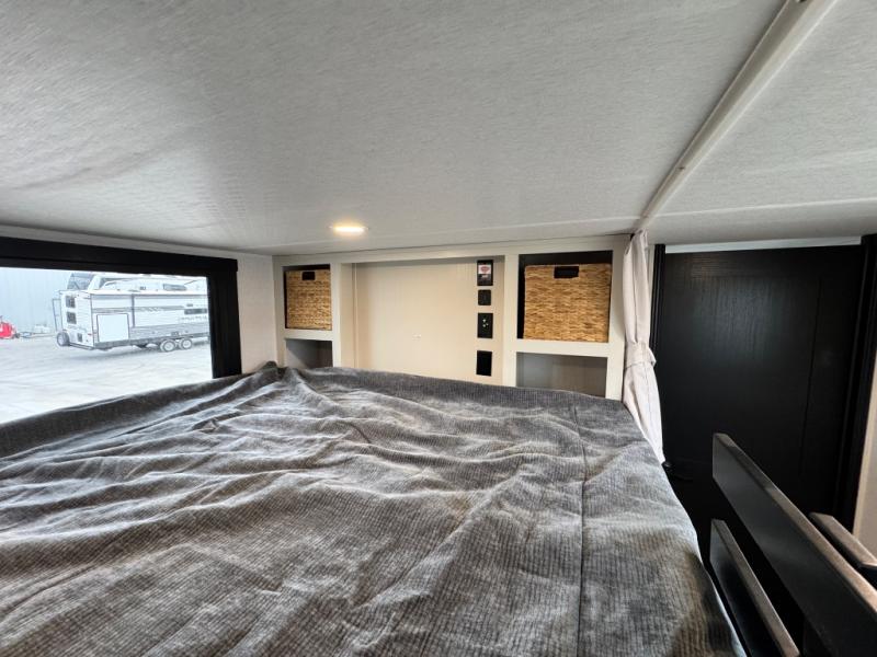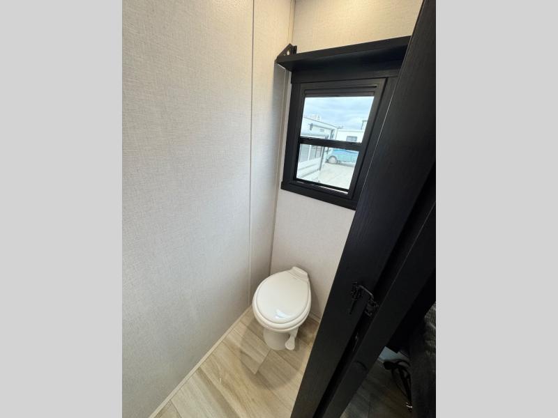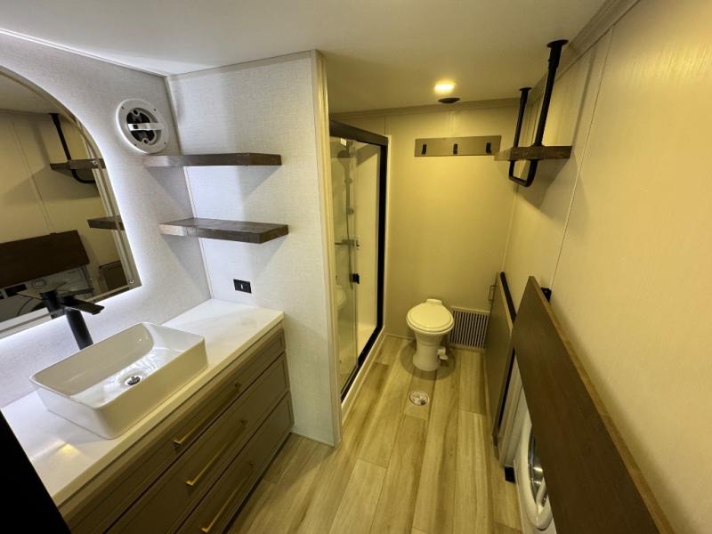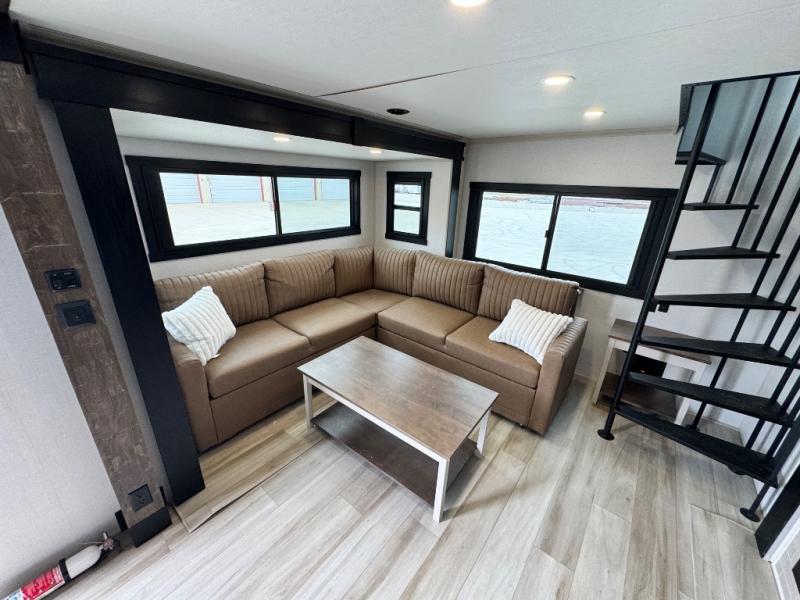 The 2025 Forest River Wildwood Heritage Glen ROOST43 is a groundbreaking fifth wheel that blends the spaciousness of a destination trailer with the mobility of a traditional RV, offering an impressive 530 square feet of living space. Designed for those seeking a home-like experience on the road, this innovative model features a unique combination of luxury, functionality, and versatility. Step inside to discover a warm and inviting living room with cozy furniture, a charming coffee table, and expansive sidewall skylight windows that flood the space with natural light while providing stunning views of the outdoors. The flat interior roofline enhances the open, airy feel, while a loft above the living area adds extra square footage—perfect for additional sleeping space or storage.