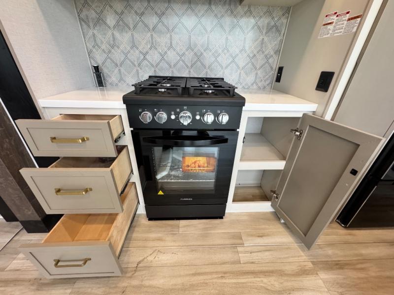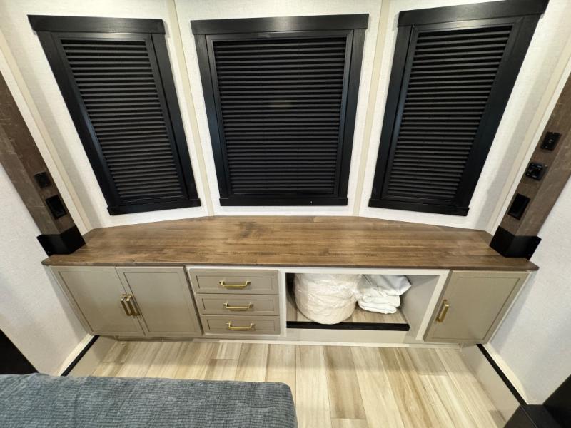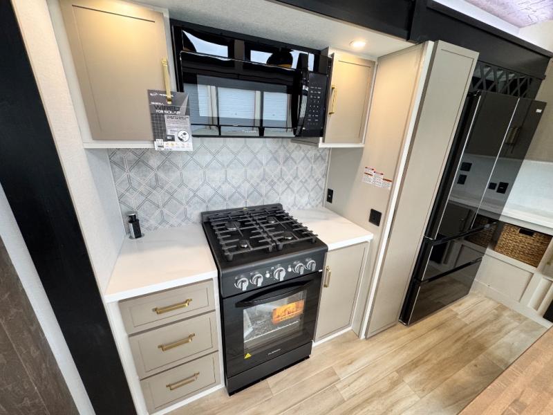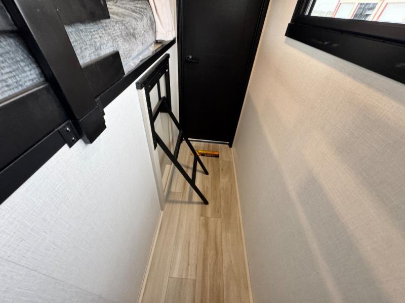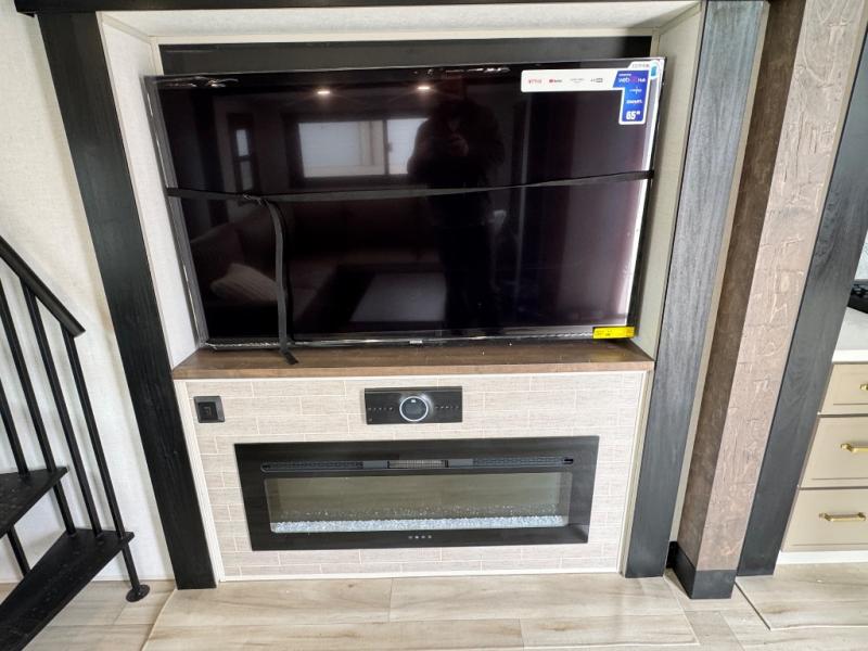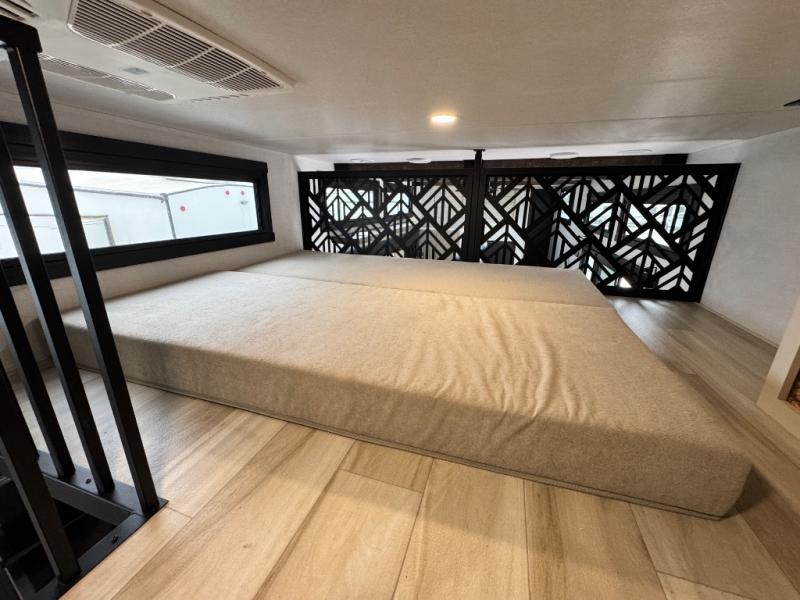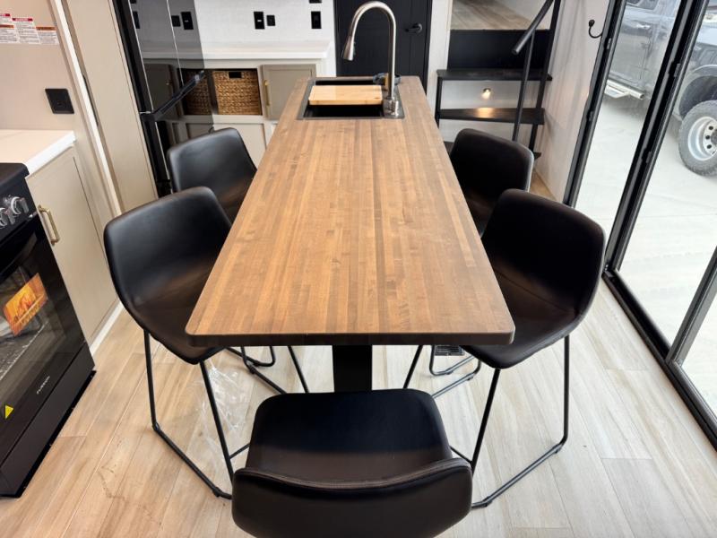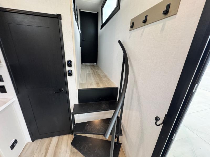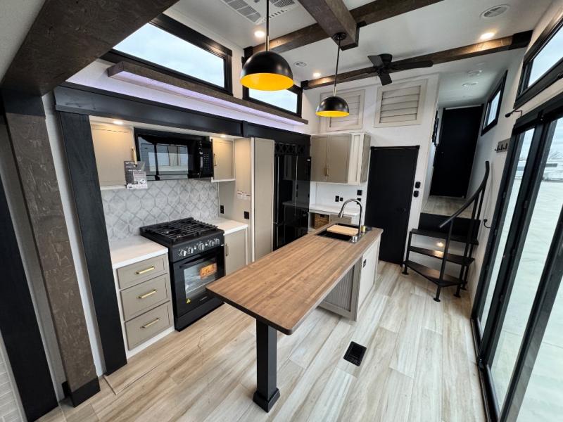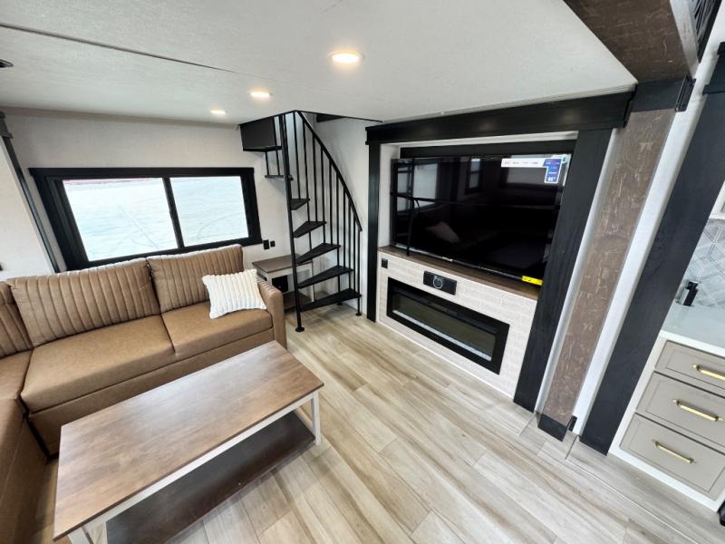 The ROOST43 boasts a residential-style kitchen with high-end solid surface and maple-stained wood countertops, a 24" 4-burner gas range, a 30" over-the-range microwave, and a sleek Gun Metal grey sink. The master bedroom features a 72" x 80" king bed slide-out, a 32" TV, a fireplace, a desk/vanity, and a convenient half bath. With a bath-and-a-half layout, a kitchen island, and triple patio doors leading to the outdoors, this fifth wheel is built for comfort and entertaining. Additional highlights include two lofts for extra sleeping capacity (sleeps up to 7-8), dual outdoor refrigerators, and motion sensor lights by the spiral staircases for added convenience.