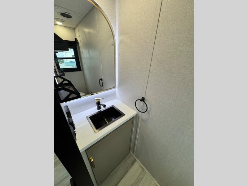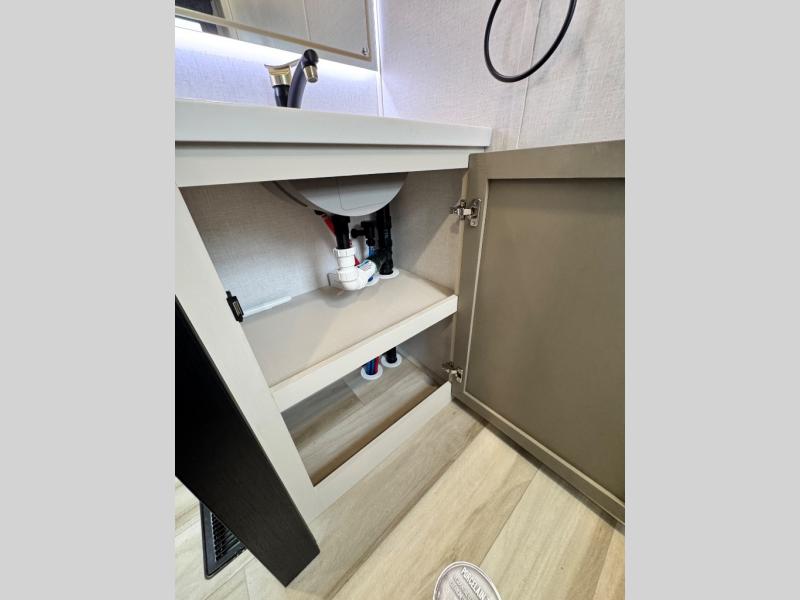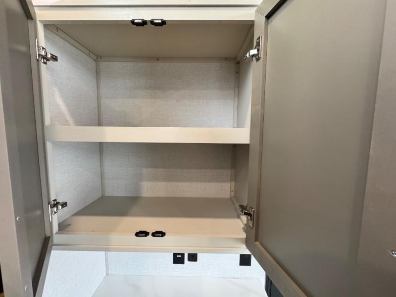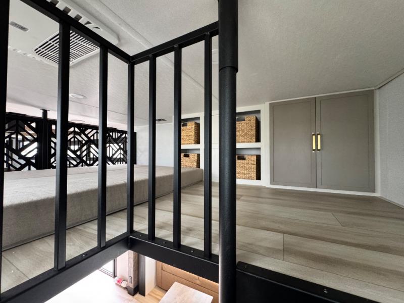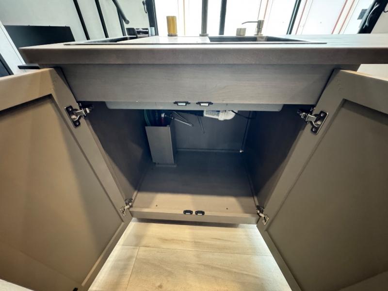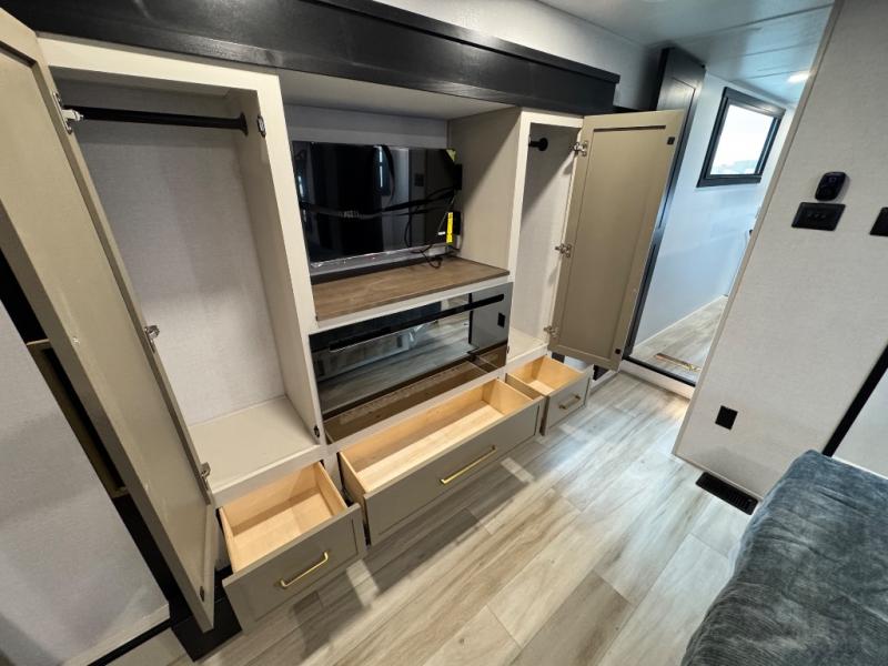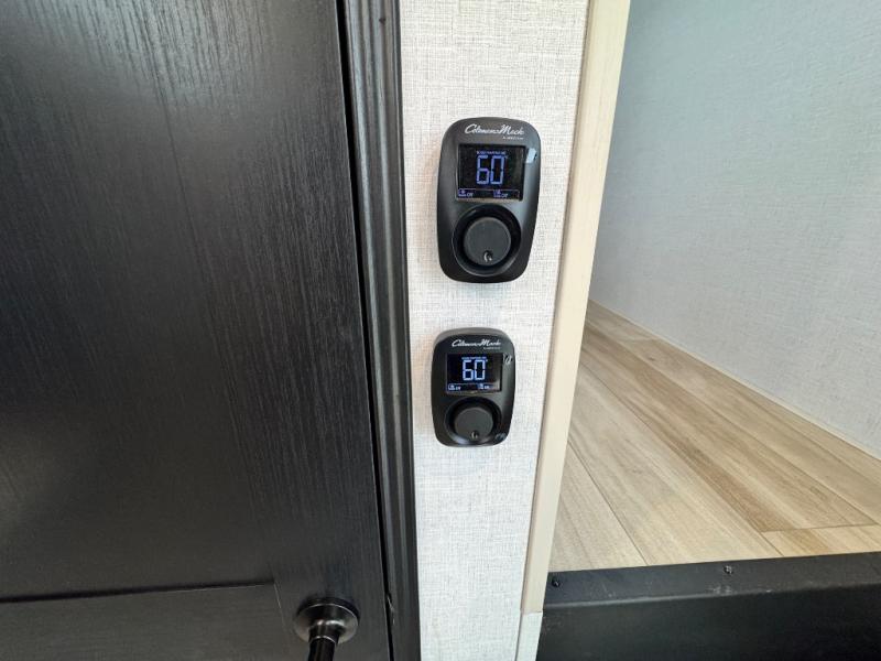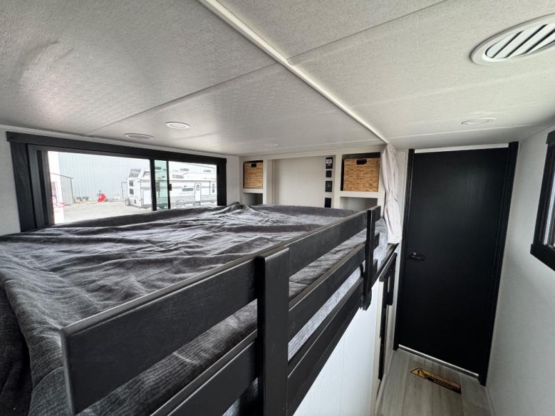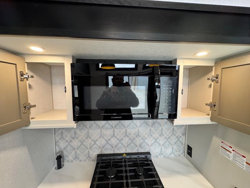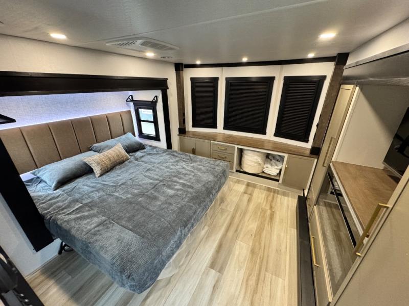 The ROOST43 boasts a residential-style kitchen with high-end solid surface and maple-stained wood countertops, a 24" 4-burner gas range, a 30" over-the-range microwave, and a sleek Gun Metal grey sink. The master bedroom features a 72" x 80" king bed slide-out, a 32" TV, a fireplace, a desk/vanity, and a convenient half bath. With a bath-and-a-half layout, a kitchen island, and triple patio doors leading to the outdoors, this fifth wheel is built for comfort and entertaining. Additional highlights include two lofts for extra sleeping capacity (sleeps up to 7-8), dual outdoor refrigerators, and motion sensor lights by the spiral staircases for added convenience.