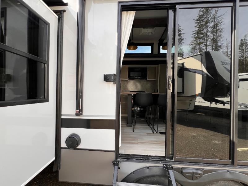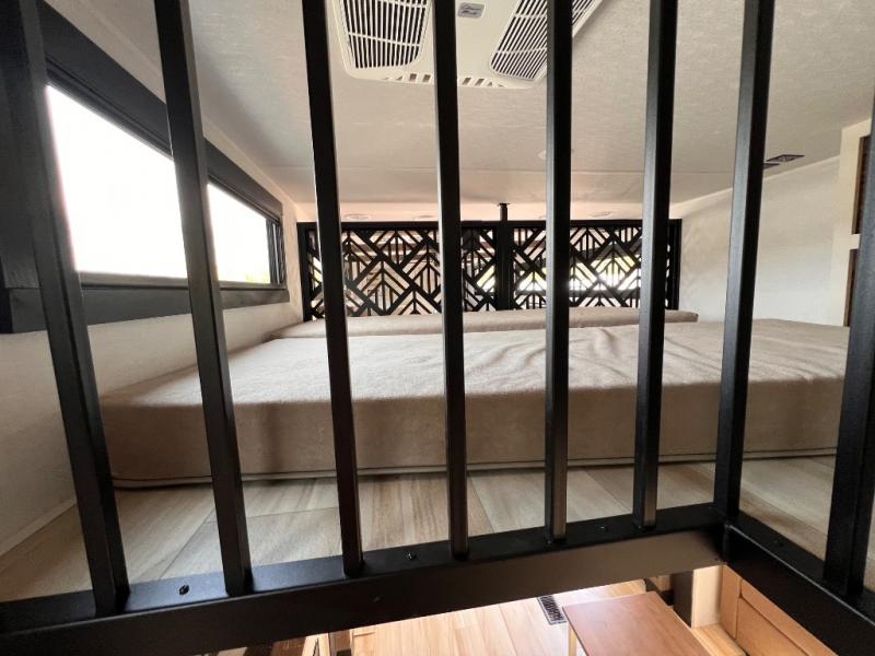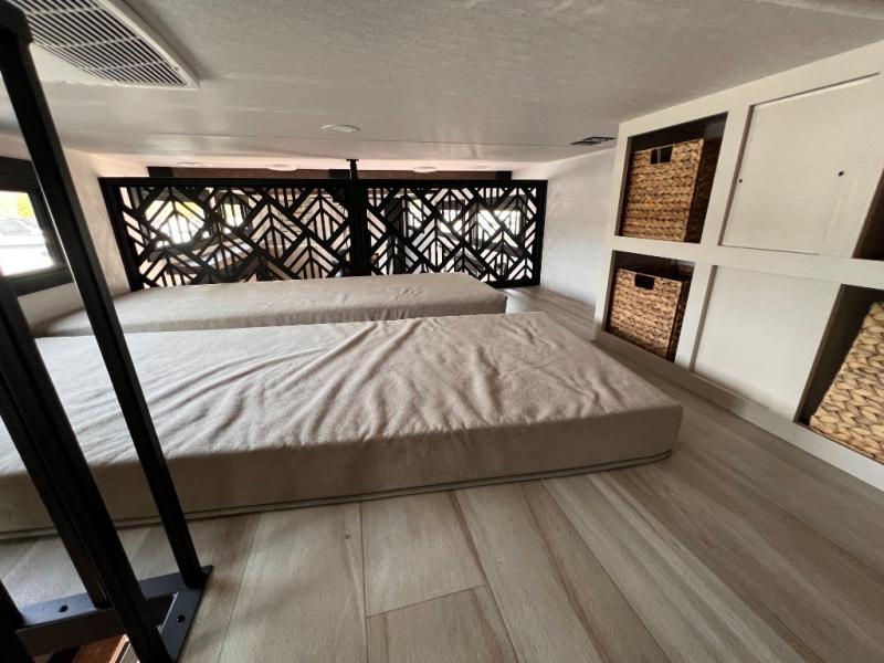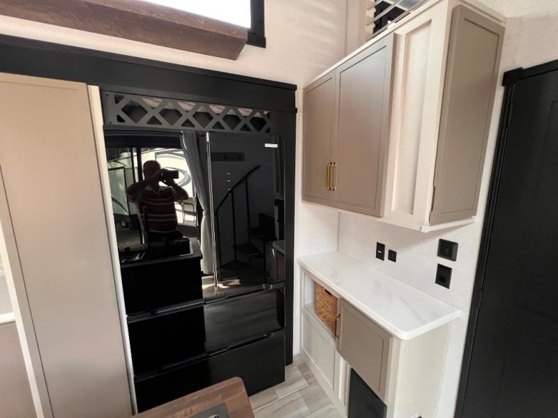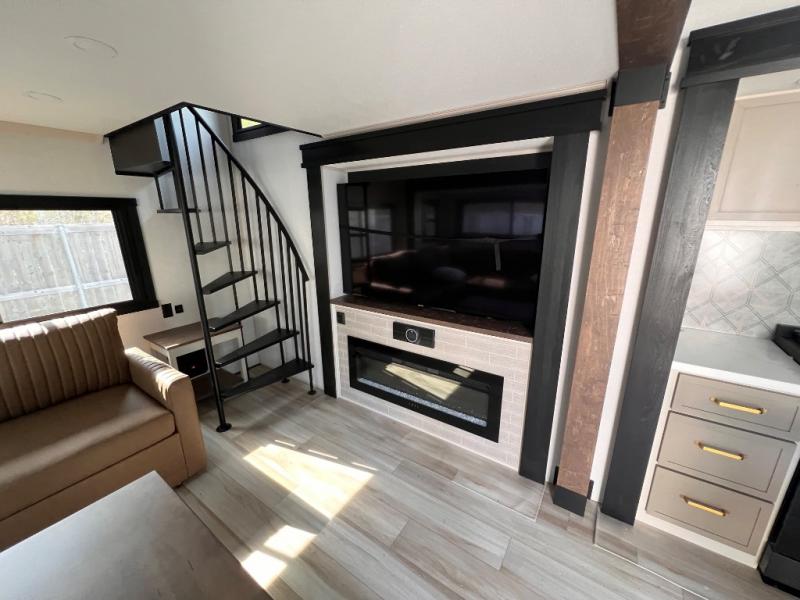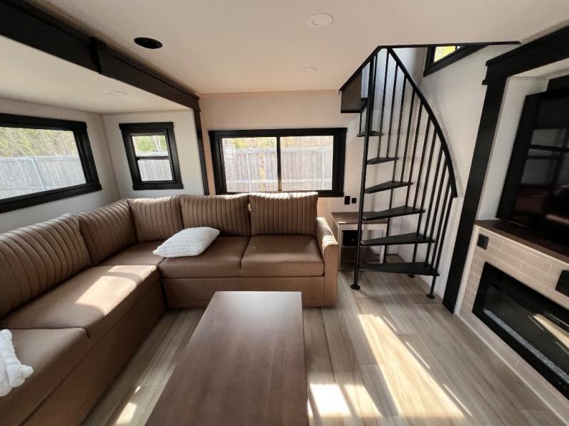 Introducing a new RV of its kind, the ROOST43 is a destination-style fifth wheel you are sure to love! There are two levels, making it feel more like home, and you can sleep six to eight each night. The master bedroom includes a custom king bed slide out, a 32" TV and fireplace, a desk/vanity, plus a half bath for convenience. A custom king-size bed is also found in the front loft, and there are storage cubbies plus a coax/110V outlet here to plug in chargers or a laptop. The second loft in the back includes spiral stairs, two bunk mats, a wardrobe, and cubby cubes here also for your guests' things. Some of the stand-out features you'll find on the first level are the sectional sofa with a coffee table, an entertainment center with a 65" TV, a kitchen island with five chairs, and a fully-equipped kitchen. The 20 cu. ft. 12V refrigerator and pull-out pantry will let you stock up on food, and the kitchen hutch will be perfect for nice dishes. The full bath on this model is one to remember; there is a one-piece fiberglass shower with a teak seat, a flip-up shelf and a washer/dryer, a backlit mirror, and more. And we haven't even touched on the exterior features, such as the pull-out tray, outdoor refrigerators, 20' awning, and more!