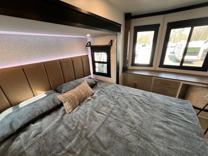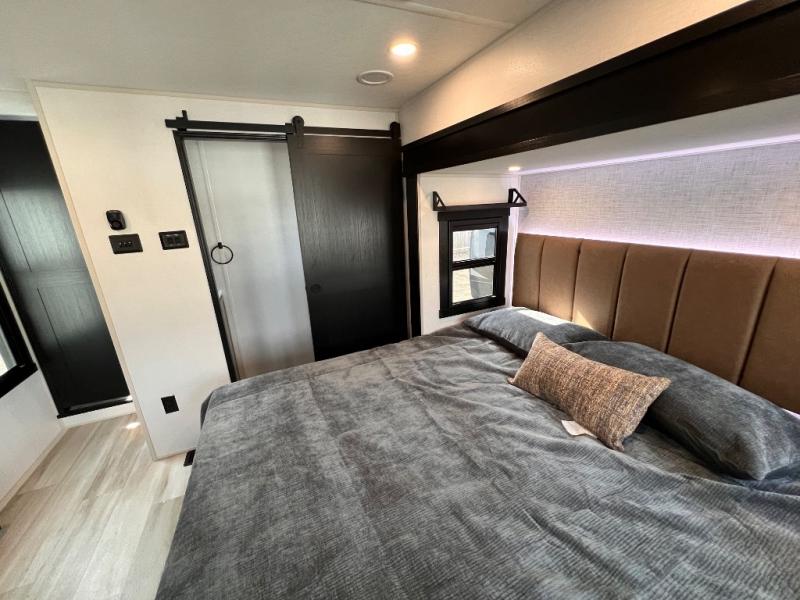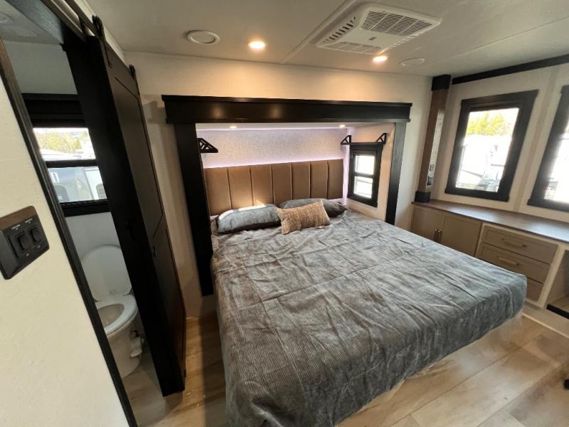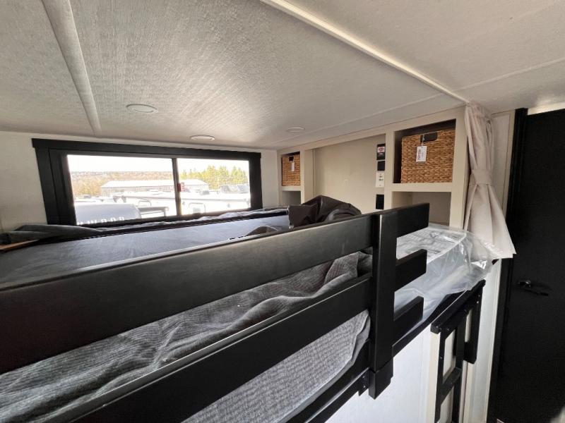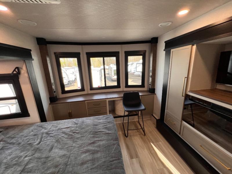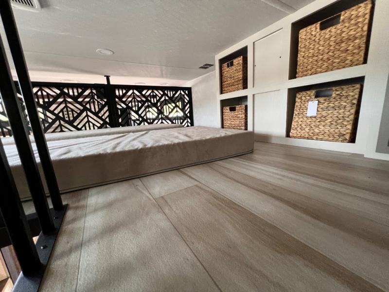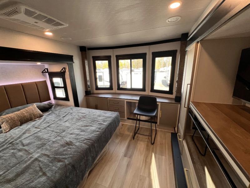 Introducing a new RV of its kind, the ROOST43 is a destination-style fifth wheel you are sure to love! There are two levels, making it feel more like home, and you can sleep six to eight each night. The master bedroom includes a custom king bed slide out, a 32" TV and fireplace, a desk/vanity, plus a half bath for convenience. A custom king-size bed is also found in the front loft, and there are storage cubbies plus a coax/110V outlet here to plug in chargers or a laptop. The second loft in the back includes spiral stairs, two bunk mats, a wardrobe, and cubby cubes here also for your guests' things. Some of the stand-out features you'll find on the first level are the sectional sofa with a coffee table, an entertainment center with a 65" TV, a kitchen island with five chairs, and a fully-equipped kitchen. The 20 cu. ft. 12V refrigerator and pull-out pantry will let you stock up on food, and the kitchen hutch will be perfect for nice dishes. The full bath on this model is one to remember; there is a one-piece fiberglass shower with a teak seat, a flip-up shelf and a washer/dryer, a backlit mirror, and more. And we haven't even touched on the exterior features, such as the pull-out tray, outdoor refrigerators, 20' awning, and more!