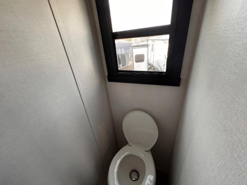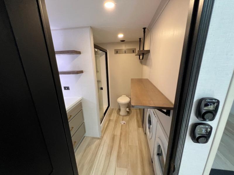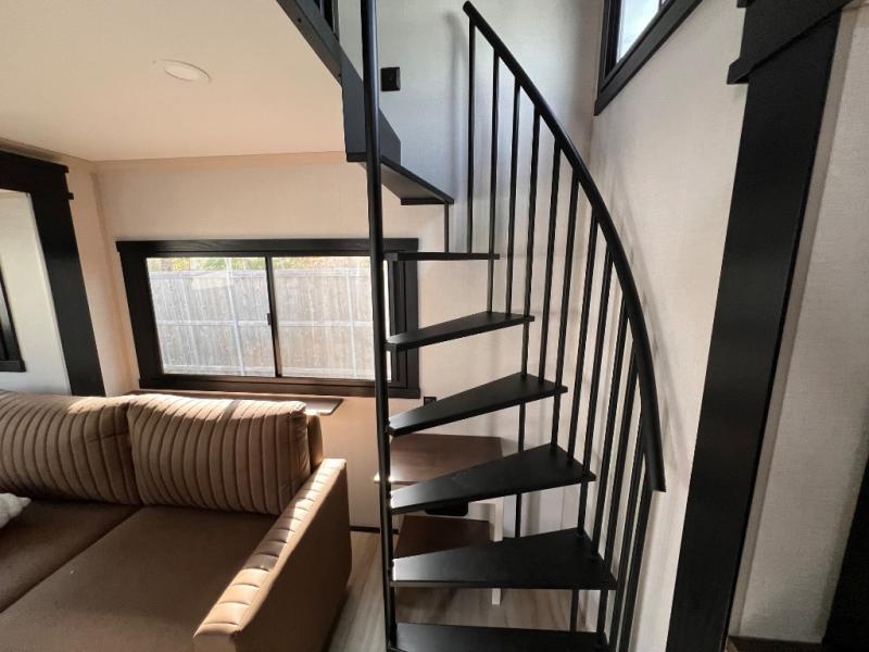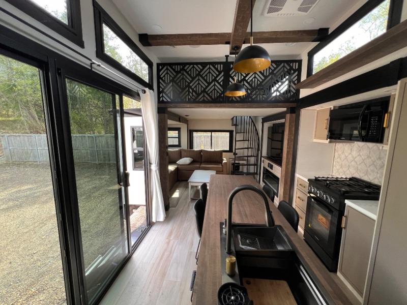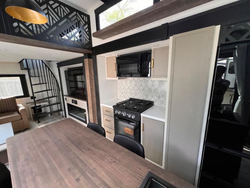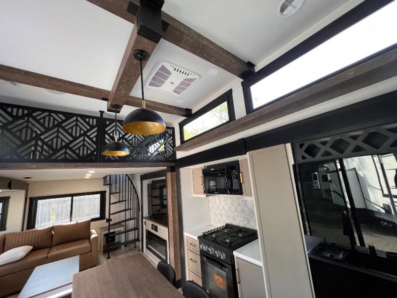 The Wildwood Heritage Glen ROOST fifth wheels resemble a destination trailer that will be giving you residential vibes! The premium Alley Grey high-gloss gel coat fiberglass sidewalls are ultra sleek, and the flat pitched roof sheds water to the off-door side for added comfort. A Race Track A/C duct system provides maximum cooling, and the AccessiBelly underbelly with 12V tank heaters on all holding tanks will help extend your camping season. There are high-end solid surface and maple-stained wood countertops inside, along with residential-inspired wood door casings, and 6' 8" clearance in all rooms, excluding lofts. Additional features include a Gun Metal grey kitchen sink, backlit mirrors in the bathrooms, motion sensor lights by the spiral stair cases, and back up camera prep if you want the option to make parking easier than ever.