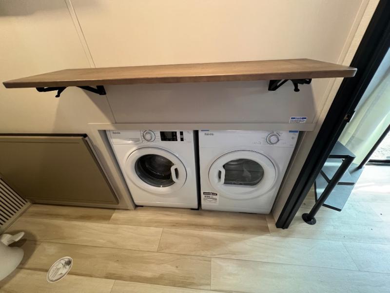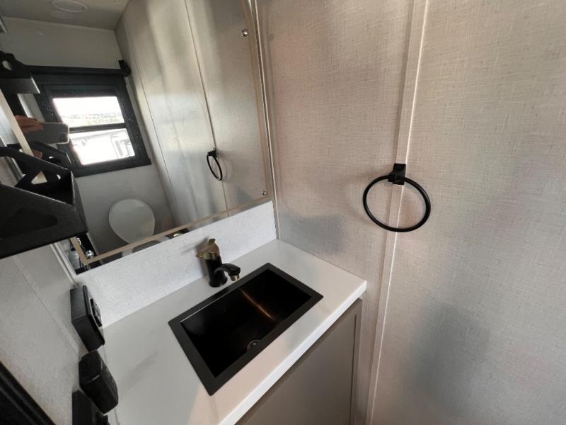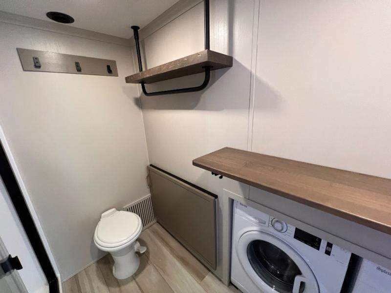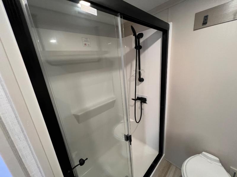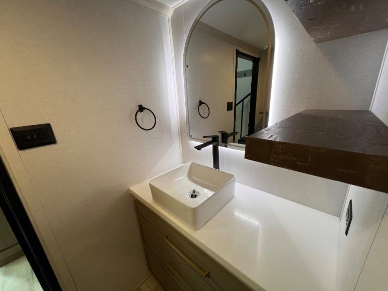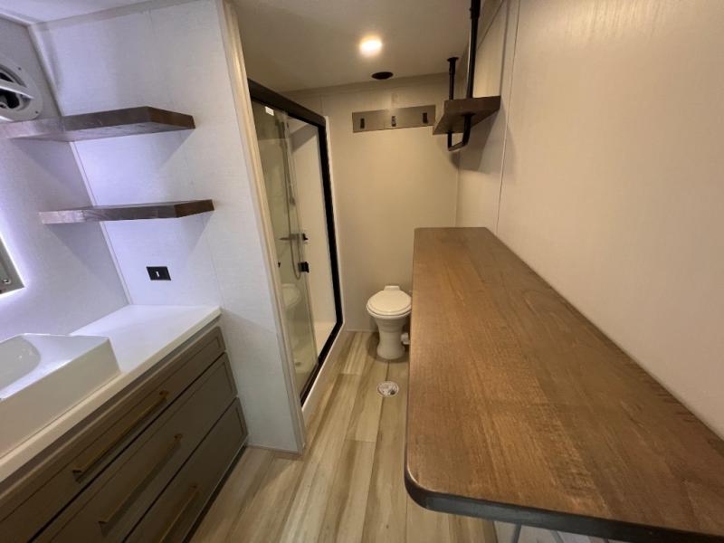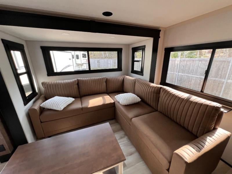 The Wildwood Heritage Glen ROOST fifth wheels resemble a destination trailer that will be giving you residential vibes! The premium Alley Grey high-gloss gel coat fiberglass sidewalls are ultra sleek, and the flat pitched roof sheds water to the off-door side for added comfort. A Race Track A/C duct system provides maximum cooling, and the AccessiBelly underbelly with 12V tank heaters on all holding tanks will help extend your camping season. There are high-end solid surface and maple-stained wood countertops inside, along with residential-inspired wood door casings, and 6' 8" clearance in all rooms, excluding lofts. Additional features include a Gun Metal grey kitchen sink, backlit mirrors in the bathrooms, motion sensor lights by the spiral stair cases, and back up camera prep if you want the option to make parking easier than ever.