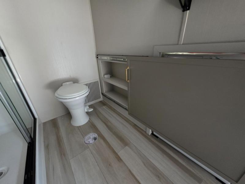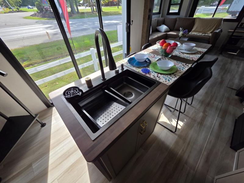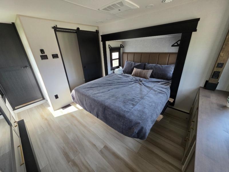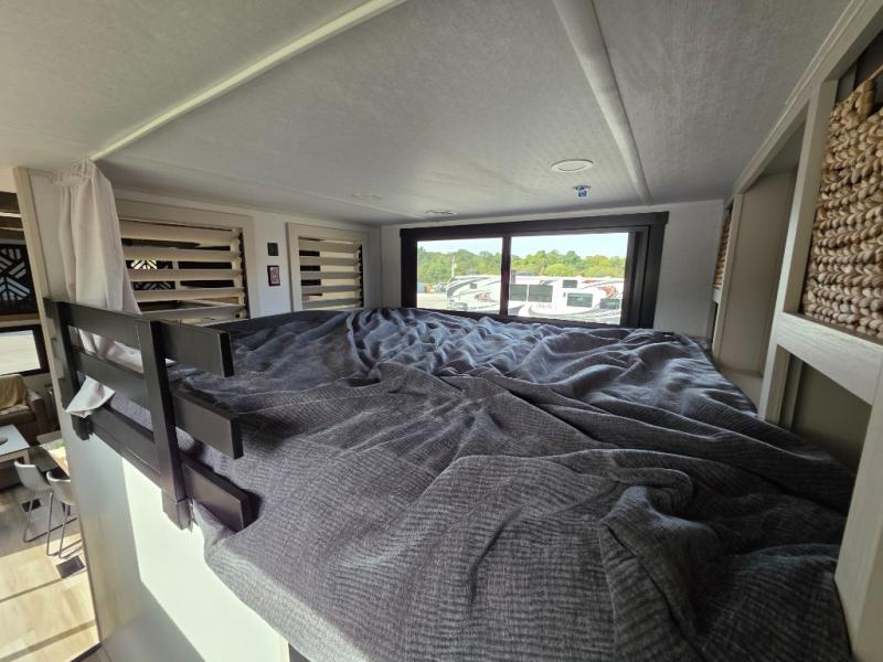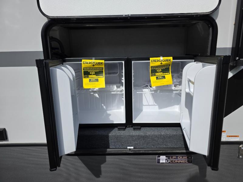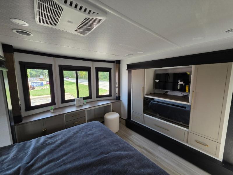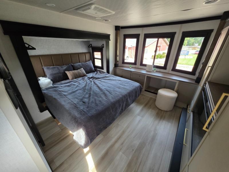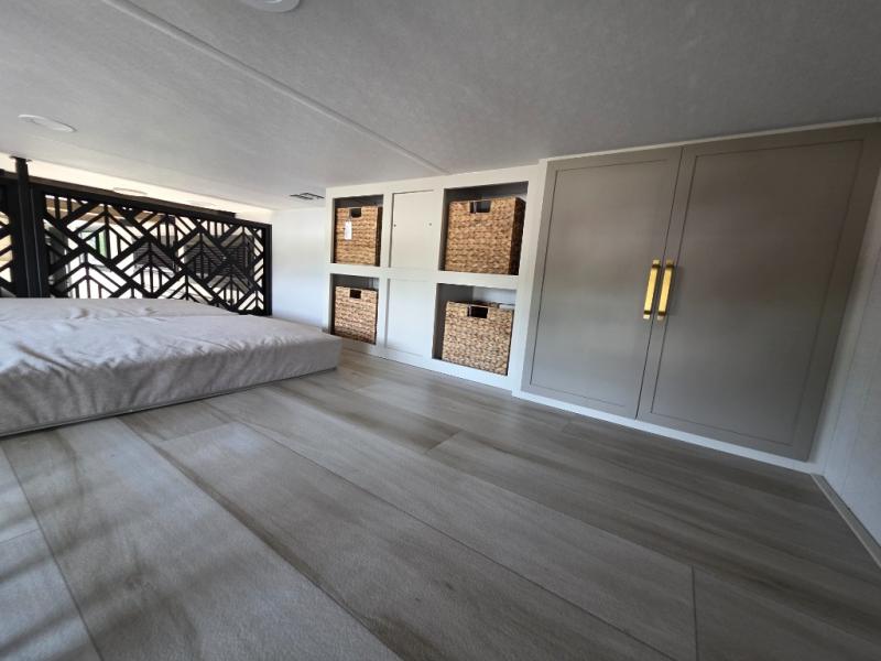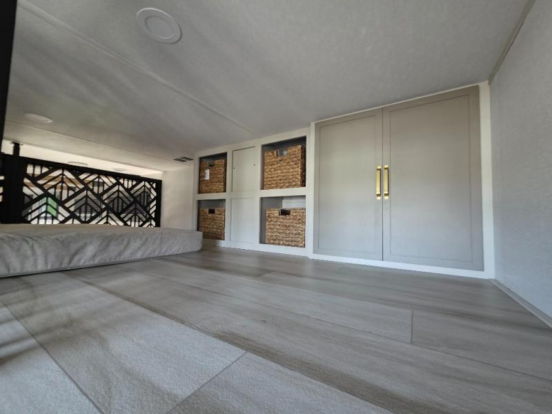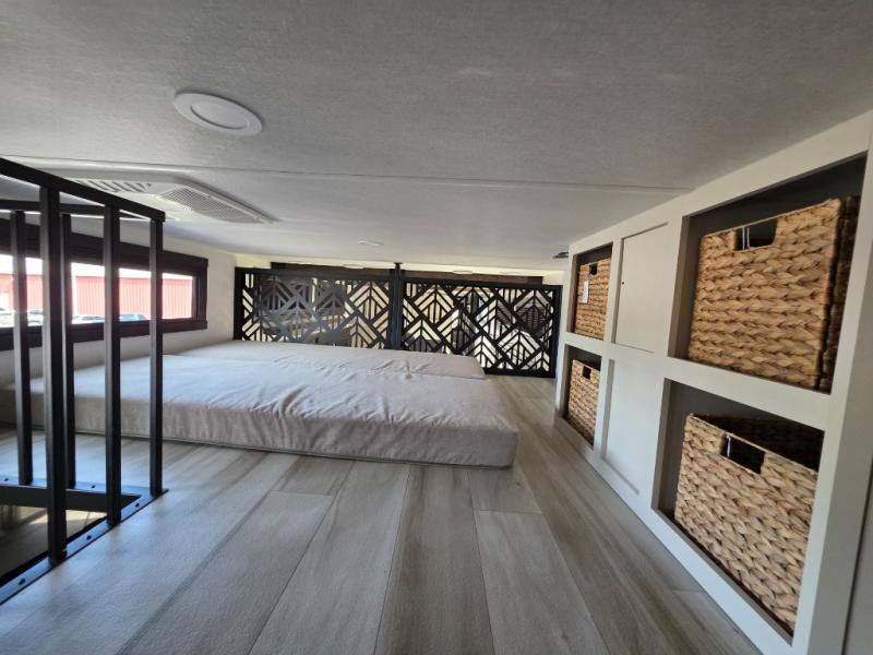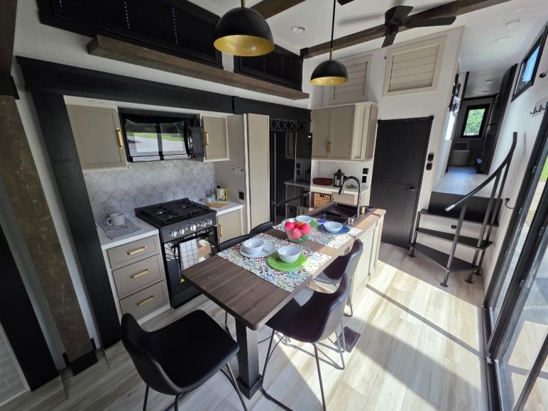 Introducing a new RV of its kind, the ROOST43 is a destination-style fifth wheel you are sure to love! There are two levels, making it feel more like home, and you can sleep six to eight each night. The master bedroom includes a custom king bed slide out, a 32" TV and fireplace, a desk/vanity, plus a half bath for convenience. A custom king-size bed is also found in the front loft, and there are storage cubbies plus a coax/110V outlet here to plug in chargers or a laptop. The second loft in the back includes spiral stairs, two bunk mats, a wardrobe, and cubby cubes here also for your guests' things. Some of the stand-out features you'll find on the first level are the sectional sofa with a coffee table, an entertainment center with a 65" TV, a kitchen island with five chairs, and a fully-equipped kitchen. The 20 cu. ft. 12V refrigerator and pull-out pantry will let you stock up on food, and the kitchen hutch will be perfect for nice dishes. The full bath on this model is one to remember; there is a one-piece fiberglass shower with a teak seat, a flip-up shelf and a washer/dryer, a backlit mirror, and more. And we haven't even touched on the exterior features, such as the pull-out tray, outdoor refrigerators, 20' awning, and more!