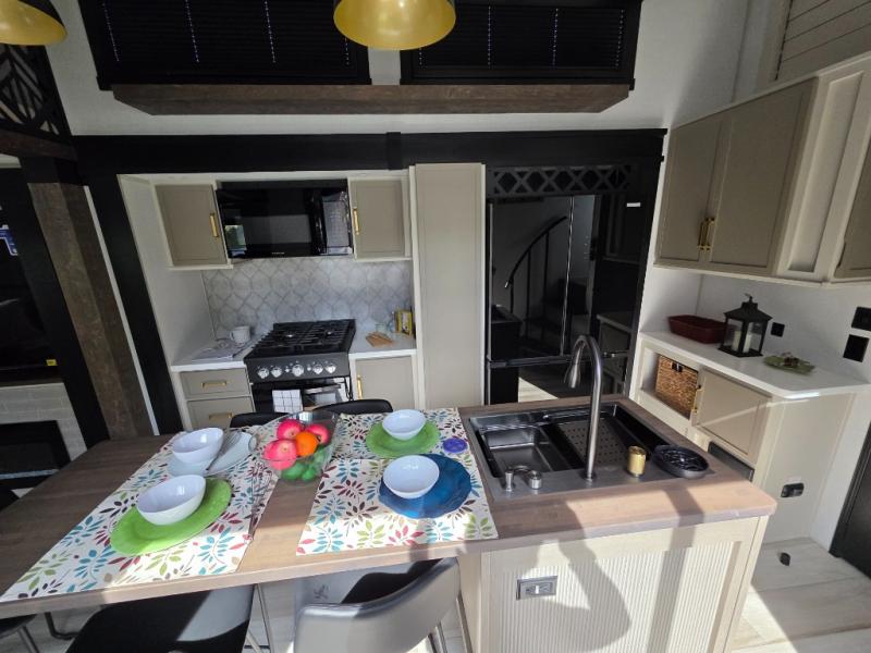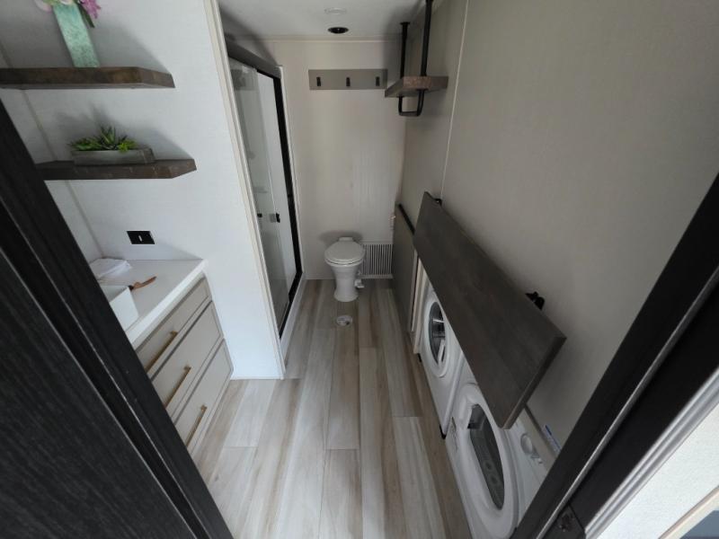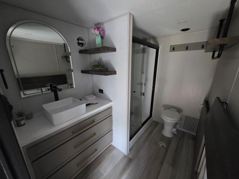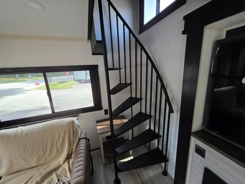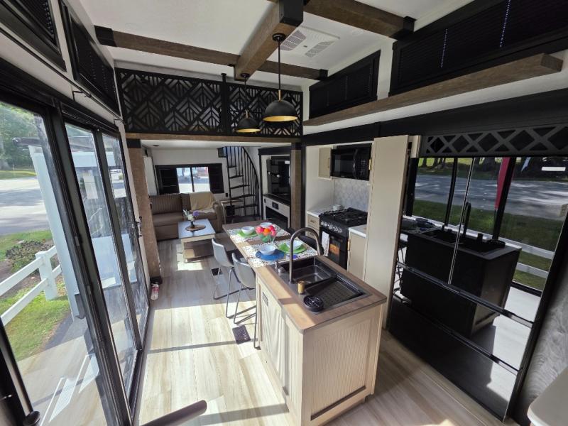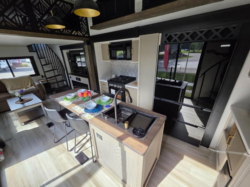 The Wildwood Heritage Glen ROOST fifth wheels resemble a destination trailer that will be giving you residential vibes! The premium Alley Grey high-gloss gel coat fiberglass sidewalls are ultra sleek, and the flat pitched roof sheds water to the off-door side for added comfort. A Race Track A/C duct system provides maximum cooling, and the AccessiBelly underbelly with 12V tank heaters on all holding tanks will help extend your camping season. There are high-end solid surface and maple-stained wood countertops inside, along with residential-inspired wood door casings, and 6' 8" clearance in all rooms, excluding lofts. Additional features include a Gun Metal grey kitchen sink, backlit mirrors in the bathrooms, motion sensor lights by the spiral stair cases, and back up camera prep if you want the option to make parking easier than ever.