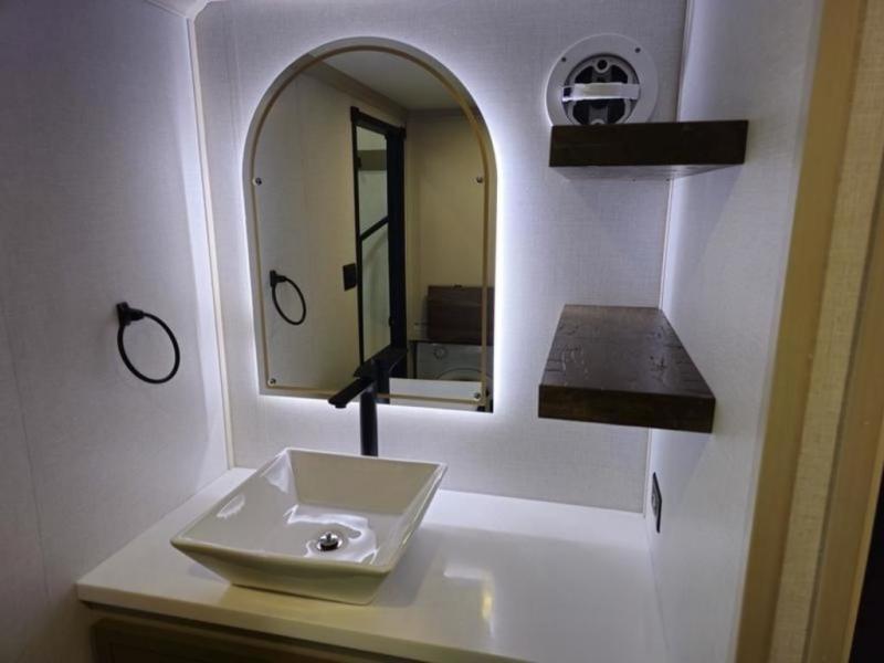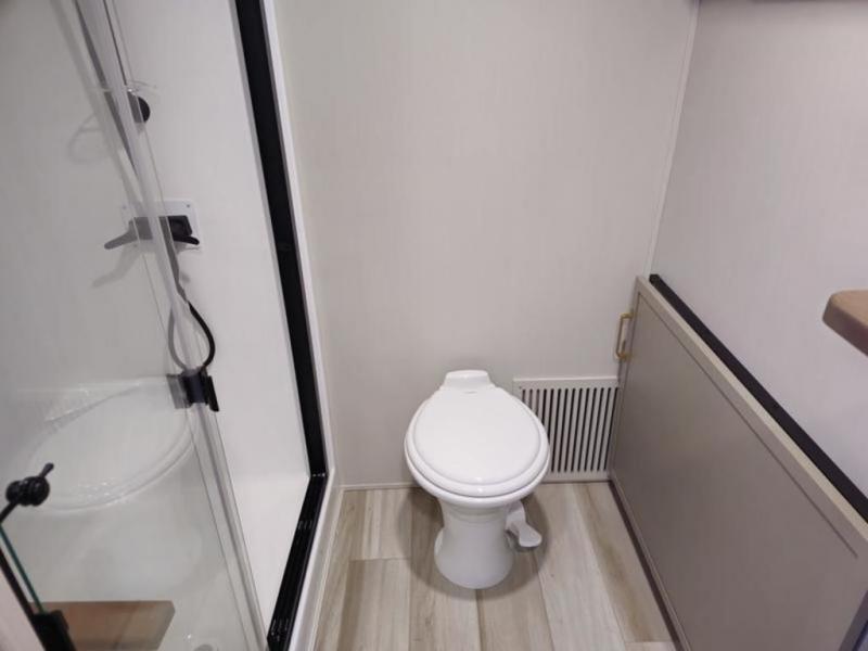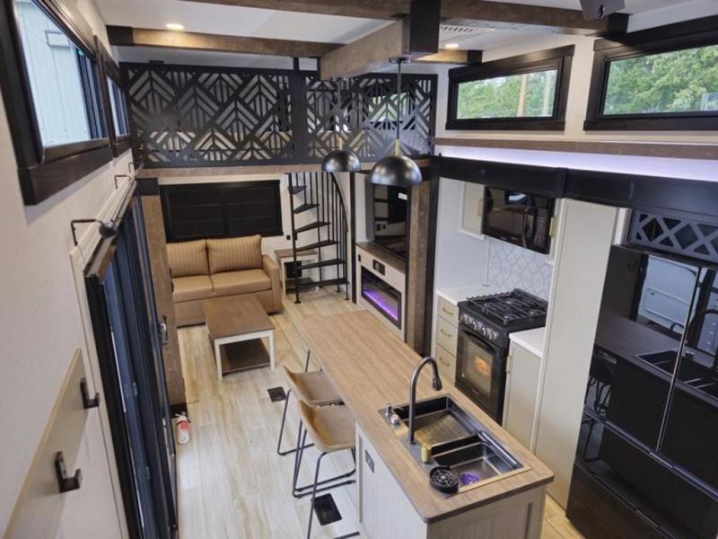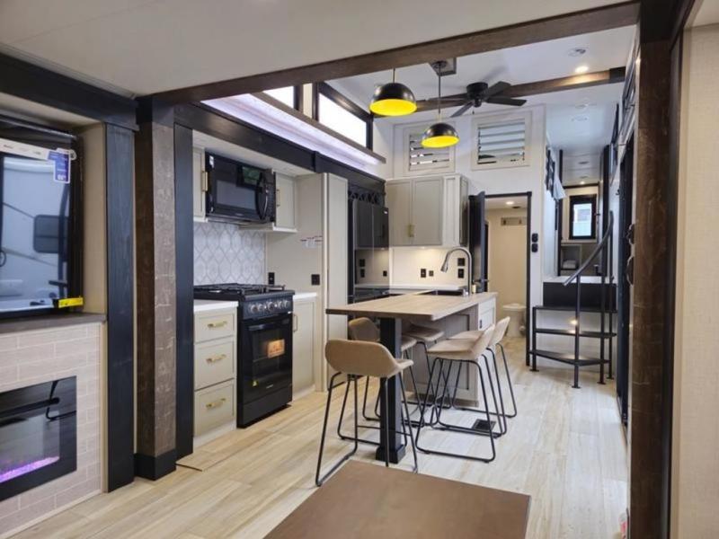 The Wildwood Heritage Glen ROOST fifth wheels resemble a destination trailer that will be giving you residential vibes! The premium Alley Grey high-gloss gel coat fiberglass sidewalls are ultra sleek, and the flat pitched roof sheds water to the off-door side for added comfort. A Race Track A/C duct system provides maximum cooling, and the AccessiBelly underbelly with 12V tank heaters on all holding tanks will help extend your camping season. There are high-end solid surface and maple-stained wood countertops inside, along with residential-inspired wood door casings, and 6' 8" clearance in all rooms, excluding lofts. Additional features include a Gun Metal grey kitchen sink, backlit mirrors in the bathrooms, motion sensor lights by the spiral stair cases, and back up camera prep if you want the option to make parking easier than ever.