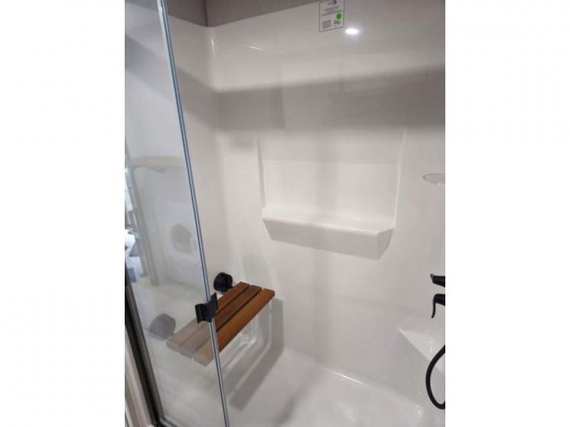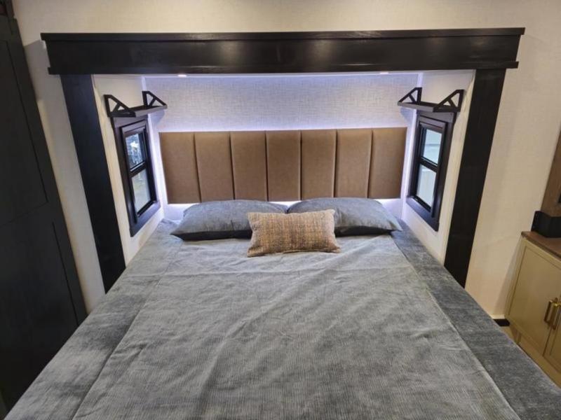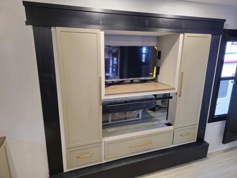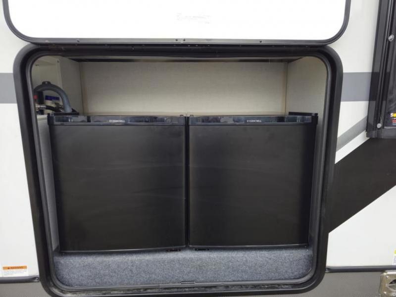 Introducing a new RV of its kind, the ROOST43 is a destination-style fifth wheel you are sure to love! There are two levels, making it feel more like home, and you can sleep six to eight each night. The master bedroom includes a custom king bed slide out, a 32" TV and fireplace, a desk/vanity, plus a half bath for convenience. A custom king-size bed is also found in the front loft, and there are storage cubbies plus a coax/110V outlet here to plug in chargers or a laptop. The second loft in the back includes spiral stairs, two bunk mats, a wardrobe, and cubby cubes here also for your guests' things. Some of the stand-out features you'll find on the first level are the sectional sofa with a coffee table, an entertainment center with a 65" TV, a kitchen island with five chairs, and a fully-equipped kitchen. The 20 cu. ft. 12V refrigerator and pull-out pantry will let you stock up on food, and the kitchen hutch will be perfect for nice dishes. The full bath on this model is one to remember; there is a one-piece fiberglass shower with a teak seat, a flip-up shelf and a washer/dryer, a backlit mirror, and more. And we haven't even touched on the exterior features, such as the pull-out tray, outdoor refrigerators, 20' awning, and more!
