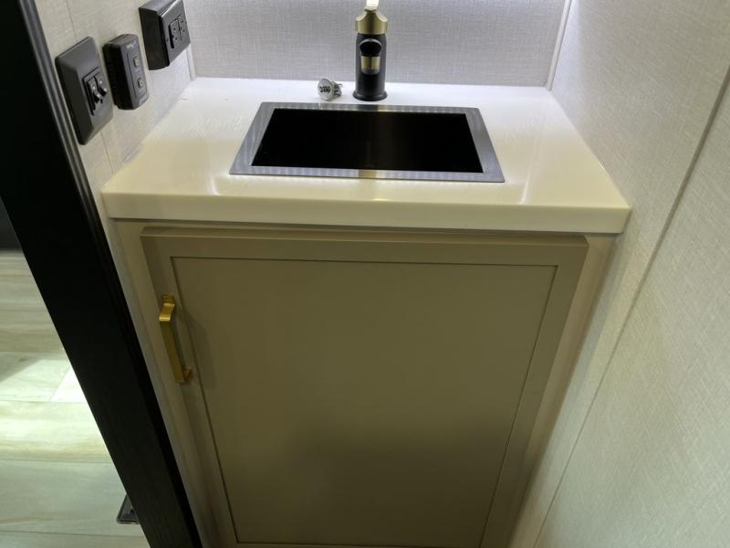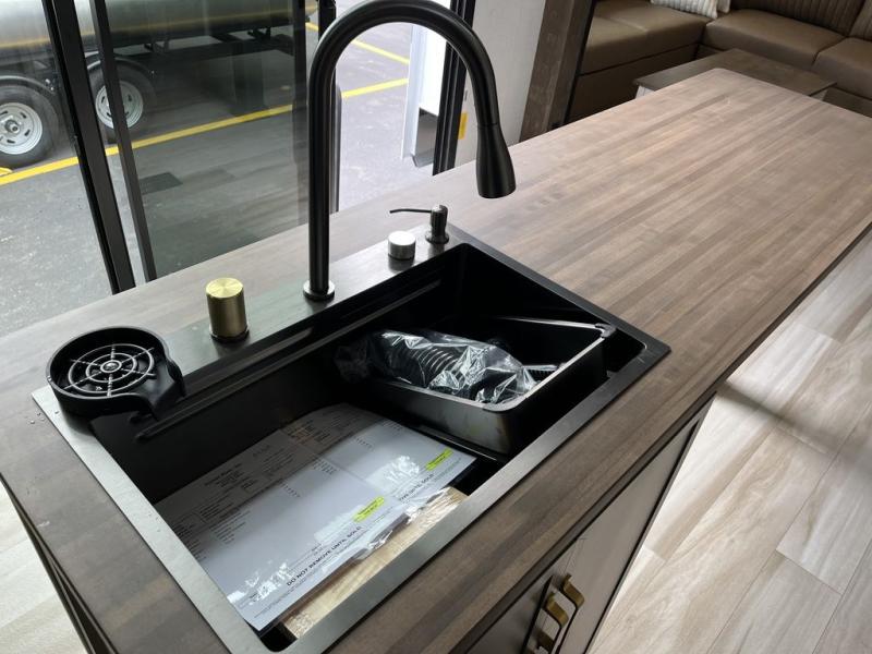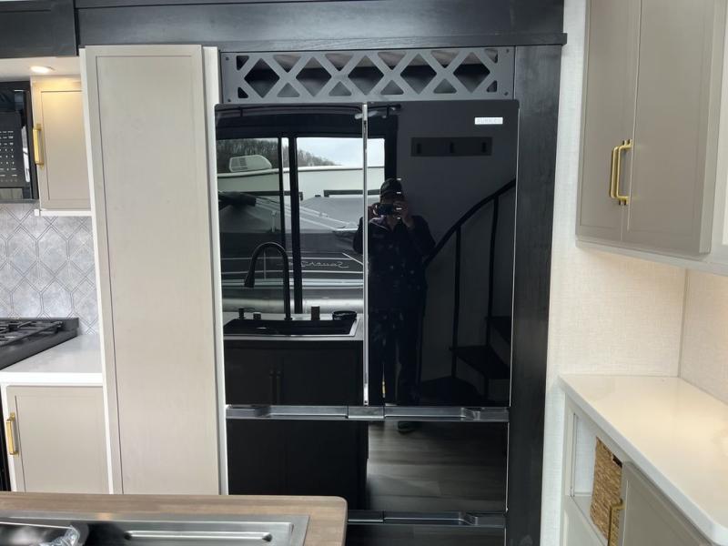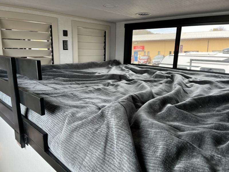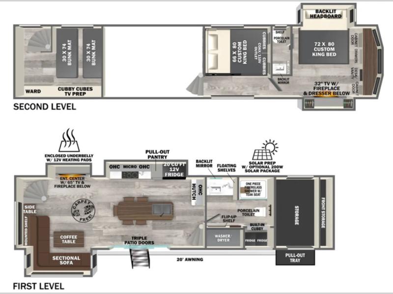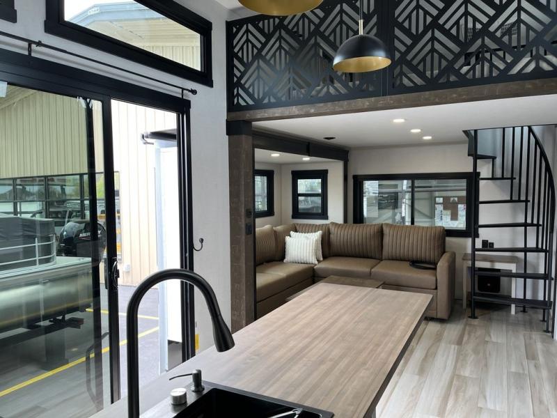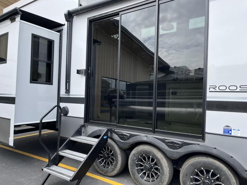 Introducing a new RV of its kind, the ROOST43 is a destination-style fifth wheel you are sure to love! There are two levels, making it feel more like home, and you can sleep six to eight each night. The master bedroom includes a custom king bed slide out, a 32" TV and fireplace, a desk/vanity, plus a half bath for convenience. A custom king-size bed is also found in the front loft, and there are storage cubbies plus a coax/110V outlet here to plug in chargers or a laptop. The second loft in the back includes spiral stairs, two bunk mats, a wardrobe, and cubby cubes here also for your guests' things. Some of the stand-out features you'll find on the first level are the sectional sofa with a coffee table, an entertainment center with a 65" TV, a kitchen island with five chairs, and a fully-equipped kitchen. The 20 cu. ft. 12V refrigerator and pull-out pantry will let you stock up on food, and the kitchen hutch will be perfect for nice dishes. The full bath on this model is one to remember; there is a one-piece fiberglass shower with a teak seat, a flip-up shelf and a washer/dryer, a backlit mirror, and more. And we haven't even touched on the exterior features, such as the pull-out tray, outdoor refrigerators, 20' awning, and more!