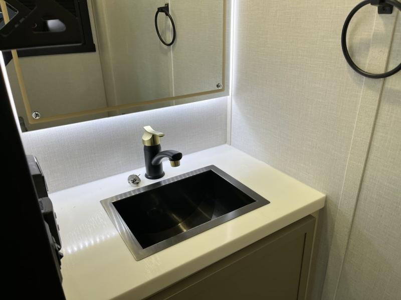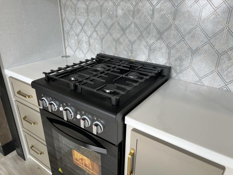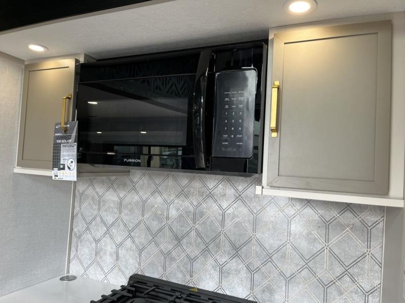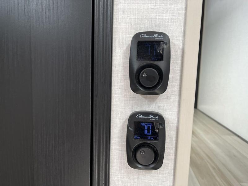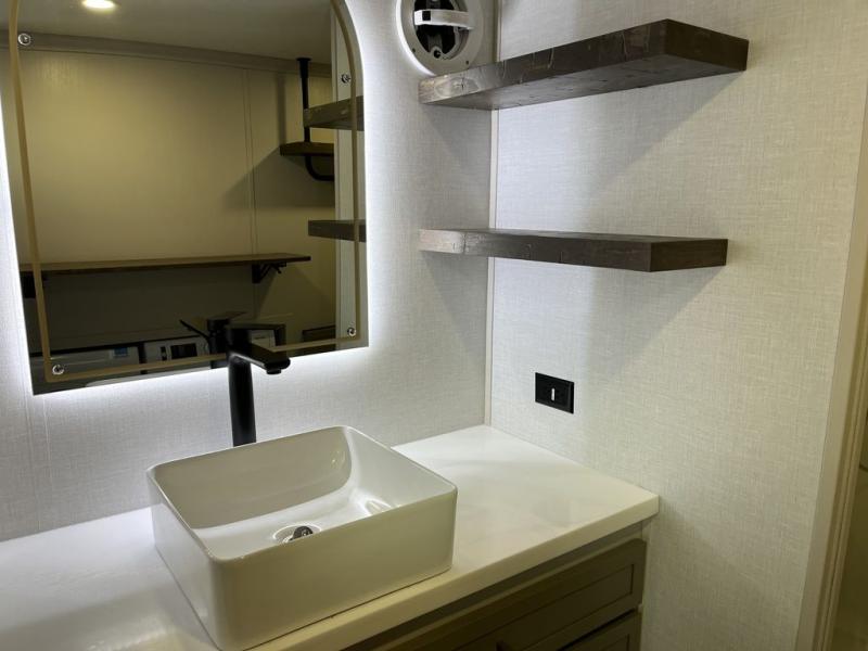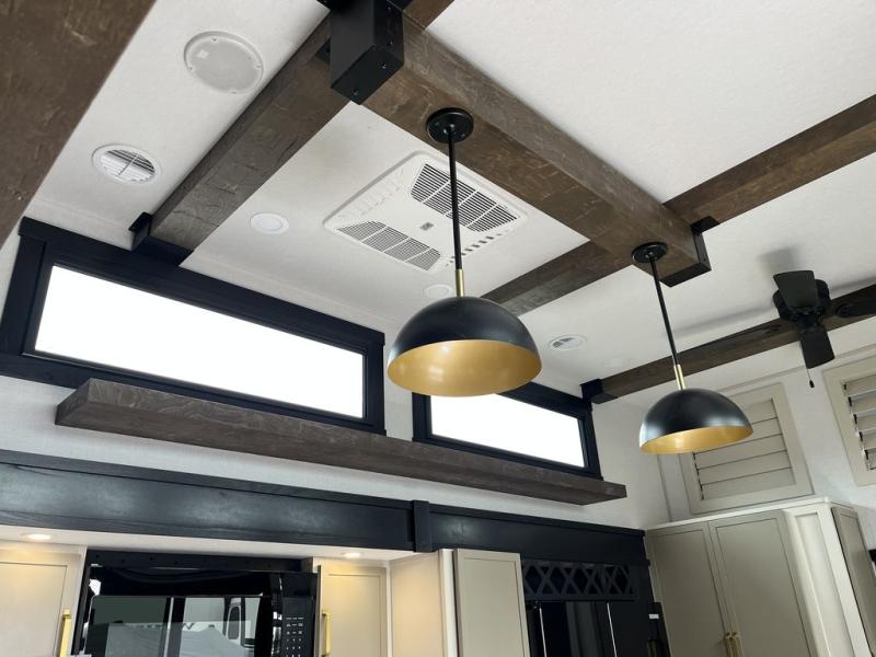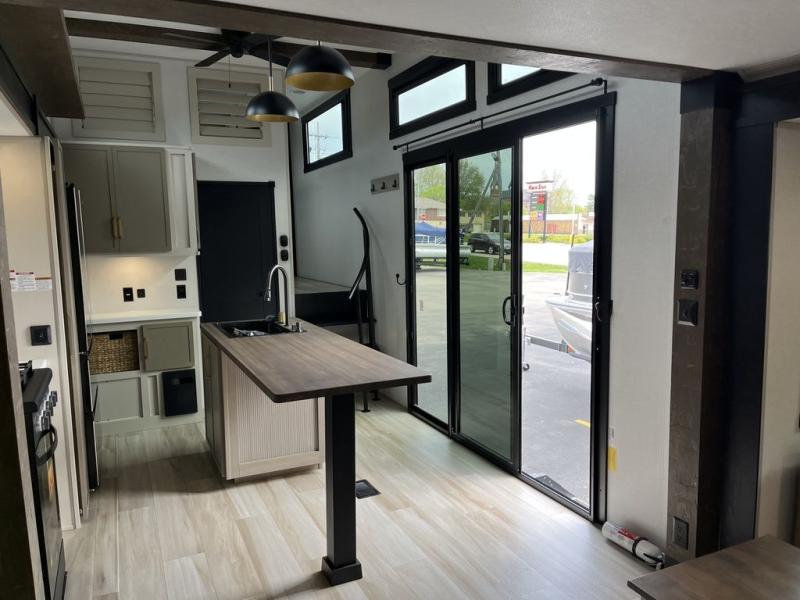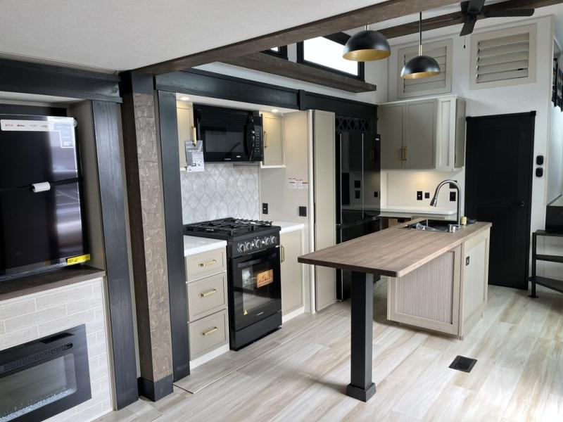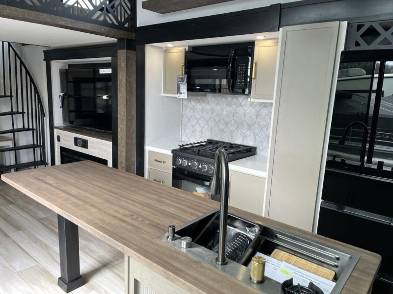 The Wildwood Heritage Glen ROOST fifth wheels resemble a destination trailer that will be giving you residential vibes! The premium Alley Grey high-gloss gel coat fiberglass sidewalls are ultra sleek, and the flat pitched roof sheds water to the off-door side for added comfort. A Race Track A/C duct system provides maximum cooling, and the AccessiBelly underbelly with 12V tank heaters on all holding tanks will help extend your camping season. There are high-end solid surface and maple-stained wood countertops inside, along with residential-inspired wood door casings, and 6' 8" clearance in all rooms, excluding lofts. Additional features include a Gun Metal grey kitchen sink, backlit mirrors in the bathrooms, motion sensor lights by the spiral stair cases, and back up camera prep if you want the option to make parking easier than ever.