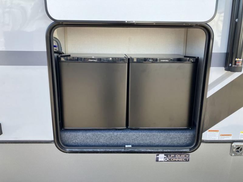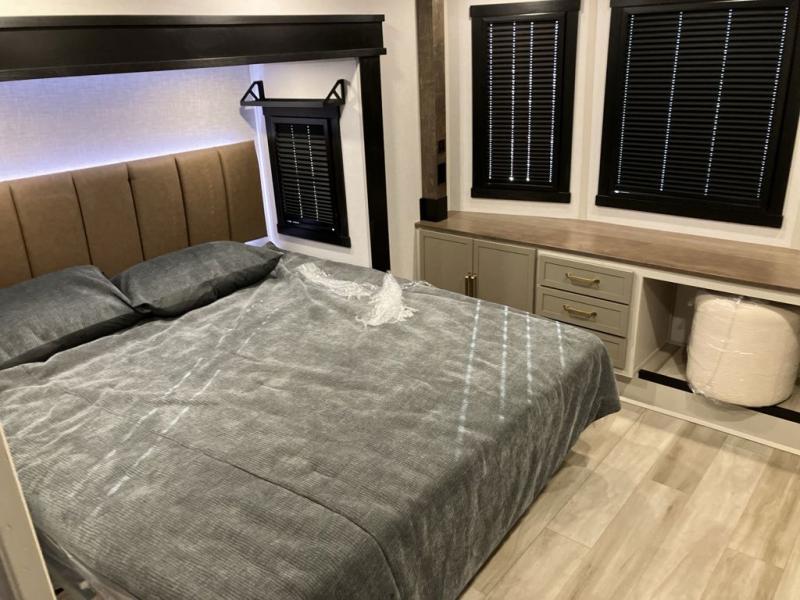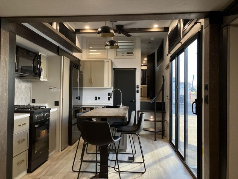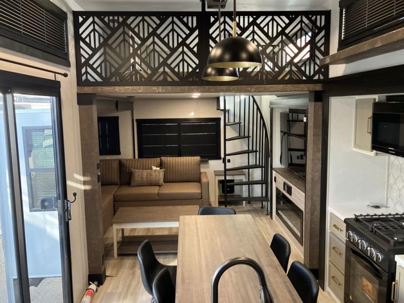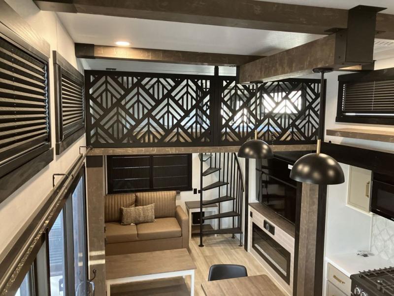 Introducing a new RV of its kind, the ROOST43 is a destination-style fifth wheel you are sure to love! There are two levels, making it feel more like home, and you can sleep six to eight each night. The master bedroom includes a custom king bed slide out, a 32" TV and fireplace, a desk/vanity, plus a half bath for convenience. A custom king-size bed is also found in the front loft, and there are storage cubbies plus a coax/110V outlet here to plug in chargers or a laptop. The second loft in the back includes spiral stairs, two bunk mats, a wardrobe, and cubby cubes here also for your guests' things. Some of the stand-out features you'll find on the first level are the sectional sofa with a coffee table, an entertainment center with a 65" TV, a kitchen island with five chairs, and a fully-equipped kitchen. The 20 cu. ft. 12V refrigerator and pull-out pantry will let you stock up on food, and the kitchen hutch will be perfect for nice dishes. The full bath on this model is one to remember; there is a one-piece fiberglass shower with a teak seat, a flip-up shelf and a washer/dryer, a backlit mirror, and more. And we haven't even touched on the exterior features, such as the pull-out tray, outdoor refrigerators, 20' awning, and more!