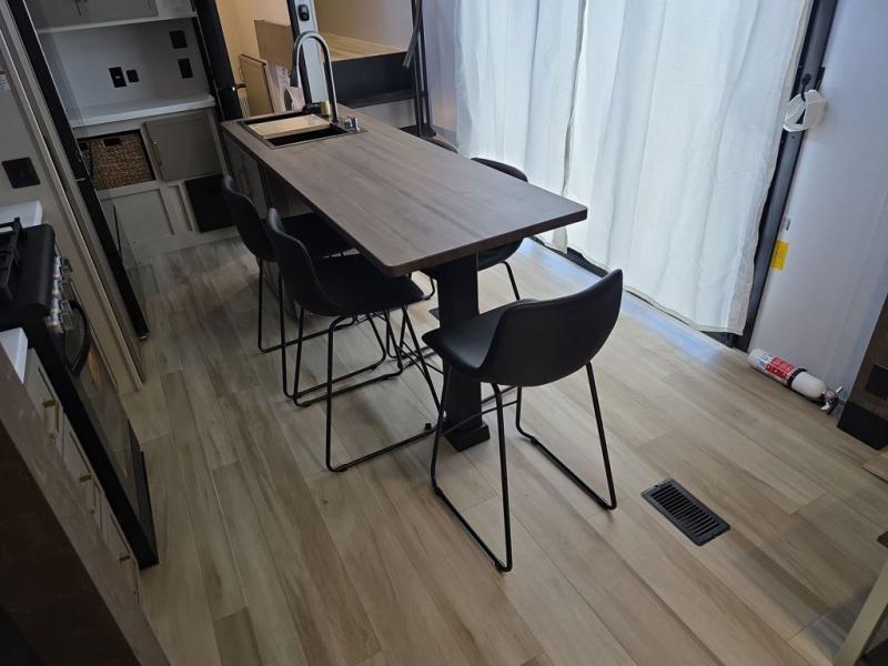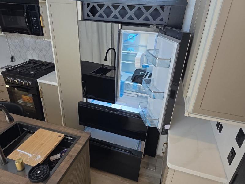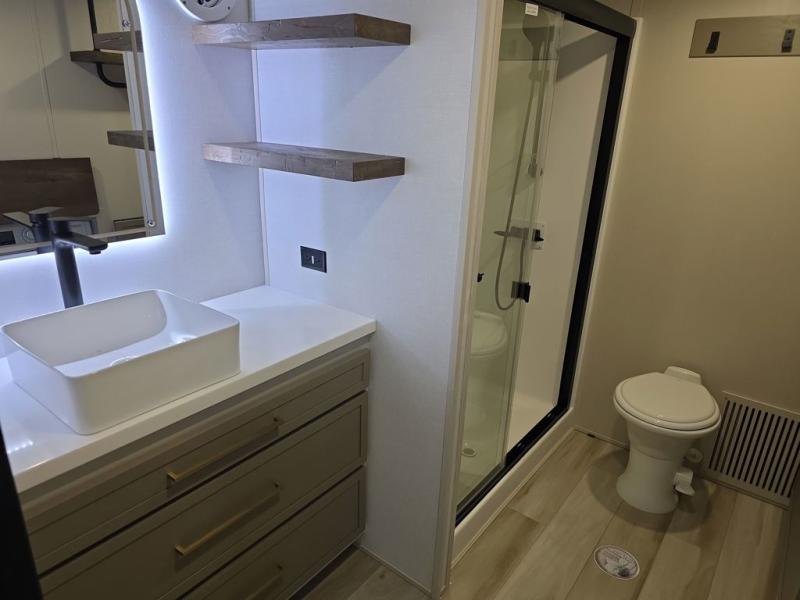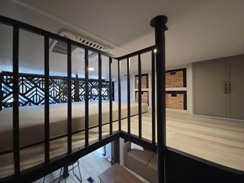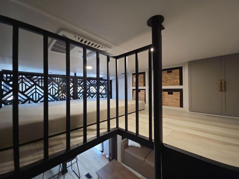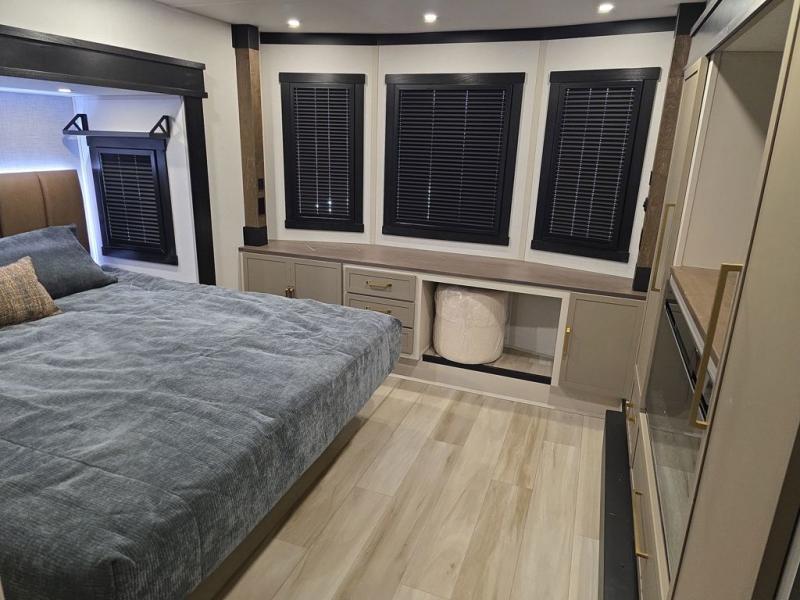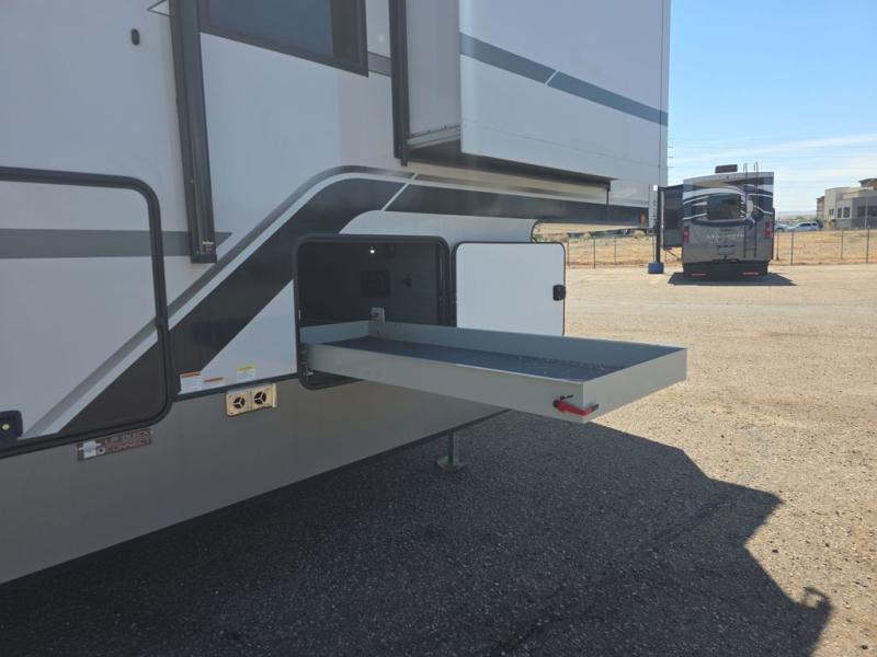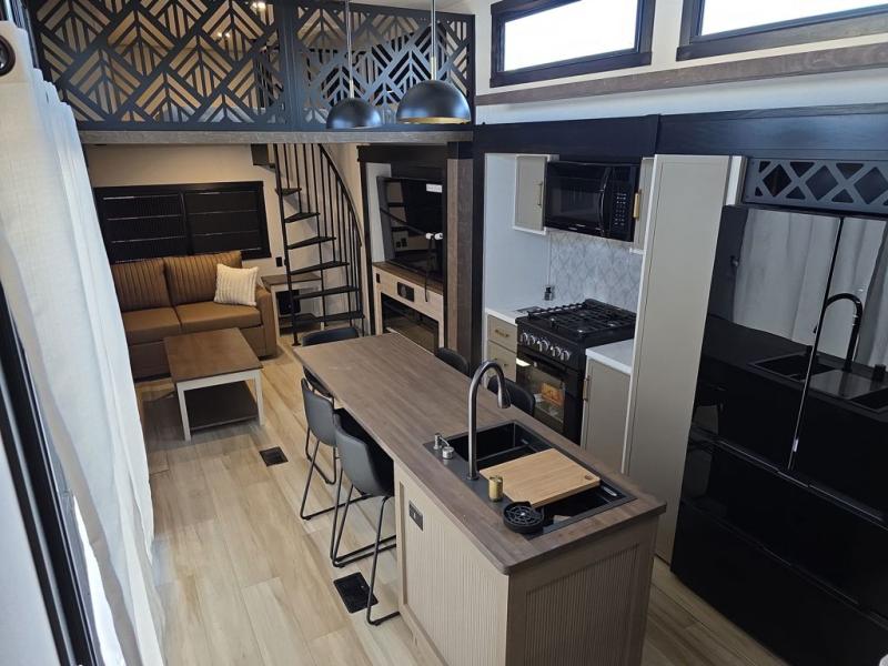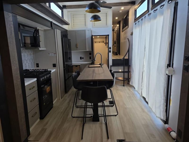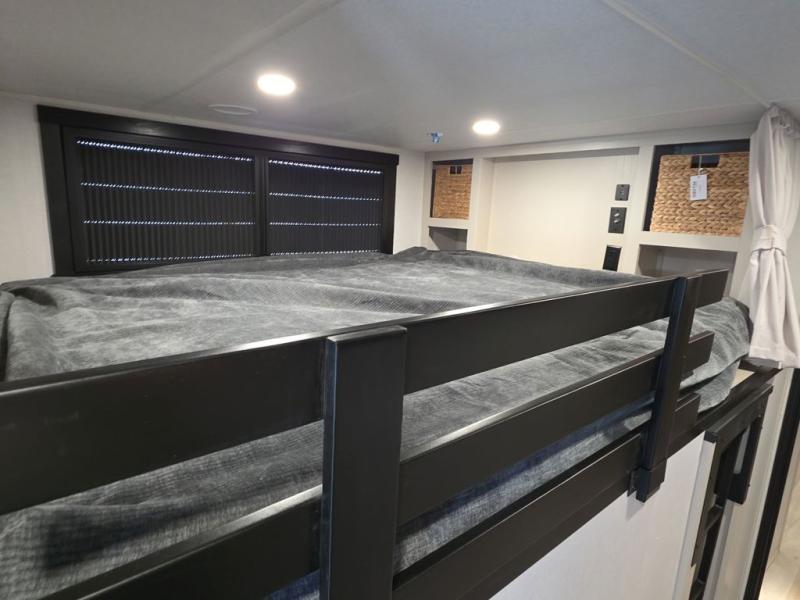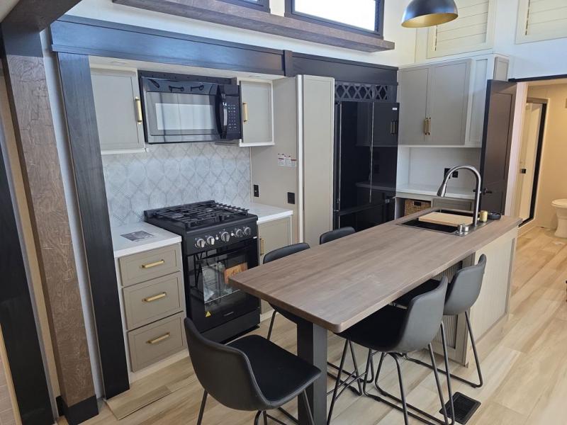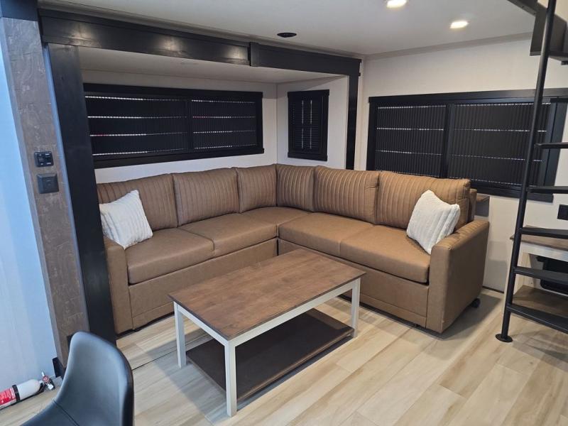 Introducing a new RV of its kind, the ROOST43 is a destination-style fifth wheel you are sure to love! There are two levels, making it feel more like home, and you can sleep six to eight each night. The master bedroom includes a custom king bed slide out, a 32" TV and fireplace, a desk/vanity, plus a half bath for convenience. A custom king-size bed is also found in the front loft, and there are storage cubbies plus a coax/110V outlet here to plug in chargers or a laptop. The second loft in the back includes spiral stairs, two bunk mats, a wardrobe, and cubby cubes here also for your guests' things. Some of the stand-out features you'll find on the first level are the sectional sofa with a coffee table, an entertainment center with a 65" TV, a kitchen island with five chairs, and a fully-equipped kitchen. The 20 cu. ft. 12V refrigerator and pull-out pantry will let you stock up on food, and the kitchen hutch will be perfect for nice dishes. The full bath on this model is one to remember; there is a one-piece fiberglass shower with a teak seat, a flip-up shelf and a washer/dryer, a backlit mirror, and more. And we haven't even touched on the exterior features, such as the pull-out tray, outdoor refrigerators, 20' awning, and more!