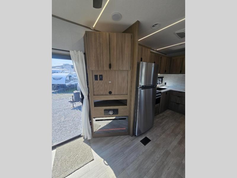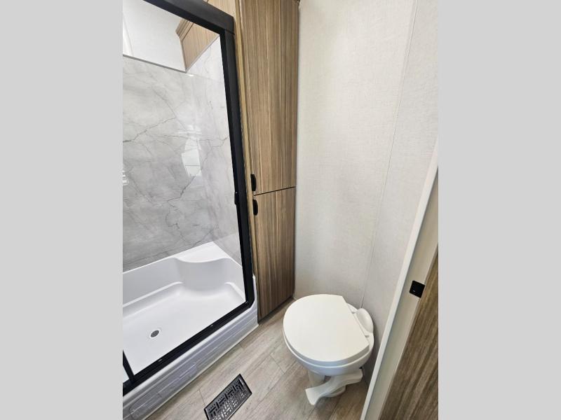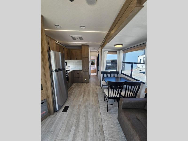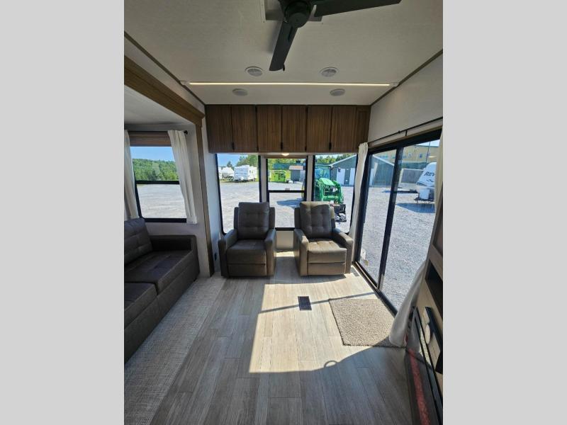 This park model weighs 9289lbs and features a very modern look, 2 slides, front living area with 2 recliners, sofa and fireplace, kitchen with free standing table and chairs bathroom with walk in shower, rear king bedroom with versa tilt bed, closet, and door to outside, central vac and so much more to see!