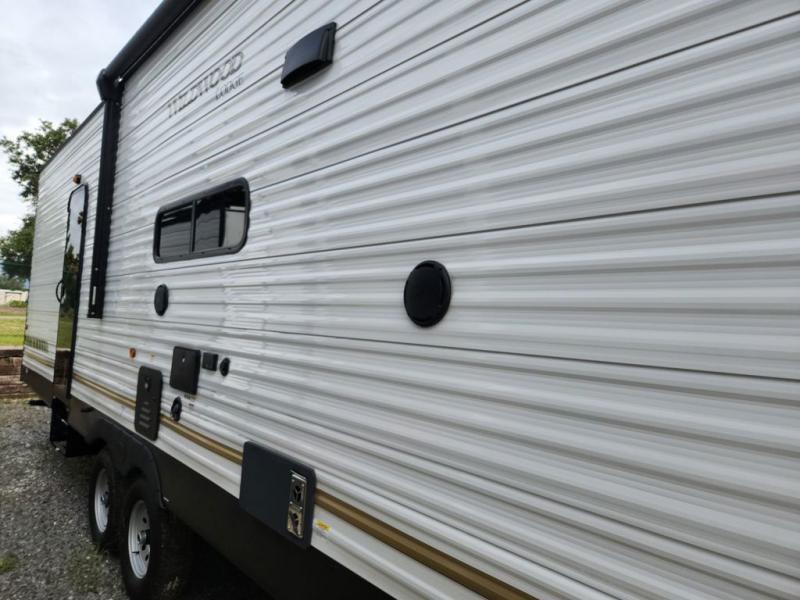 You just can't beat the Forest River Wildwood Lodge destination trailer! These trailers create the perfect camping destination in and of themselves. There is a new retro/metal redesign that is sure to turn heads at the campground, and the heated and enclosed Accessibelly provides added protection against the elements. Each model includes stainless steel kitchen appliances, a central vacuum with a sweep attachment, a Serta mattress, and kitchen backsplash to name a few comforts. Additional stand-out features include TFL cabinet doors, LED "Blade Lighting' under the awning, stylish roller shades, plus Lippert On-The-Go ladder prep for the option to add a ladder.