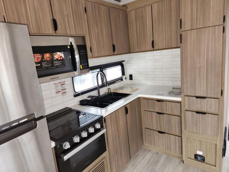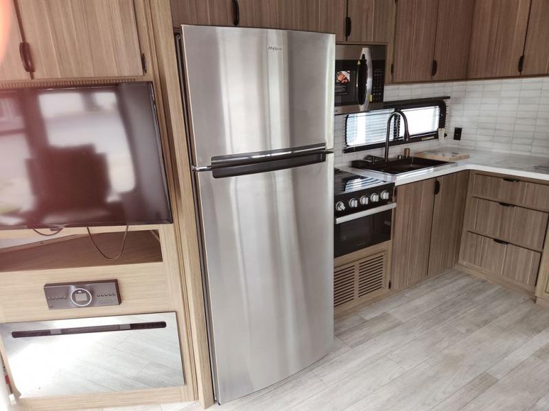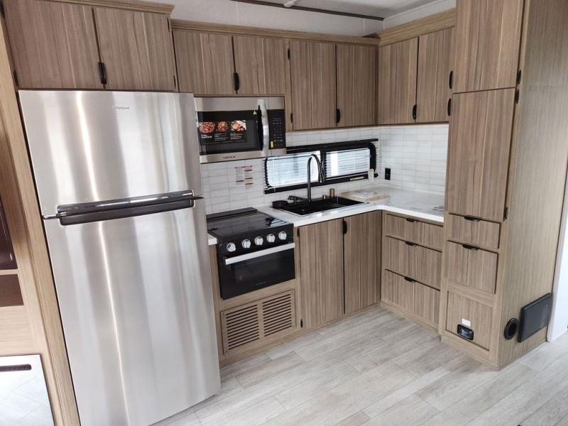 With plenty of space to stretch out and make memories, this Wildwood Lodge destination trailer is just what you need! The full bathroom is loaded with helpful amenities, like a walk-in shower and linen closet, and the bedroom is also filled with convenience as it contains a king bed with Versa-Tilt, a large closet, and the second exterior entry door. Out in the kitchen, you will find everything that you need to create family-style dinners, and the large slide is going to allow you to have plenty of space to work freely in the kitchen.