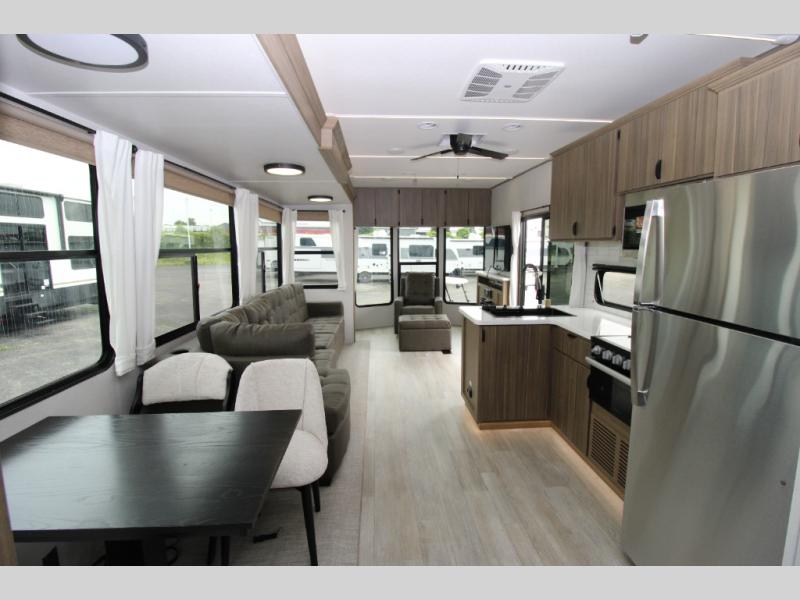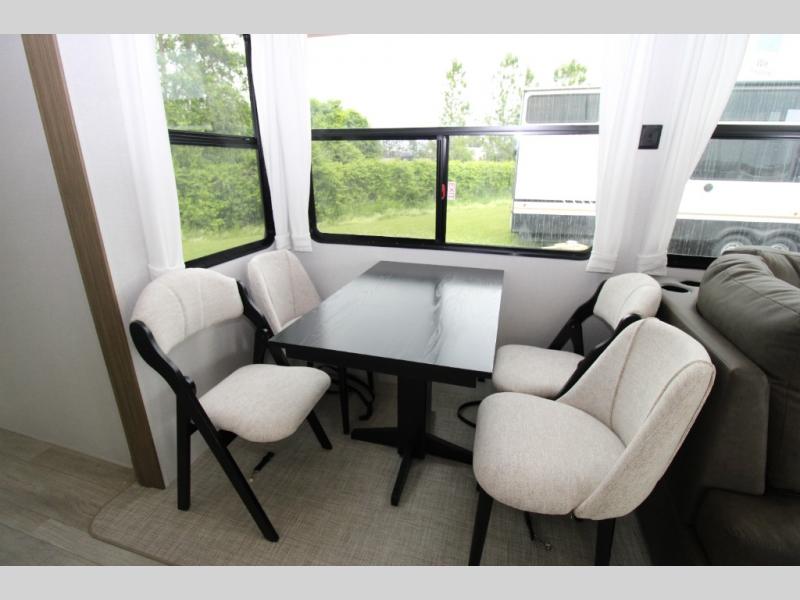 While you spend your afternoon relaxing on the L-shaped sofa or lounge chair in this Wildwood Lodge destination trailer, you can switch on the ceiling fan for an additional breeze. The free standing dinette is another great spot to sit down while you put together a puzzle or play a board game, and since the kitchen is also included in this space, you can work on dinner while still being a part of everyone else's activities. The bathroom is decked out with a walk-in shower and linen closet, and the private bedroom also has plenty of convenience with its king bed slide, closet with optional washer and dryer prep, and the second exterior entry door.