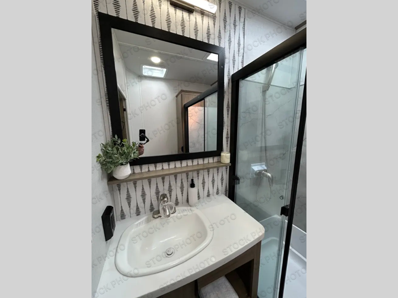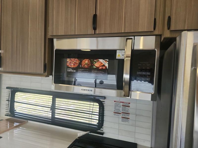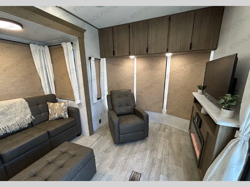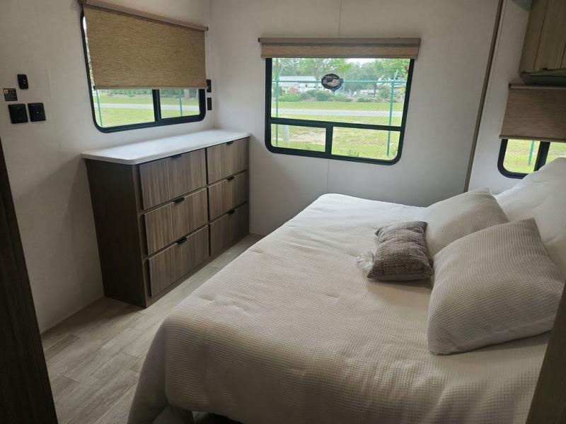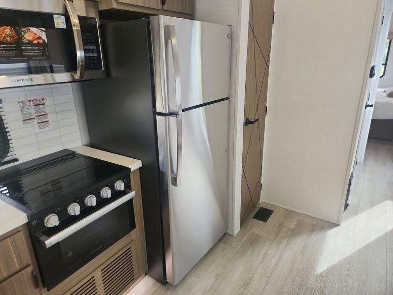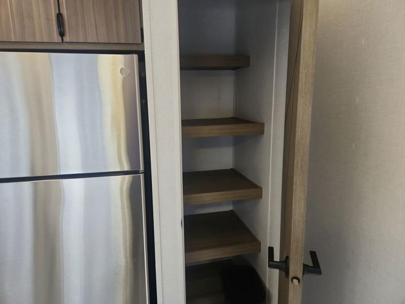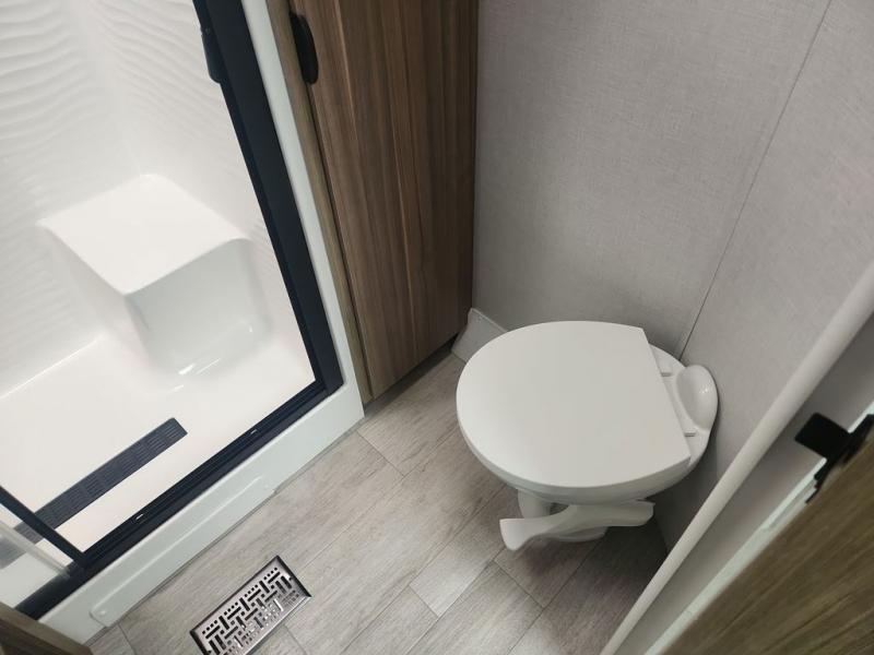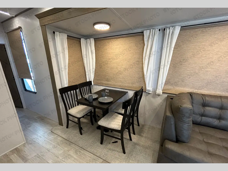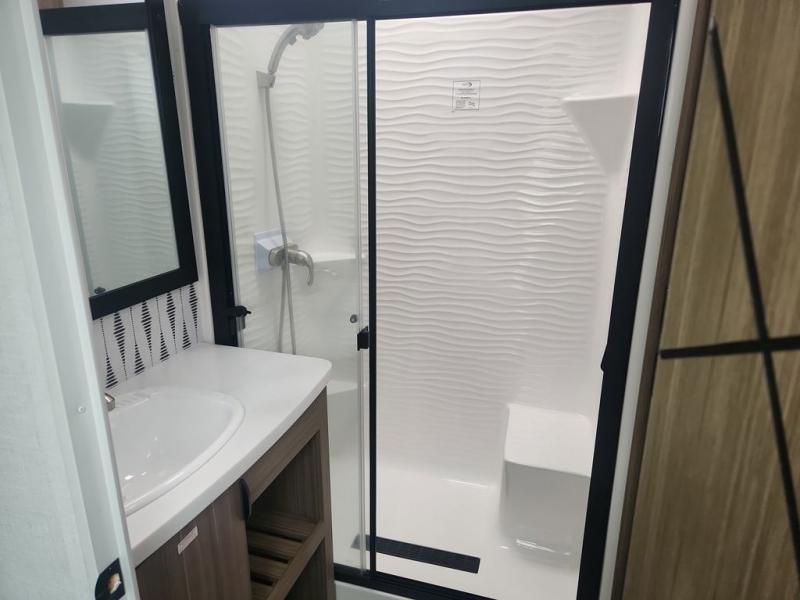 While you spend your afternoon relaxing on the L-shaped sofa or lounge chair in this Wildwood Lodge destination trailer, you can switch on the ceiling fan for an additional breeze. The free standing dinette is another great spot to sit down while you put together a puzzle or play a board game, and since the kitchen is also included in this space, you can work on dinner while still being a part of everyone else's activities. The bathroom is decked out with a walk-in shower and linen closet, and the private bedroom also has plenty of convenience with its king bed slide, closet with optional washer and dryer prep, and the second exterior entry door.