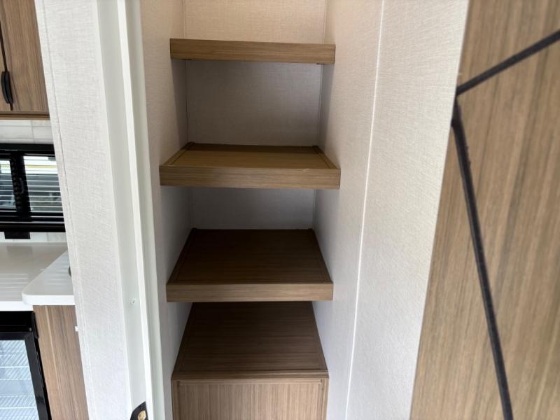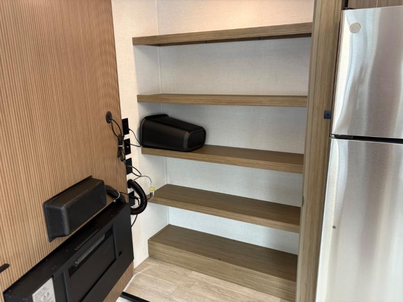 This Wildwood Lodge destination trailer is a wonderful replica of your home with its large bedroom up at the front, full bathroom with all of the amenities, a spacious living area with sofa and fireplace, and a decked-out kitchen with an island, wet bar, and walk-in pantry. The two entry doors make this trailer even more residential, and the bedroom has a closet that features the optional washer/dryer prep so that you can add more home-like conveniences if you like. The main living area has a ceiling fan which you can use to create a cool breeze, and the residential refrigerator is going to easily store all of your perishable items.
