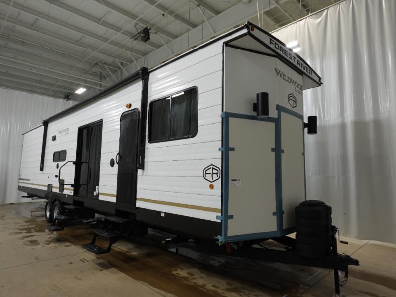 You just can't beat the Forest River Wildwood Lodge destination trailer! These trailers create the perfect camping destination in and of themselves. There is a new retro/metal redesign that is sure to turn heads at the campground, and the heated and enclosed Accessibelly provides added protection against the elements. Each model includes stainless steel kitchen appliances, a central vacuum with a sweep attachment, a Serta mattress, and kitchen backsplash to name a few comforts. Additional stand-out features include TFL cabinet doors, LED "Blade Lighting' under the awning, stylish roller shades, plus Lippert On-The-Go ladder prep for the option to add a ladder.