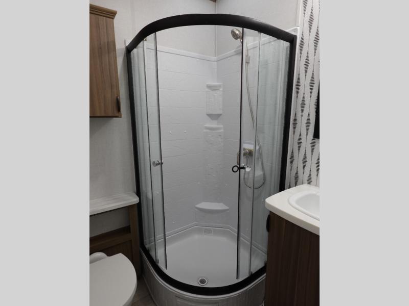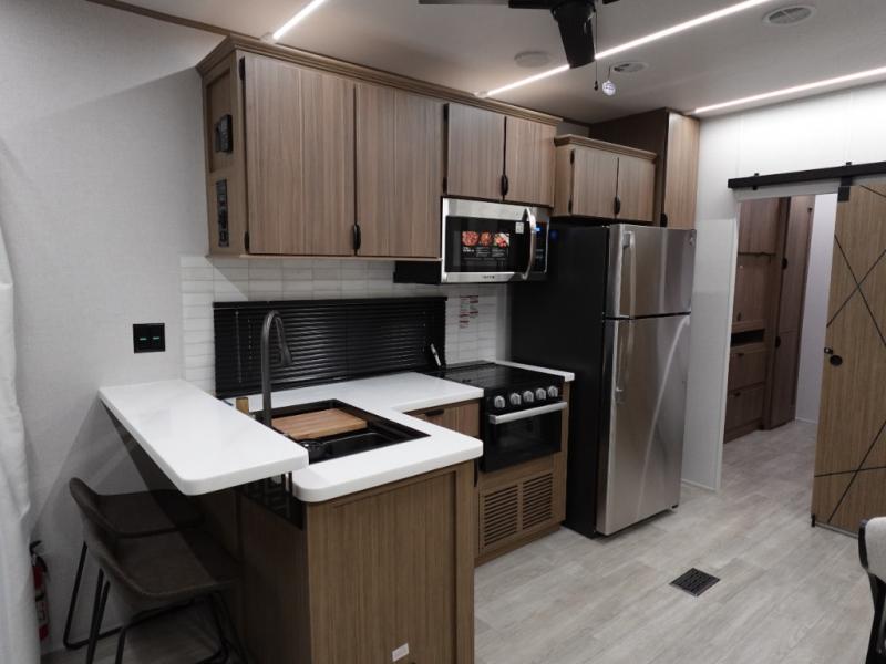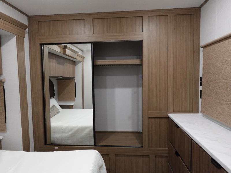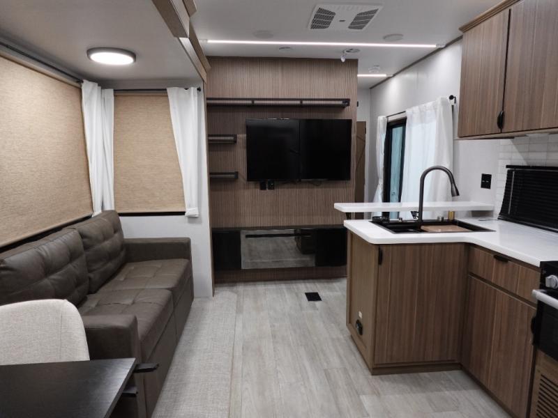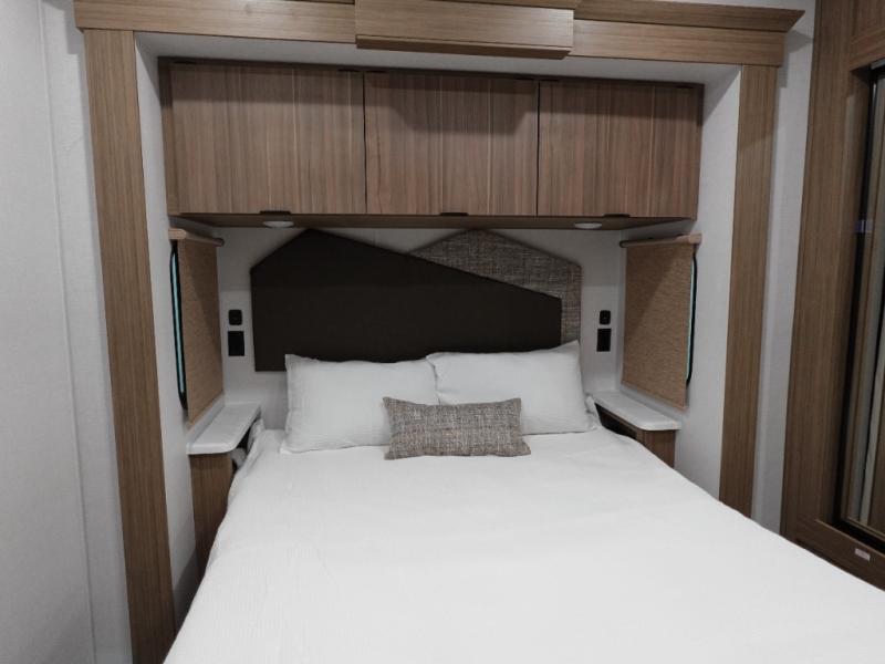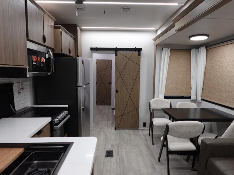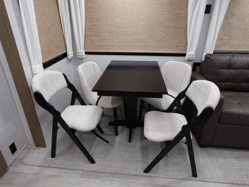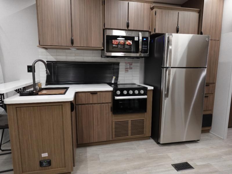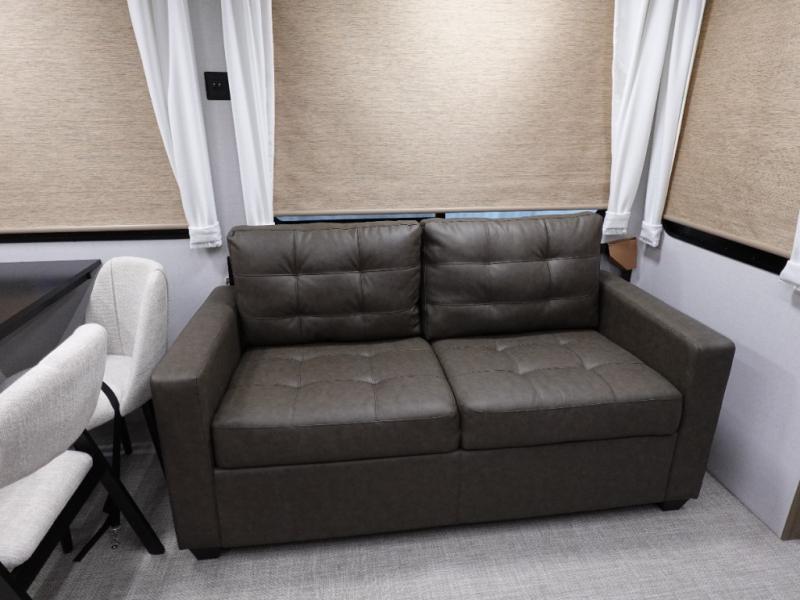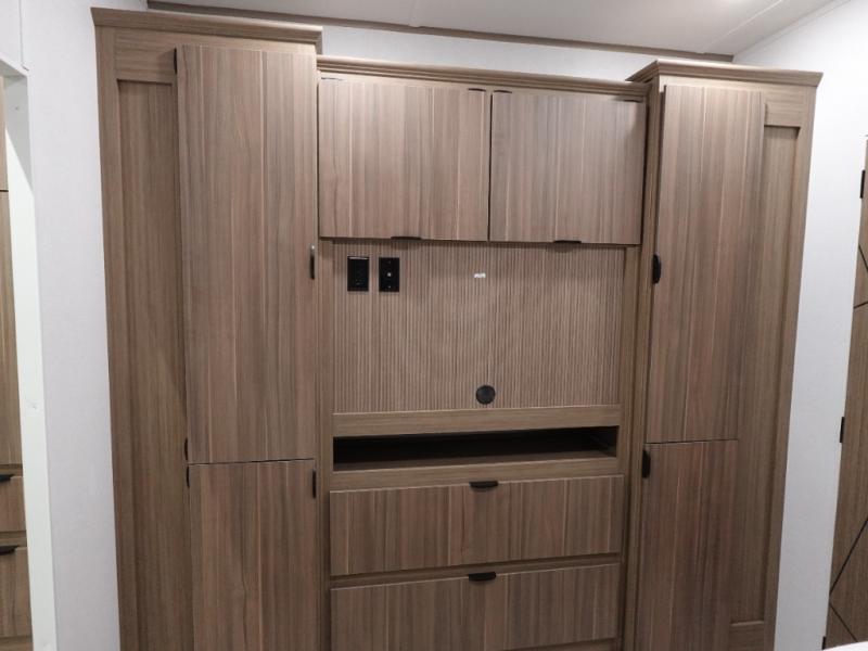 It will be so easy to enjoy extended camping trips in this spacious destination trailer. There are two bedrooms; one up front with a queen bed with Versa Tilt, a large wardrobe, and its own exterior entry door, plus one towards the back with a second queen bed with Versa Tilt and dual wardrobes. There is even a rear master bath here with its own exterior entry door; that makes three entry doors for convenience! Everyone can meet in the combined kitchen and living room that includes a large slide out with a sofa and table with chairs, plus a ceiling fan to keep fresh air moving.