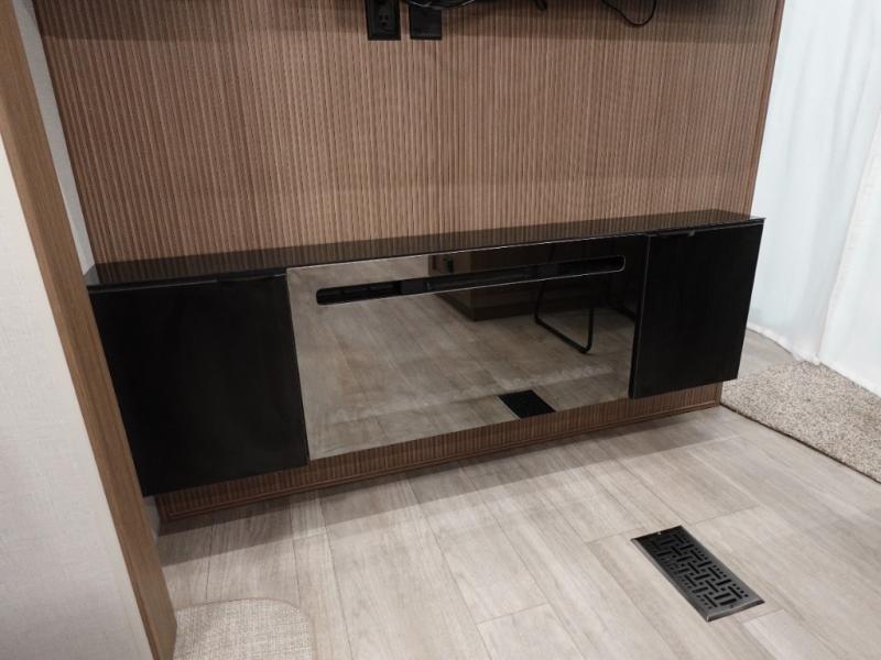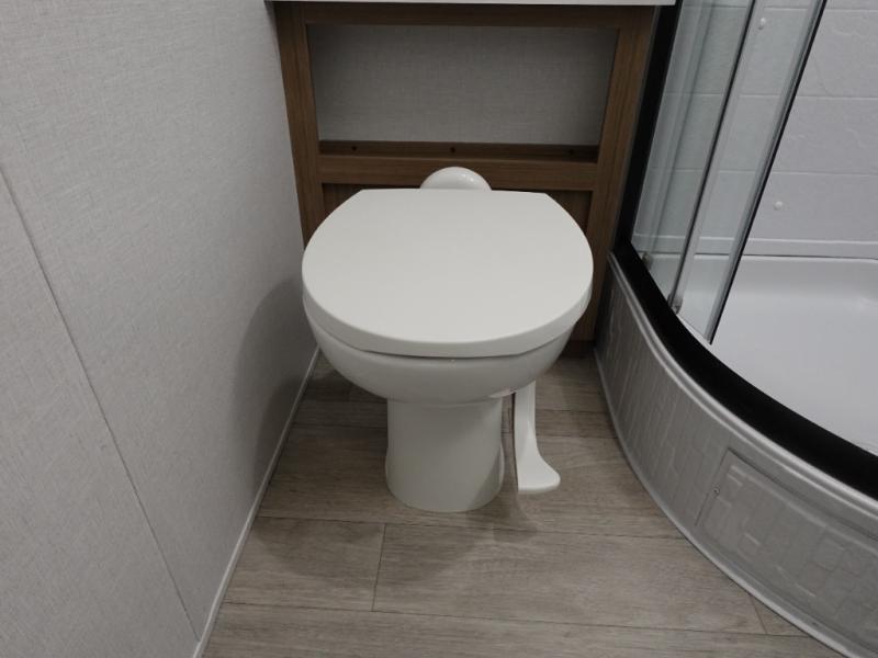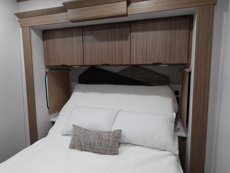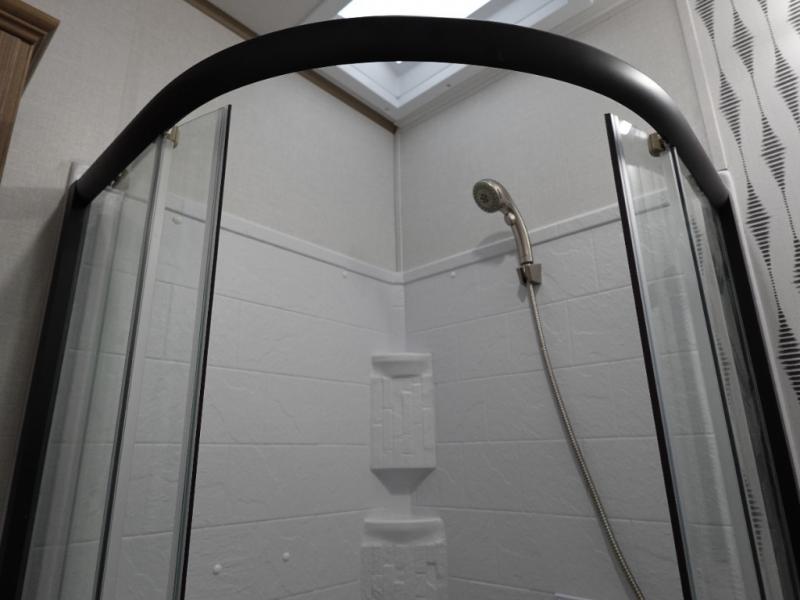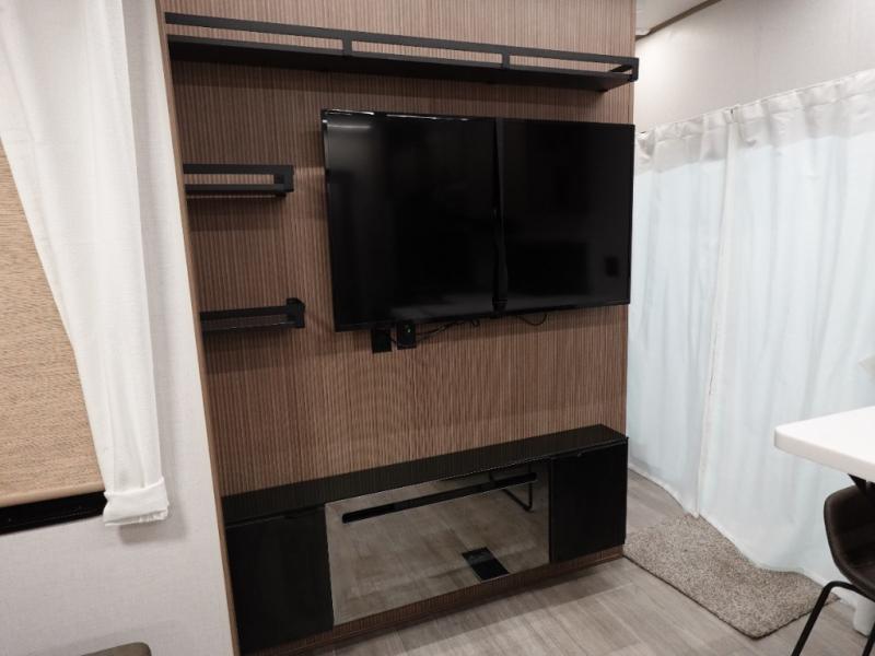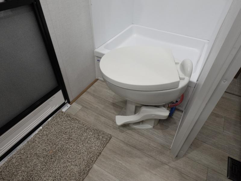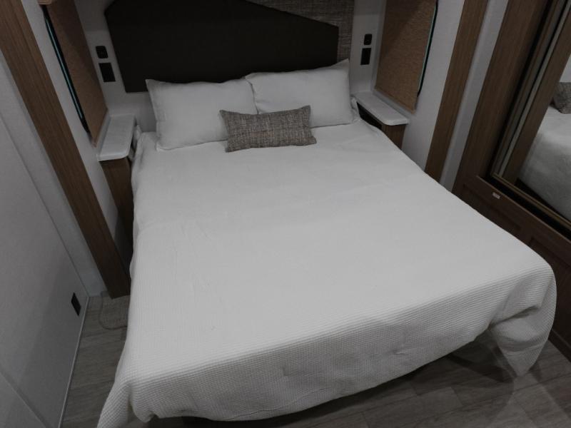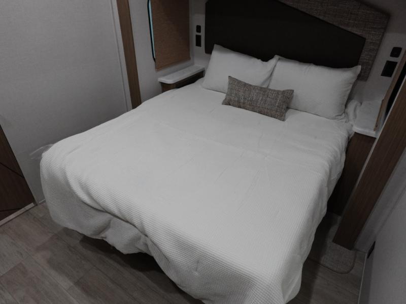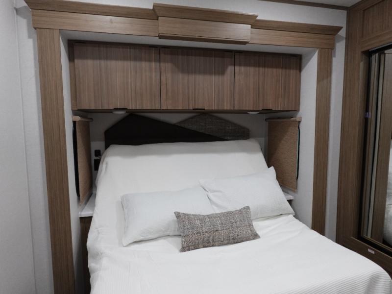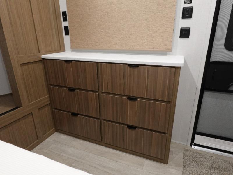 It will be so easy to enjoy extended camping trips in this spacious destination trailer. There are two bedrooms; one up front with a queen bed with Versa Tilt, a large wardrobe, and its own exterior entry door, plus one towards the back with a second queen bed with Versa Tilt and dual wardrobes. There is even a rear master bath here with its own exterior entry door; that makes three entry doors for convenience! Everyone can meet in the combined kitchen and living room that includes a large slide out with a sofa and table with chairs, plus a ceiling fan to keep fresh air moving.