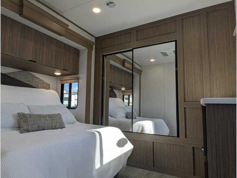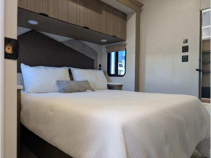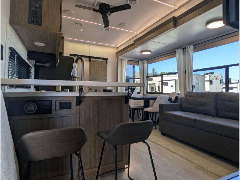 It will be so easy to enjoy extended camping trips in this spacious destination trailer. There are two bedrooms; one up front with a queen bed with Versa Tilt, a large wardrobe, and its own exterior entry door, plus one towards the back with a second queen bed with Versa Tilt and dual wardrobes. There is even a rear master bath here with its own exterior entry door; that makes three entry doors for convenience! Everyone can meet in the combined kitchen and living room that includes a large slide out with a sofa and table with chairs, plus a ceiling fan to keep fresh air moving. And the entertainment center with an optional 40" TV gives you the option to enjoy movie nights!