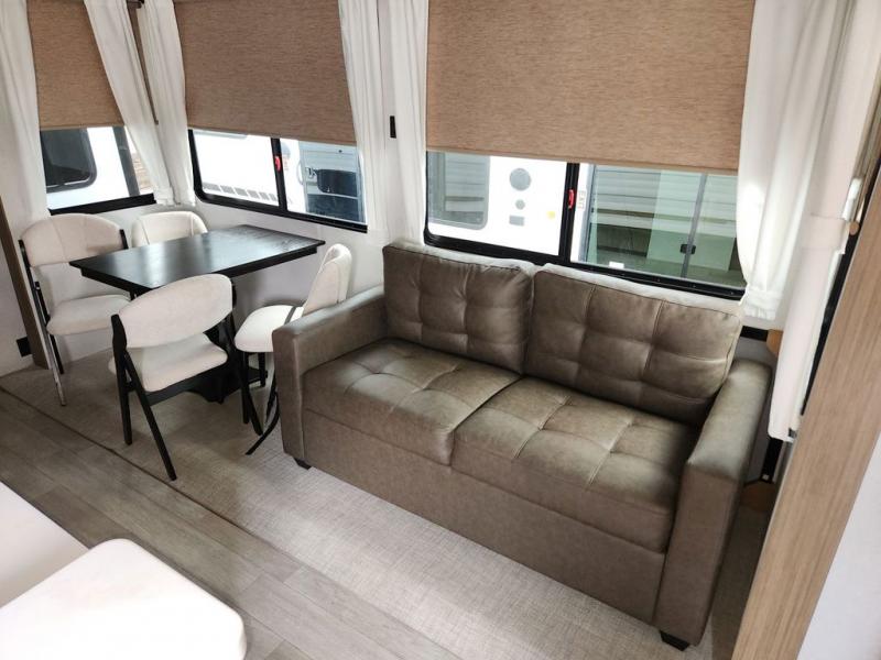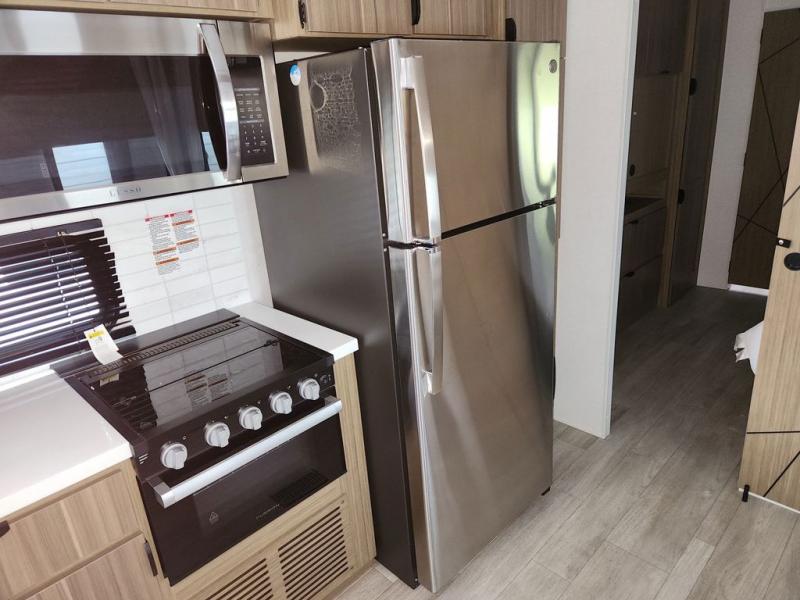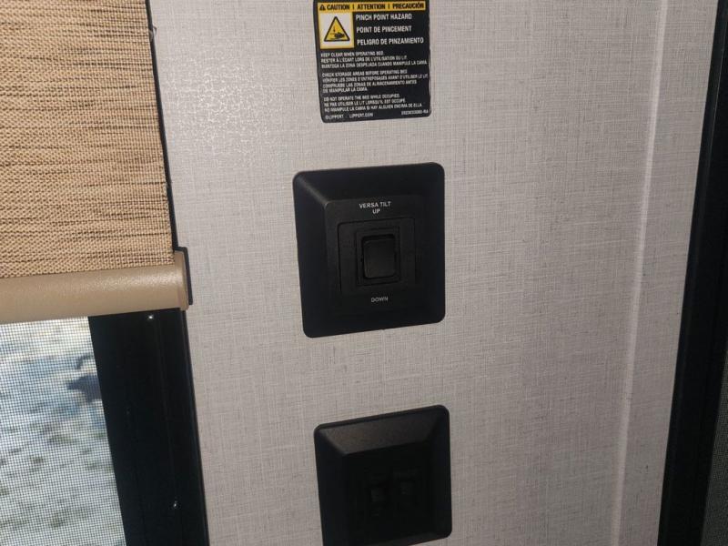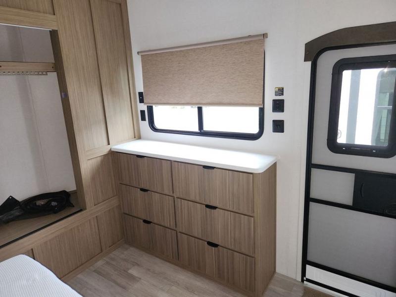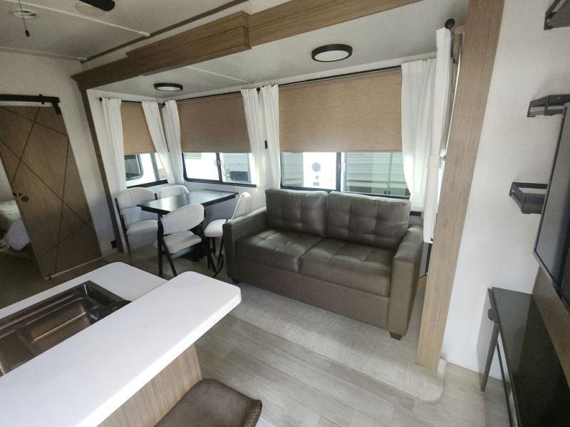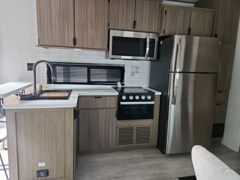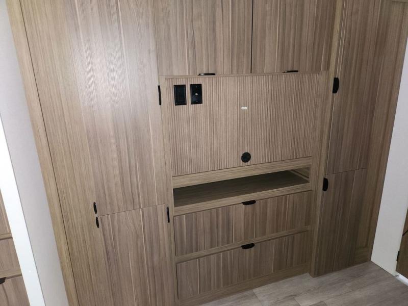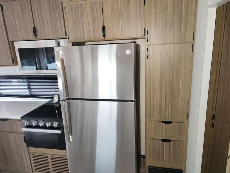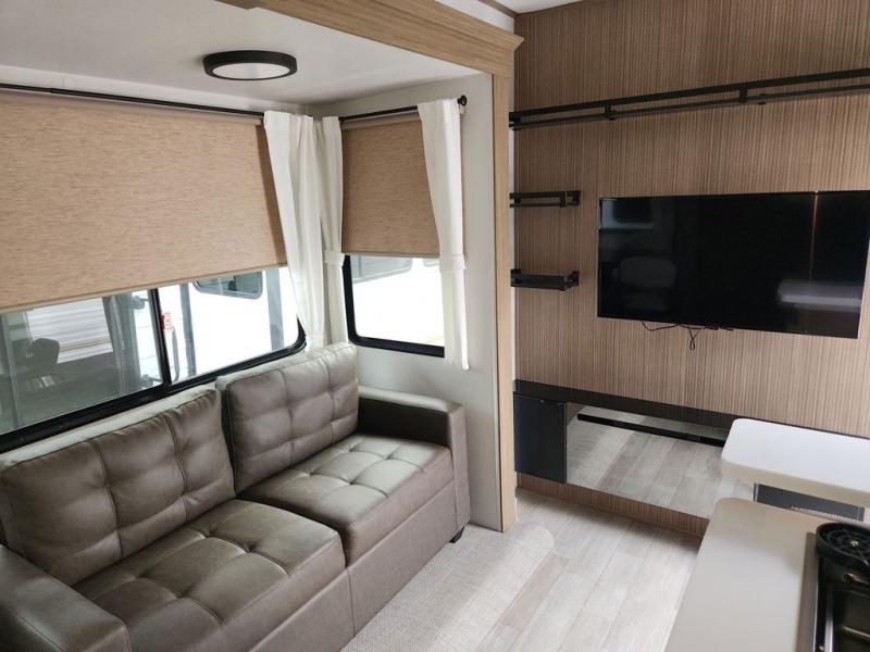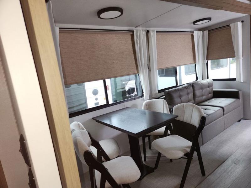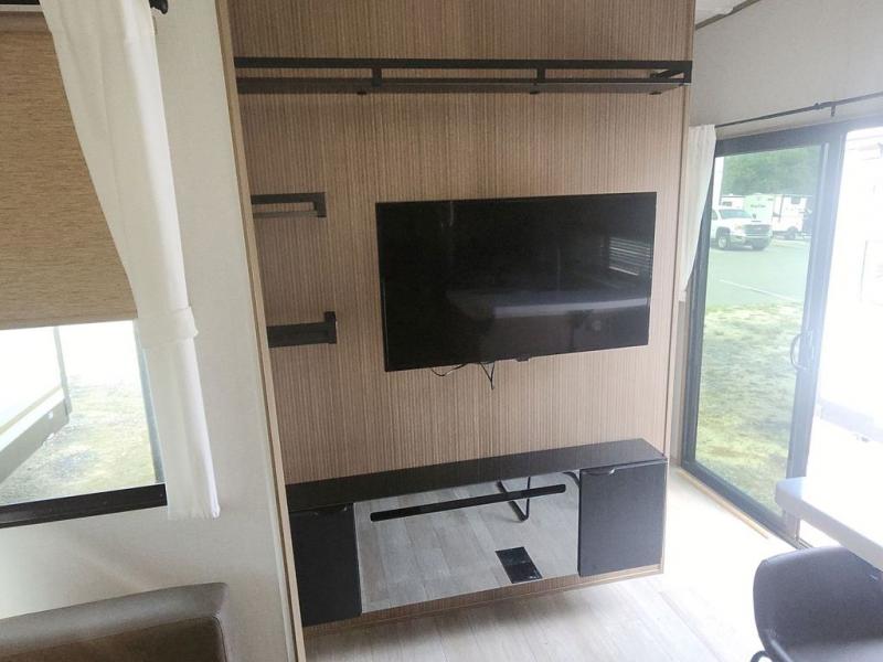 It will be so easy to enjoy extended camping trips in this spacious destination trailer. There are two bedrooms; one up front with a queen bed with Versa Tilt, a large wardrobe, and its own exterior entry door, plus one towards the back with a second queen bed with Versa Tilt and dual wardrobes. There is even a rear master bath here with its own exterior entry door; that makes three entry doors for convenience! Everyone can meet in the combined kitchen and living room that includes a large slide out with a sofa and table with chairs, plus a ceiling fan to keep fresh air moving. And the entertainment center with an optional 40" TV gives you the option to enjoy movie nights!