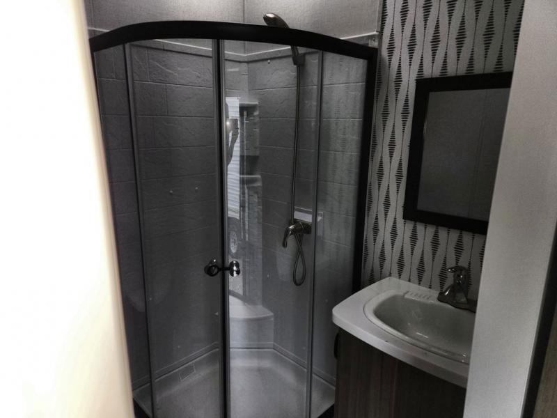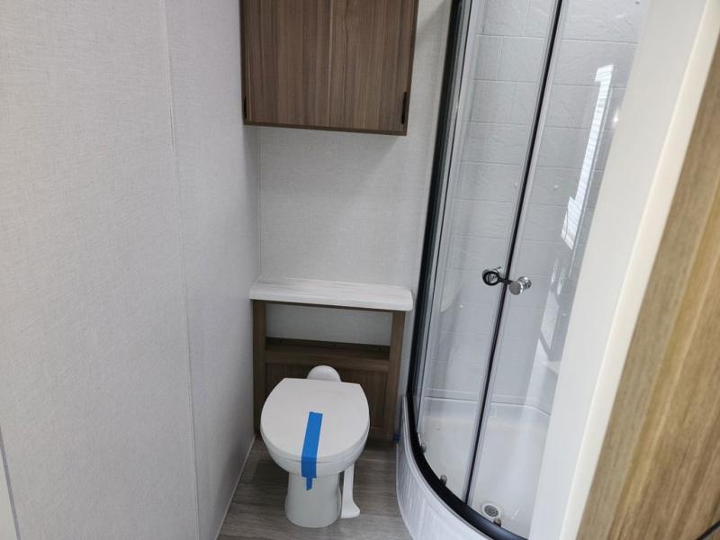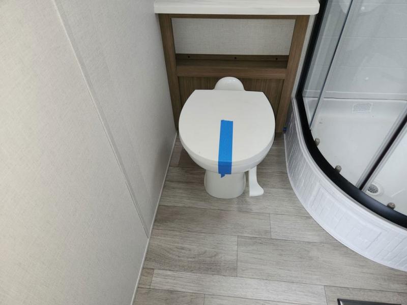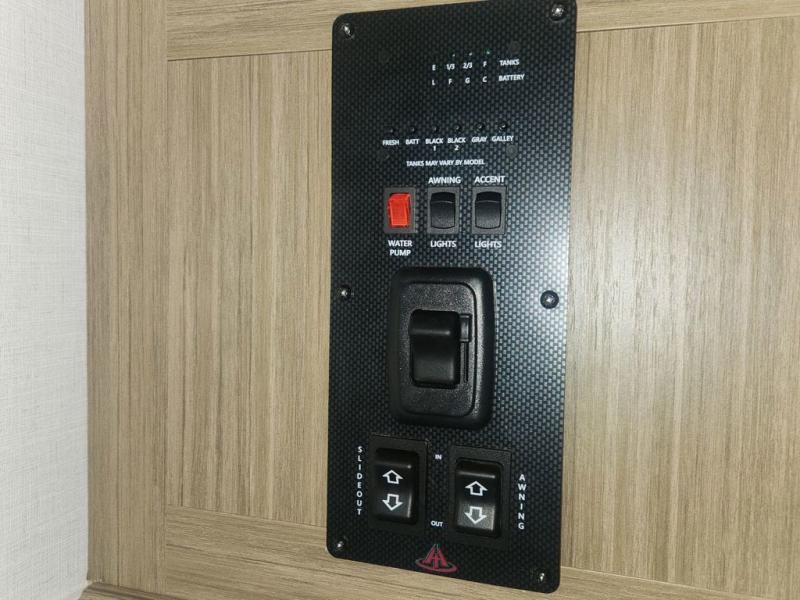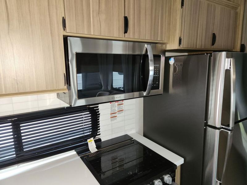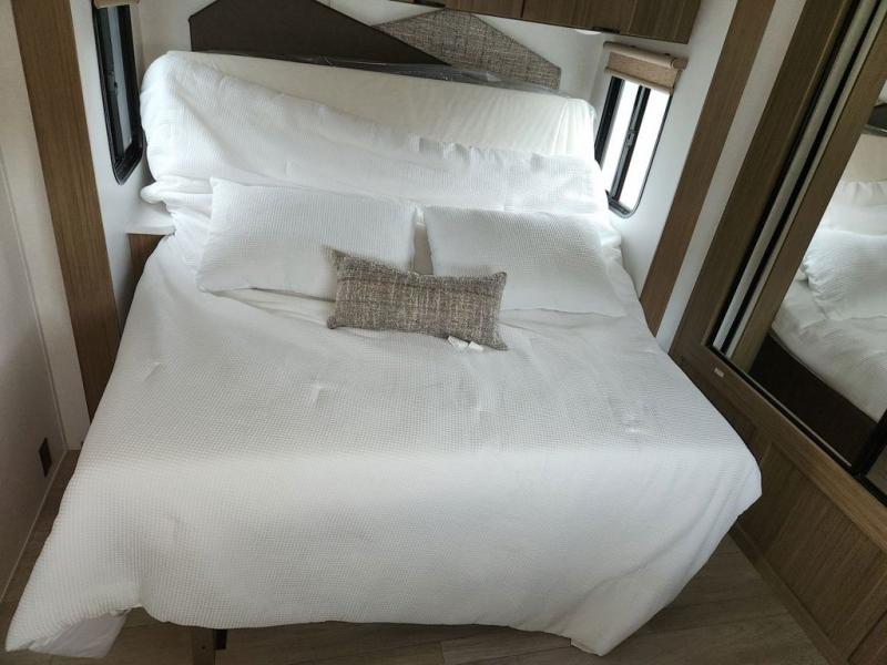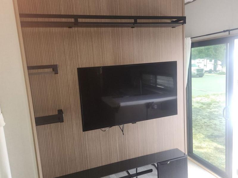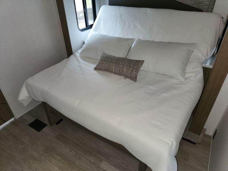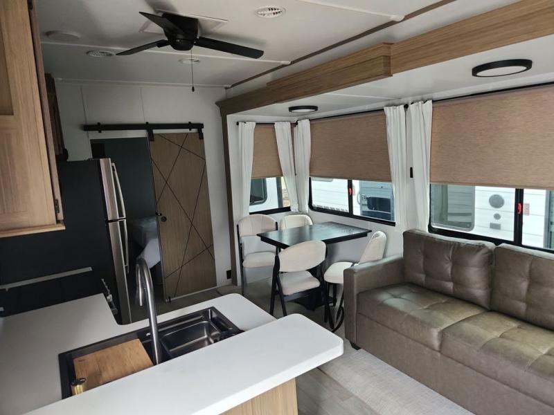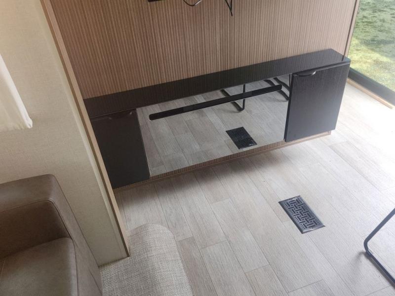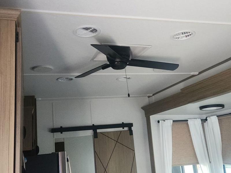 It will be so easy to enjoy extended camping trips in this spacious destination trailer. There are two bedrooms; one up front with a queen bed with Versa Tilt, a large wardrobe, and its own exterior entry door, plus one towards the back with a second queen bed with Versa Tilt and dual wardrobes. There is even a rear master bath here with its own exterior entry door; that makes three entry doors for convenience! Everyone can meet in the combined kitchen and living room that includes a large slide out with a sofa and table with chairs, plus a ceiling fan to keep fresh air moving. And the entertainment center with an optional 40" TV gives you the option to enjoy movie nights!