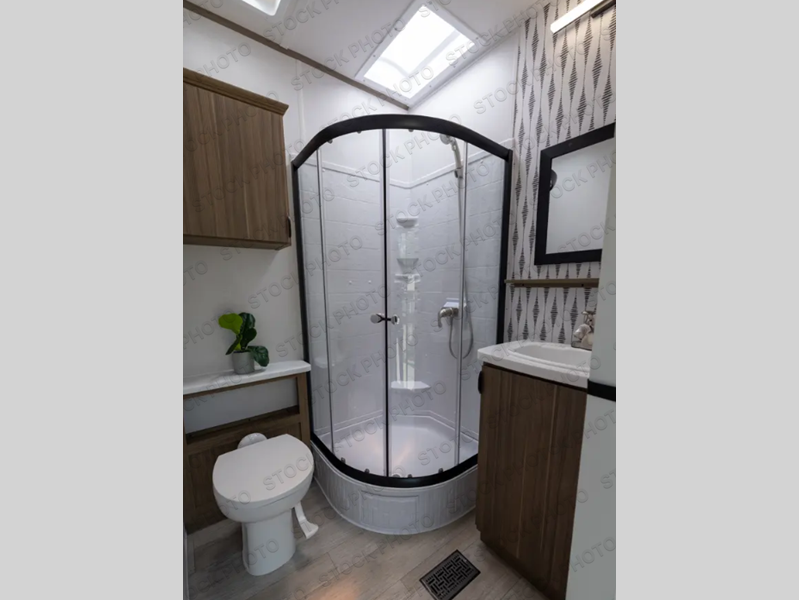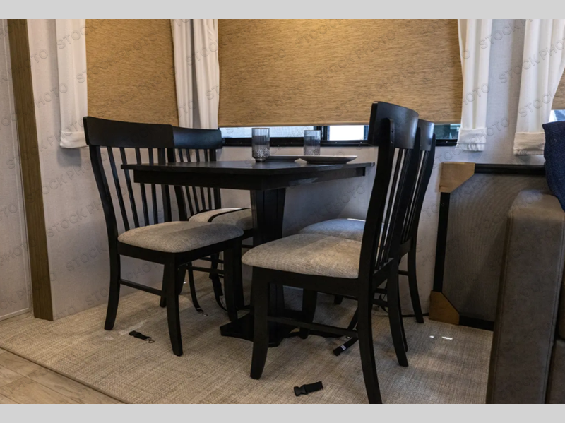 It will be so easy to enjoy extended camping trips in this spacious destination trailer. There are two bedrooms; one up front with a queen bed with Versa Tilt, a large wardrobe, and its own exterior entry door, plus one towards the back with a second queen bed with Versa Tilt and dual wardrobes. There is even a rear master bath here with its own exterior entry door; that makes three entry doors for convenience! Everyone can meet in the combined kitchen and living room that includes a large slide out with a sofa and table with chairs, plus a ceiling fan to keep fresh air moving. And the entertainment center with an optional 40" TV gives you the option to enjoy movie nights!