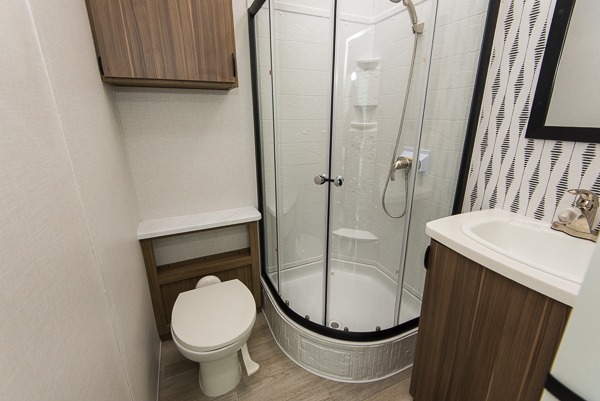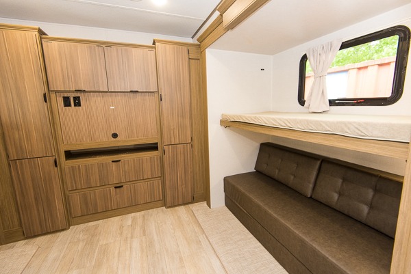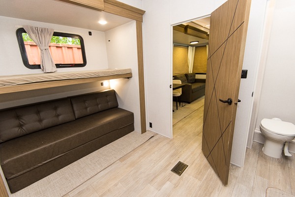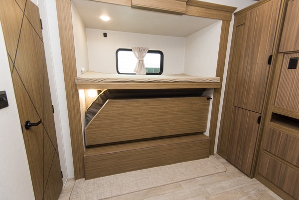 The spacious bunkhouse suite on this Wildwood Lodge destination trailer is going to be the ultimate attraction! Because of the opposing slides, there is plenty of room for your kids or guests to truly enjoy themselves, and the dual bunkhouse closets will provide lots of space for their belongings. There are three bunk beds and a Versa Queen bunk in this space, and the half bathroom is also attached to this bunkhouse. The main living area has a tri-fold sofa and free-standing table with chairs, plus a ceiling fan to help keep air moving. The entertainment center has a fireplace, and the kitchen has a residential refrigerator for storing lots of perishables.