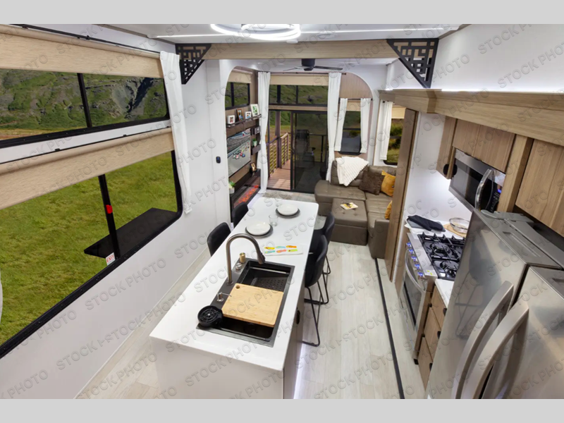 One look at this destination trailer and you'll be sold! The rear porch/veranda includes an outdoor kitchen with a cooktop and sink plus a ceiling fan so you can sit out back and visit with friends. The L-shaped sofa with an ottoman inside will provide cozy seating space, especially with the fireplace right across the room. Your crew can dine at the kitchen island with four chairs, and there is a large pantry where snacks can be kept for game night. When it's time to call it a night, the front private bedroom with a Versa-Tilt custom king bed is sure to bring comfort, and there is a dresser and wardrobe for your things. A third wardrobe includes washer and dryer prep if you choose to add those appliances. Any guests that aren't sleeping on the sofa can sleep in the loft with a queen bed, large front cabinet with shelves, and an additional cabinet for storage. You will also find a table with space below for your feet, so the kids can color, eat, and play games!